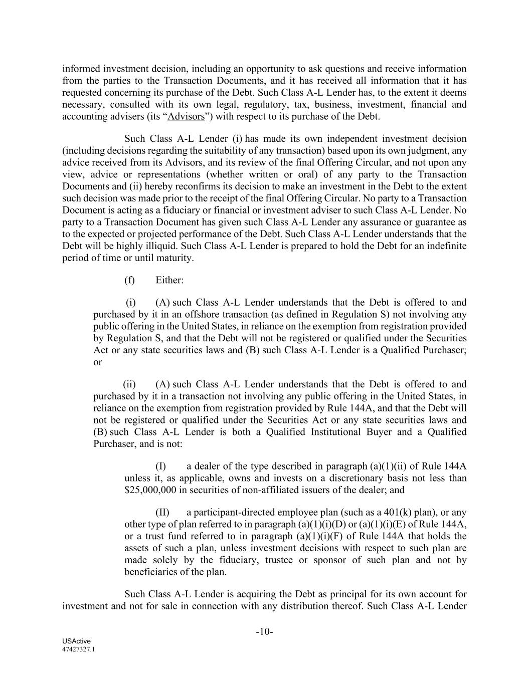 -10- USActive 47427327.1 informed investment decision, including an opportunity to ask questions and receive information from the parties to the Transaction Documents, and it has received all information that it has requested concerning its purchase of the Debt. Such Class A-L Lender has, to the extent it deems necessary, consulted with its own legal, regulatory, tax, business, investment, financial and accounting advisers (its “Advisors”) with respect to its purchase of the Debt. Such Class A-L Lender (i) has made its own independent investment decision (including decisions regarding the suitability of any transaction) based upon its own judgment, any advice received from its Advisors, and its review of the final Offering Circular, and not upon any view, advice or representations (whether written or oral) of any party to the Transaction Documents and (ii) hereby reconfirms its decision to make an investment in the Debt to the extent such decision was made prior to the receipt of the final Offering Circular. No party to a Transaction Document is acting as a fiduciary or financial or investment adviser to such Class A-L Lender. No party to a Transaction Document has given such Class A-L Lender any assurance or guarantee as to the expected or projected performance of the Debt. Such Class A-L Lender understands that the Debt will be highly illiquid. Such Class A-L Lender is prepared to hold the Debt for an indefinite period of time or until maturity. (f) Either: (i) (A) such Class A-L Lender understands that the Debt is offered to and purchased by it in an offshore transaction (as defined in Regulation S) not involving any public offering in the United States, in reliance on the exemption from registration provided by Regulation S, and that the Debt will not be registered or qualified under the Securities Act or any state securities laws and (B) such Class A-L Lender is a Qualified Purchaser; or (ii) (A) such Class A-L Lender understands that the Debt is offered to and purchased by it in a transaction not involving any public offering in the United States, in reliance on the exemption from registration provided by Rule 144A, and that the Debt will not be registered or qualified under the Securities Act or any state securities laws and (B) such Class A-L Lender is both a Qualified Institutional Buyer and a Qualified Purchaser, and is not: (I) a dealer of the type described in paragraph (a)(1)(ii) of Rule 144A unless it, as applicable, owns and invests on a discretionary basis not less than $25,000,000 in securities of non-affiliated issuers of the dealer; and (II) a participant-directed employee plan (such as a 401(k) plan), or any other type of plan referred to in paragraph (a)(1)(i)(D) or (a)(1)(i)(E) of Rule 144A, or a trust fund referred to in paragraph (a)(1)(i)(F) of Rule 144A that holds the assets of such a plan, unless investment decisions with respect to such plan are made solely by the fiduciary, trustee or sponsor of such plan and not by beneficiaries of the plan. Such Class A-L Lender is acquiring the Debt as principal for its own account for investment and not for sale in connection with any distribution thereof. Such Class A-L Lender