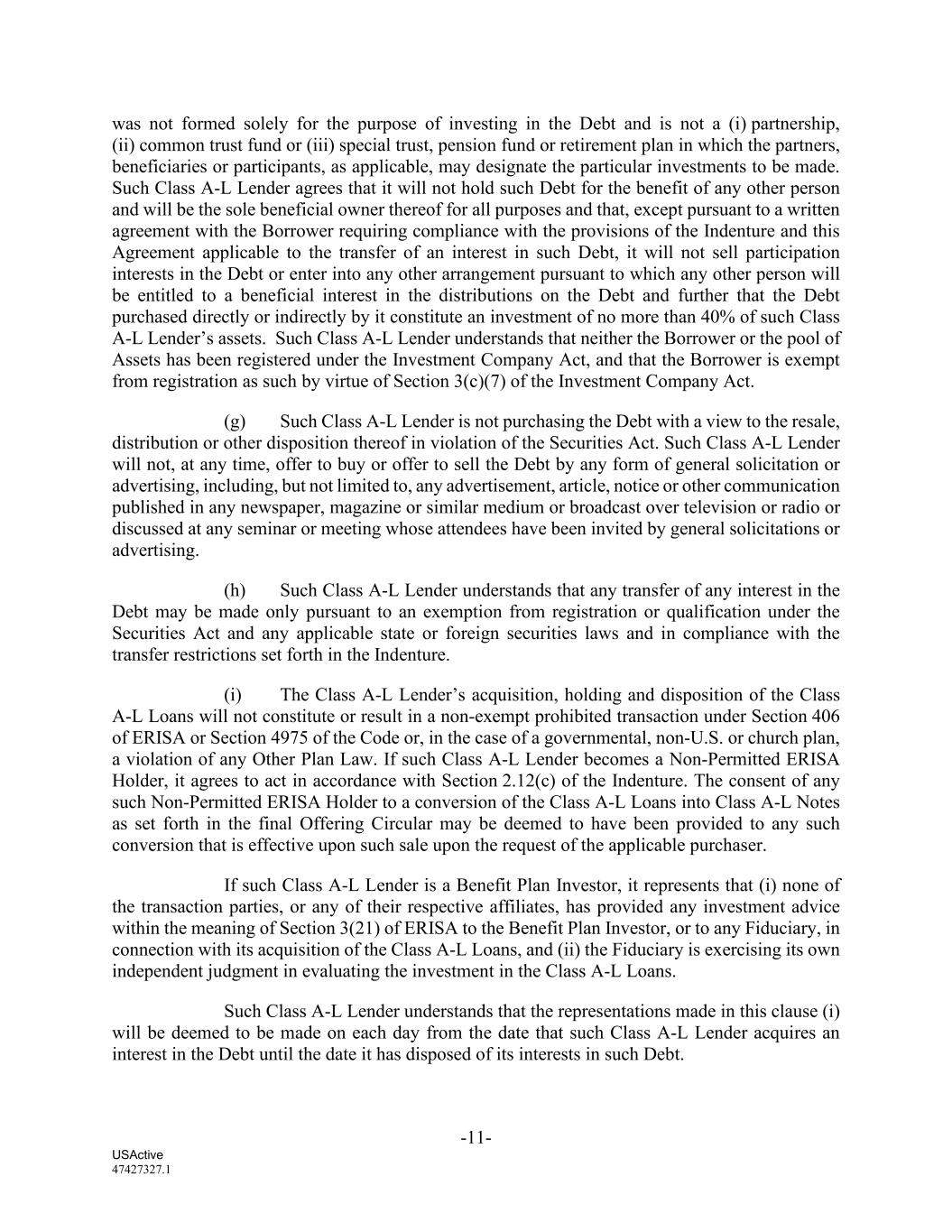 -11- USActive 47427327.1 was not formed solely for the purpose of investing in the Debt and is not a (i) partnership, (ii) common trust fund or (iii) special trust, pension fund or retirement plan in which the partners, beneficiaries or participants, as applicable, may designate the particular investments to be made. Such Class A-L Lender agrees that it will not hold such Debt for the benefit of any other person and will be the sole beneficial owner thereof for all purposes and that, except pursuant to a written agreement with the Borrower requiring compliance with the provisions of the Indenture and this Agreement applicable to the transfer of an interest in such Debt, it will not sell participation interests in the Debt or enter into any other arrangement pursuant to which any other person will be entitled to a beneficial interest in the distributions on the Debt and further that the Debt purchased directly or indirectly by it constitute an investment of no more than 40% of such Class A-L Lender’s assets. Such Class A-L Lender understands that neither the Borrower or the pool of Assets has been registered under the Investment Company Act, and that the Borrower is exempt from registration as such by virtue of Section 3(c)(7) of the Investment Company Act. (g) Such Class A-L Lender is not purchasing the Debt with a view to the resale, distribution or other disposition thereof in violation of the Securities Act. Such Class A-L Lender will not, at any time, offer to buy or offer to sell the Debt by any form of general solicitation or advertising, including, but not limited to, any advertisement, article, notice or other communication published in any newspaper, magazine or similar medium or broadcast over television or radio or discussed at any seminar or meeting whose attendees have been invited by general solicitations or advertising. (h) Such Class A-L Lender understands that any transfer of any interest in the Debt may be made only pursuant to an exemption from registration or qualification under the Securities Act and any applicable state or foreign securities laws and in compliance with the transfer restrictions set forth in the Indenture. (i) The Class A-L Lender’s acquisition, holding and disposition of the Class A-L Loans will not constitute or result in a non-exempt prohibited transaction under Section 406 of ERISA or Section 4975 of the Code or, in the case of a governmental, non-U.S. or church plan, a violation of any Other Plan Law. If such Class A-L Lender becomes a Non-Permitted ERISA Holder, it agrees to act in accordance with Section 2.12(c) of the Indenture. The consent of any such Non-Permitted ERISA Holder to a conversion of the Class A-L Loans into Class A-L Notes as set forth in the final Offering Circular may be deemed to have been provided to any such conversion that is effective upon such sale upon the request of the applicable purchaser. If such Class A-L Lender is a Benefit Plan Investor, it represents that (i) none of the transaction parties, or any of their respective affiliates, has provided any investment advice within the meaning of Section 3(21) of ERISA to the Benefit Plan Investor, or to any Fiduciary, in connection with its acquisition of the Class A-L Loans, and (ii) the Fiduciary is exercising its own independent judgment in evaluating the investment in the Class A-L Loans. Such Class A-L Lender understands that the representations made in this clause (i) will be deemed to be made on each day from the date that such Class A-L Lender acquires an interest in the Debt until the date it has disposed of its interests in such Debt.