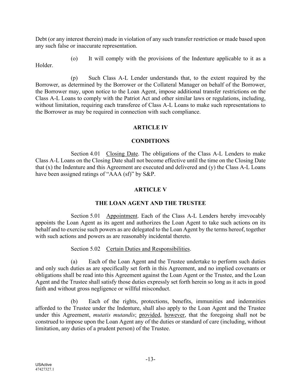 -13- USActive 47427327.1 Debt (or any interest therein) made in violation of any such transfer restriction or made based upon any such false or inaccurate representation. (o) It will comply with the provisions of the Indenture applicable to it as a Holder. (p) Such Class A-L Lender understands that, to the extent required by the Borrower, as determined by the Borrower or the Collateral Manager on behalf of the Borrower, the Borrower may, upon notice to the Loan Agent, impose additional transfer restrictions on the Class A-L Loans to comply with the Patriot Act and other similar laws or regulations, including, without limitation, requiring each transferee of Class A-L Loans to make such representations to the Borrower as may be required in connection with such compliance. ARTICLE IV CONDITIONS Section 4.01 Closing Date. The obligations of the Class A-L Lenders to make Class A-L Loans on the Closing Date shall not become effective until the time on the Closing Date that (x) the Indenture and this Agreement are executed and delivered and (y) the Class A-L Loans have been assigned ratings of “AAA (sf)” by S&P. ARTICLE V THE LOAN AGENT AND THE TRUSTEE Section 5.01 Appointment. Each of the Class A-L Lenders hereby irrevocably appoints the Loan Agent as its agent and authorizes the Loan Agent to take such actions on its behalf and to exercise such powers as are delegated to the Loan Agent by the terms hereof, together with such actions and powers as are reasonably incidental thereto. Section 5.02 Certain Duties and Responsibilities. (a) Each of the Loan Agent and the Trustee undertake to perform such duties and only such duties as are specifically set forth in this Agreement, and no implied covenants or obligations shall be read into this Agreement against the Loan Agent or the Trustee, and the Loan Agent and the Trustee shall satisfy those duties expressly set forth herein so long as it acts in good faith and without gross negligence or willful misconduct. (b) Each of the rights, protections, benefits, immunities and indemnities afforded to the Trustee under the Indenture, shall also apply to the Loan Agent and the Trustee under this Agreement, mutatis mutandis; provided, however, that the foregoing shall not be construed to impose upon the Loan Agent any of the duties or standard of care (including, without limitation, any duties of a prudent person) of the Trustee.