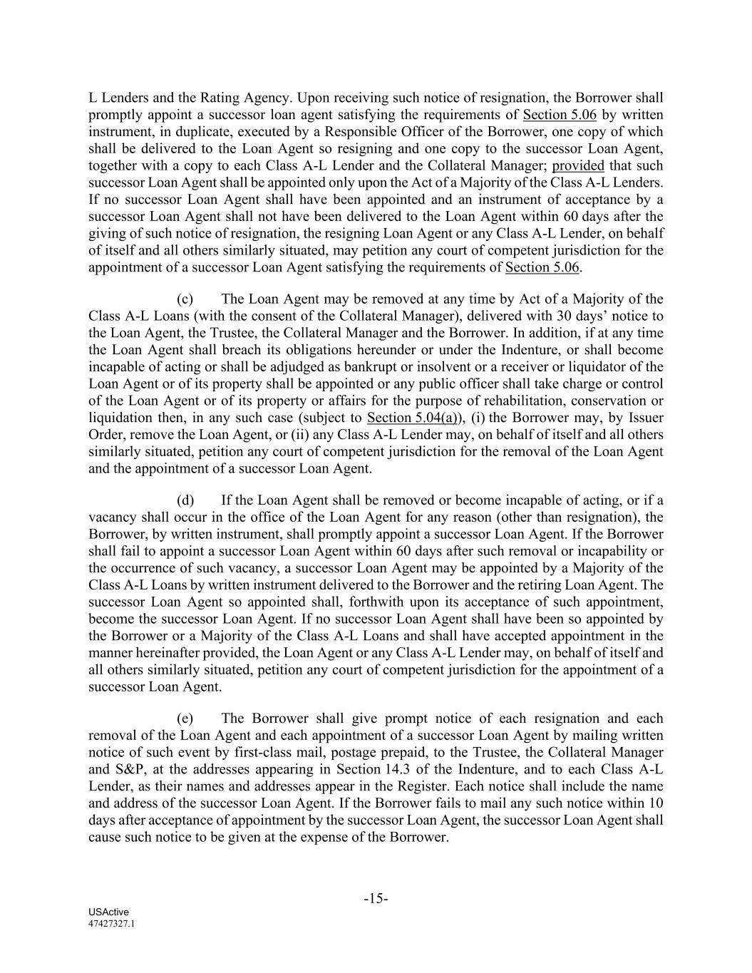 -15- USActive 47427327.1 L Lenders and the Rating Agency. Upon receiving such notice of resignation, the Borrower shall promptly appoint a successor loan agent satisfying the requirements of Section 5.06 by written instrument, in duplicate, executed by a Responsible Officer of the Borrower, one copy of which shall be delivered to the Loan Agent so resigning and one copy to the successor Loan Agent, together with a copy to each Class A-L Lender and the Collateral Manager; provided that such successor Loan Agent shall be appointed only upon the Act of a Majority of the Class A-L Lenders. If no successor Loan Agent shall have been appointed and an instrument of acceptance by a successor Loan Agent shall not have been delivered to the Loan Agent within 60 days after the giving of such notice of resignation, the resigning Loan Agent or any Class A-L Lender, on behalf of itself and all others similarly situated, may petition any court of competent jurisdiction for the appointment of a successor Loan Agent satisfying the requirements of Section 5.06. (c) The Loan Agent may be removed at any time by Act of a Majority of the Class A-L Loans (with the consent of the Collateral Manager), delivered with 30 days’ notice to the Loan Agent, the Trustee, the Collateral Manager and the Borrower. In addition, if at any time the Loan Agent shall breach its obligations hereunder or under the Indenture, or shall become incapable of acting or shall be adjudged as bankrupt or insolvent or a receiver or liquidator of the Loan Agent or of its property shall be appointed or any public officer shall take charge or control of the Loan Agent or of its property or affairs for the purpose of rehabilitation, conservation or liquidation then, in any such case (subject to Section 5.04(a)), (i) the Borrower may, by Issuer Order, remove the Loan Agent, or (ii) any Class A-L Lender may, on behalf of itself and all others similarly situated, petition any court of competent jurisdiction for the removal of the Loan Agent and the appointment of a successor Loan Agent. (d) If the Loan Agent shall be removed or become incapable of acting, or if a vacancy shall occur in the office of the Loan Agent for any reason (other than resignation), the Borrower, by written instrument, shall promptly appoint a successor Loan Agent. If the Borrower shall fail to appoint a successor Loan Agent within 60 days after such removal or incapability or the occurrence of such vacancy, a successor Loan Agent may be appointed by a Majority of the Class A-L Loans by written instrument delivered to the Borrower and the retiring Loan Agent. The successor Loan Agent so appointed shall, forthwith upon its acceptance of such appointment, become the successor Loan Agent. If no successor Loan Agent shall have been so appointed by the Borrower or a Majority of the Class A-L Loans and shall have accepted appointment in the manner hereinafter provided, the Loan Agent or any Class A-L Lender may, on behalf of itself and all others similarly situated, petition any court of competent jurisdiction for the appointment of a successor Loan Agent. (e) The Borrower shall give prompt notice of each resignation and each removal of the Loan Agent and each appointment of a successor Loan Agent by mailing written notice of such event by first-class mail, postage prepaid, to the Trustee, the Collateral Manager and S&P, at the addresses appearing in Section 14.3 of the Indenture, and to each Class A-L Lender, as their names and addresses appear in the Register. Each notice shall include the name and address of the successor Loan Agent. If the Borrower fails to mail any such notice within 10 days after acceptance of appointment by the successor Loan Agent, the successor Loan Agent shall cause such notice to be given at the expense of the Borrower.