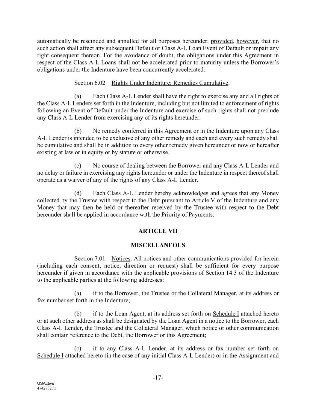 -17- USActive 47427327.1 automatically be rescinded and annulled for all purposes hereunder; provided, however, that no such action shall affect any subsequent Default or Class A-L Loan Event of Default or impair any right consequent thereon. For the avoidance of doubt, the obligations under this Agreement in respect of the Class A-L Loans shall not be accelerated prior to maturity unless the Borrower’s obligations under the Indenture have been concurrently accelerated. Section 6.02 Rights Under Indenture; Remedies Cumulative. (a) Each Class A-L Lender shall have the right to exercise any and all rights of the Class A-L Lenders set forth in the Indenture, including but not limited to enforcement of rights following an Event of Default under the Indenture and exercise of such rights shall not preclude any Class A-L Lender from exercising any of its rights hereunder. (b) No remedy conferred in this Agreement or in the Indenture upon any Class A-L Lender is intended to be exclusive of any other remedy and each and every such remedy shall be cumulative and shall be in addition to every other remedy given hereunder or now or hereafter existing at law or in equity or by statute or otherwise. (c) No course of dealing between the Borrower and any Class A-L Lender and no delay or failure in exercising any rights hereunder or under the Indenture in respect thereof shall operate as a waiver of any of the rights of any Class A-L Lender. (d) Each Class A-L Lender hereby acknowledges and agrees that any Money collected by the Trustee with respect to the Debt pursuant to Article V of the Indenture and any Money that may then be held or thereafter received by the Trustee with respect to the Debt hereunder shall be applied in accordance with the Priority of Payments. ARTICLE VII MISCELLANEOUS Section 7.01 Notices. All notices and other communications provided for herein (including each consent, notice, direction or request) shall be sufficient for every purpose hereunder if given in accordance with the applicable provisions of Section 14.3 of the Indenture to the applicable parties at the following addresses: (a) if to the Borrower, the Trustee or the Collateral Manager, at its address or fax number set forth in the Indenture; (b) if to the Loan Agent, at its address set forth on Schedule I attached hereto or at such other address as shall be designated by the Loan Agent in a notice to the Borrower, each Class A-L Lender, the Trustee and the Collateral Manager, which notice or other communication shall contain reference to the Debt, the Borrower or this Agreement; (c) if to any Class A-L Lender, at its address or fax number set forth on Schedule I attached hereto (in the case of any initial Class A-L Lender) or in the Assignment and