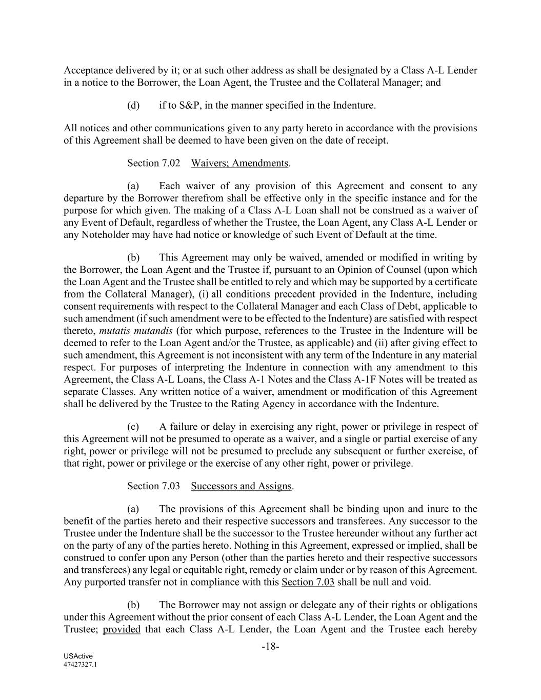 -18- USActive 47427327.1 Acceptance delivered by it; or at such other address as shall be designated by a Class A-L Lender in a notice to the Borrower, the Loan Agent, the Trustee and the Collateral Manager; and (d) if to S&P, in the manner specified in the Indenture. All notices and other communications given to any party hereto in accordance with the provisions of this Agreement shall be deemed to have been given on the date of receipt. Section 7.02 Waivers; Amendments. (a) Each waiver of any provision of this Agreement and consent to any departure by the Borrower therefrom shall be effective only in the specific instance and for the purpose for which given. The making of a Class A-L Loan shall not be construed as a waiver of any Event of Default, regardless of whether the Trustee, the Loan Agent, any Class A-L Lender or any Noteholder may have had notice or knowledge of such Event of Default at the time. (b) This Agreement may only be waived, amended or modified in writing by the Borrower, the Loan Agent and the Trustee if, pursuant to an Opinion of Counsel (upon which the Loan Agent and the Trustee shall be entitled to rely and which may be supported by a certificate from the Collateral Manager), (i) all conditions precedent provided in the Indenture, including consent requirements with respect to the Collateral Manager and each Class of Debt, applicable to such amendment (if such amendment were to be effected to the Indenture) are satisfied with respect thereto, mutatis mutandis (for which purpose, references to the Trustee in the Indenture will be deemed to refer to the Loan Agent and/or the Trustee, as applicable) and (ii) after giving effect to such amendment, this Agreement is not inconsistent with any term of the Indenture in any material respect. For purposes of interpreting the Indenture in connection with any amendment to this Agreement, the Class A-L Loans, the Class A-1 Notes and the Class A-1F Notes will be treated as separate Classes. Any written notice of a waiver, amendment or modification of this Agreement shall be delivered by the Trustee to the Rating Agency in accordance with the Indenture. (c) A failure or delay in exercising any right, power or privilege in respect of this Agreement will not be presumed to operate as a waiver, and a single or partial exercise of any right, power or privilege will not be presumed to preclude any subsequent or further exercise, of that right, power or privilege or the exercise of any other right, power or privilege. Section 7.03 Successors and Assigns. (a) The provisions of this Agreement shall be binding upon and inure to the benefit of the parties hereto and their respective successors and transferees. Any successor to the Trustee under the Indenture shall be the successor to the Trustee hereunder without any further act on the party of any of the parties hereto. Nothing in this Agreement, expressed or implied, shall be construed to confer upon any Person (other than the parties hereto and their respective successors and transferees) any legal or equitable right, remedy or claim under or by reason of this Agreement. Any purported transfer not in compliance with this Section 7.03 shall be null and void. (b) The Borrower may not assign or delegate any of their rights or obligations under this Agreement without the prior consent of each Class A-L Lender, the Loan Agent and the Trustee; provided that each Class A-L Lender, the Loan Agent and the Trustee each hereby
