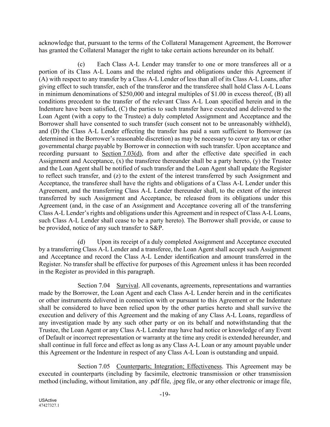 -19- USActive 47427327.1 acknowledge that, pursuant to the terms of the Collateral Management Agreement, the Borrower has granted the Collateral Manager the right to take certain actions hereunder on its behalf. (c) Each Class A-L Lender may transfer to one or more transferees all or a portion of its Class A-L Loans and the related rights and obligations under this Agreement if (A) with respect to any transfer by a Class A-L Lender of less than all of its Class A-L Loans, after giving effect to such transfer, each of the transferor and the transferee shall hold Class A-L Loans in minimum denominations of $250,000 and integral multiples of $1.00 in excess thereof, (B) all conditions precedent to the transfer of the relevant Class A-L Loan specified herein and in the Indenture have been satisfied, (C) the parties to such transfer have executed and delivered to the Loan Agent (with a copy to the Trustee) a duly completed Assignment and Acceptance and the Borrower shall have consented to such transfer (such consent not to be unreasonably withheld), and (D) the Class A-L Lender effecting the transfer has paid a sum sufficient to Borrower (as determined in the Borrower’s reasonable discretion) as may be necessary to cover any tax or other governmental charge payable by Borrower in connection with such transfer. Upon acceptance and recording pursuant to Section 7.03(d), from and after the effective date specified in each Assignment and Acceptance, (x) the transferee thereunder shall be a party hereto, (y) the Trustee and the Loan Agent shall be notified of such transfer and the Loan Agent shall update the Register to reflect such transfer, and (z) to the extent of the interest transferred by such Assignment and Acceptance, the transferee shall have the rights and obligations of a Class A-L Lender under this Agreement, and the transferring Class A-L Lender thereunder shall, to the extent of the interest transferred by such Assignment and Acceptance, be released from its obligations under this Agreement (and, in the case of an Assignment and Acceptance covering all of the transferring Class A-L Lender’s rights and obligations under this Agreement and in respect of Class A-L Loans, such Class A-L Lender shall cease to be a party hereto). The Borrower shall provide, or cause to be provided, notice of any such transfer to S&P. (d) Upon its receipt of a duly completed Assignment and Acceptance executed by a transferring Class A-L Lender and a transferee, the Loan Agent shall accept such Assignment and Acceptance and record the Class A-L Lender identification and amount transferred in the Register. No transfer shall be effective for purposes of this Agreement unless it has been recorded in the Register as provided in this paragraph. Section 7.04 Survival. All covenants, agreements, representations and warranties made by the Borrower, the Loan Agent and each Class A-L Lender herein and in the certificates or other instruments delivered in connection with or pursuant to this Agreement or the Indenture shall be considered to have been relied upon by the other parties hereto and shall survive the execution and delivery of this Agreement and the making of any Class A-L Loans, regardless of any investigation made by any such other party or on its behalf and notwithstanding that the Trustee, the Loan Agent or any Class A-L Lender may have had notice or knowledge of any Event of Default or incorrect representation or warranty at the time any credit is extended hereunder, and shall continue in full force and effect as long as any Class A-L Loan or any amount payable under this Agreement or the Indenture in respect of any Class A-L Loan is outstanding and unpaid. Section 7.05 Counterparts; Integration; Effectiveness. This Agreement may be executed in counterparts (including by facsimile, electronic transmission or other transmission method (including, without limitation, any .pdf file, .jpeg file, or any other electronic or image file,