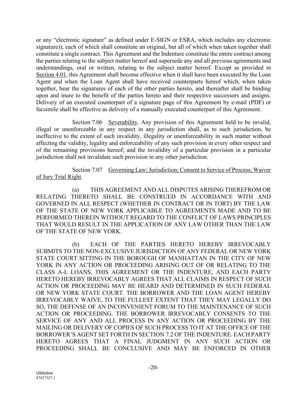-20- USActive 47427327.1 or any “electronic signature” as defined under E-SIGN or ESRA, which includes any electronic signature)), each of which shall constitute an original, but all of which when taken together shall constitute a single contract. This Agreement and the Indenture constitute the entire contract among the parties relating to the subject matter hereof and supersede any and all previous agreements and understandings, oral or written, relating to the subject matter hereof. Except as provided in Section 4.01, this Agreement shall become effective when it shall have been executed by the Loan Agent and when the Loan Agent shall have received counterparts hereof which, when taken together, bear the signatures of each of the other parties hereto, and thereafter shall be binding upon and inure to the benefit of the parties hereto and their respective successors and assigns. Delivery of an executed counterpart of a signature page of this Agreement by e-mail (PDF) or facsimile shall be effective as delivery of a manually executed counterpart of this Agreement. Section 7.06 Severability. Any provision of this Agreement held to be invalid, illegal or unenforceable in any respect in any jurisdiction shall, as to such jurisdiction, be ineffective to the extent of such invalidity, illegality or unenforceability in such matter without affecting the validity, legality and enforceability of any such provision in every other respect and of the remaining provisions hereof; and the invalidity of a particular provision in a particular jurisdiction shall not invalidate such provision in any other jurisdiction. Section 7.07 Governing Law; Jurisdiction; Consent to Service of Process; Waiver of Jury Trial Right. (a) THIS AGREEMENT AND ALL DISPUTES ARISING THEREFROM OR RELATING THERETO SHALL BE CONSTRUED IN ACCORDANCE WITH AND GOVERNED IN ALL RESPECT (WHETHER IN CONTRACT OR IN TORT) BY THE LAW OF THE STATE OF NEW YORK APPLICABLE TO AGREEMENTS MADE AND TO BE PERFORMED THEREIN WITHOUT REGARD TO THE CONFLICT OF LAWS PRINCIPLES THAT WOULD RESULT IN THE APPLICATION OF ANY LAW OTHER THAN THE LAW OF THE STATE OF NEW YORK. (b) EACH OF THE PARTIES HERETO HEREBY IRREVOCABLY SUBMITS TO THE NON-EXCLUSIVE JURISDICTION OF ANY FEDERAL OR NEW YORK STATE COURT SITTING IN THE BOROUGH OF MANHATTAN IN THE CITY OF NEW YORK IN ANY ACTION OR PROCEEDING ARISING OUT OF OR RELATING TO THE CLASS A-L LOANS, THIS AGREEMENT OR THE INDENTURE, AND EACH PARTY HERETO HEREBY IRREVOCABLY AGREES THAT ALL CLAIMS IN RESPECT OF SUCH ACTION OR PROCEEDING MAY BE HEARD AND DETERMINED IN SUCH FEDERAL OR NEW YORK STATE COURT. THE BORROWER AND THE LOAN AGENT HEREBY IRREVOCABLY WAIVE, TO THE FULLEST EXTENT THAT THEY MAY LEGALLY DO SO, THE DEFENSE OF AN INCONVENIENT FORUM TO THE MAINTENANCE OF SUCH ACTION OR PROCEEDING. THE BORROWER IRREVOCABLY CONSENTS TO THE SERVICE OF ANY AND ALL PROCESS IN ANY ACTION OR PROCEEDING BY THE MAILING OR DELIVERY OF COPIES OF SUCH PROCESS TO IT AT THE OFFICE OF THE BORROWER’S AGENT SET FORTH IN SECTION 7.2 OF THE INDENTURE. EACH PARTY HERETO AGREES THAT A FINAL JUDGMENT IN ANY SUCH ACTION OR PROCEEDING SHALL BE CONCLUSIVE AND MAY BE ENFORCED IN OTHER