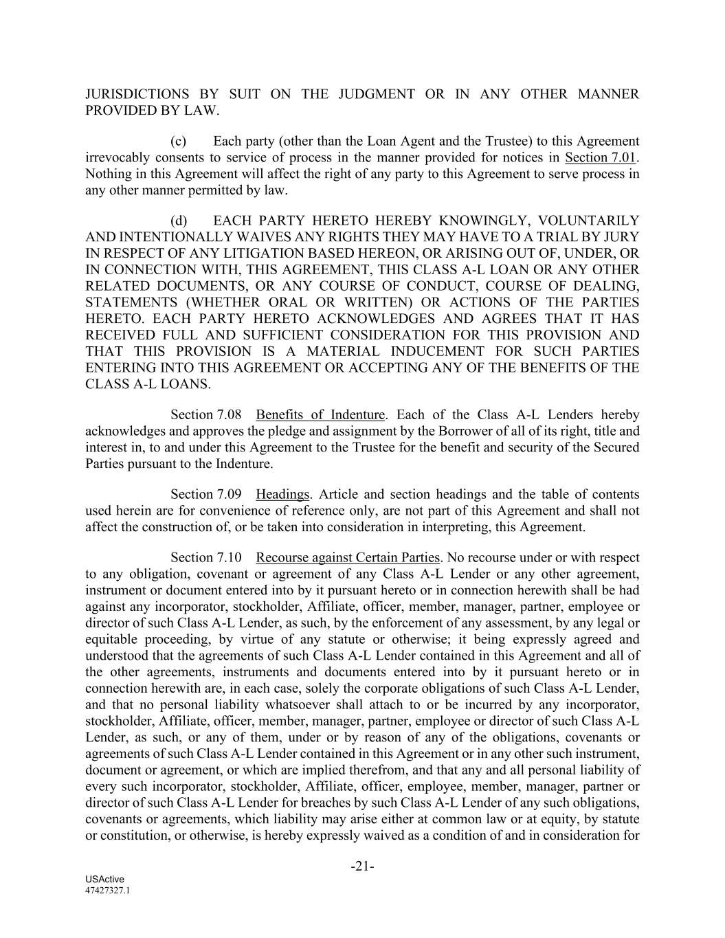 -21- USActive 47427327.1 JURISDICTIONS BY SUIT ON THE JUDGMENT OR IN ANY OTHER MANNER PROVIDED BY LAW. (c) Each party (other than the Loan Agent and the Trustee) to this Agreement irrevocably consents to service of process in the manner provided for notices in Section 7.01. Nothing in this Agreement will affect the right of any party to this Agreement to serve process in any other manner permitted by law. (d) EACH PARTY HERETO HEREBY KNOWINGLY, VOLUNTARILY AND INTENTIONALLY WAIVES ANY RIGHTS THEY MAY HAVE TO A TRIAL BY JURY IN RESPECT OF ANY LITIGATION BASED HEREON, OR ARISING OUT OF, UNDER, OR IN CONNECTION WITH, THIS AGREEMENT, THIS CLASS A-L LOAN OR ANY OTHER RELATED DOCUMENTS, OR ANY COURSE OF CONDUCT, COURSE OF DEALING, STATEMENTS (WHETHER ORAL OR WRITTEN) OR ACTIONS OF THE PARTIES HERETO. EACH PARTY HERETO ACKNOWLEDGES AND AGREES THAT IT HAS RECEIVED FULL AND SUFFICIENT CONSIDERATION FOR THIS PROVISION AND THAT THIS PROVISION IS A MATERIAL INDUCEMENT FOR SUCH PARTIES ENTERING INTO THIS AGREEMENT OR ACCEPTING ANY OF THE BENEFITS OF THE CLASS A-L LOANS. Section 7.08 Benefits of Indenture. Each of the Class A-L Lenders hereby acknowledges and approves the pledge and assignment by the Borrower of all of its right, title and interest in, to and under this Agreement to the Trustee for the benefit and security of the Secured Parties pursuant to the Indenture. Section 7.09 Headings. Article and section headings and the table of contents used herein are for convenience of reference only, are not part of this Agreement and shall not affect the construction of, or be taken into consideration in interpreting, this Agreement. Section 7.10 Recourse against Certain Parties. No recourse under or with respect to any obligation, covenant or agreement of any Class A-L Lender or any other agreement, instrument or document entered into by it pursuant hereto or in connection herewith shall be had against any incorporator, stockholder, Affiliate, officer, member, manager, partner, employee or director of such Class A-L Lender, as such, by the enforcement of any assessment, by any legal or equitable proceeding, by virtue of any statute or otherwise; it being expressly agreed and understood that the agreements of such Class A-L Lender contained in this Agreement and all of the other agreements, instruments and documents entered into by it pursuant hereto or in connection herewith are, in each case, solely the corporate obligations of such Class A-L Lender, and that no personal liability whatsoever shall attach to or be incurred by any incorporator, stockholder, Affiliate, officer, member, manager, partner, employee or director of such Class A-L Lender, as such, or any of them, under or by reason of any of the obligations, covenants or agreements of such Class A-L Lender contained in this Agreement or in any other such instrument, document or agreement, or which are implied therefrom, and that any and all personal liability of every such incorporator, stockholder, Affiliate, officer, employee, member, manager, partner or director of such Class A-L Lender for breaches by such Class A-L Lender of any such obligations, covenants or agreements, which liability may arise either at common law or at equity, by statute or constitution, or otherwise, is hereby expressly waived as a condition of and in consideration for