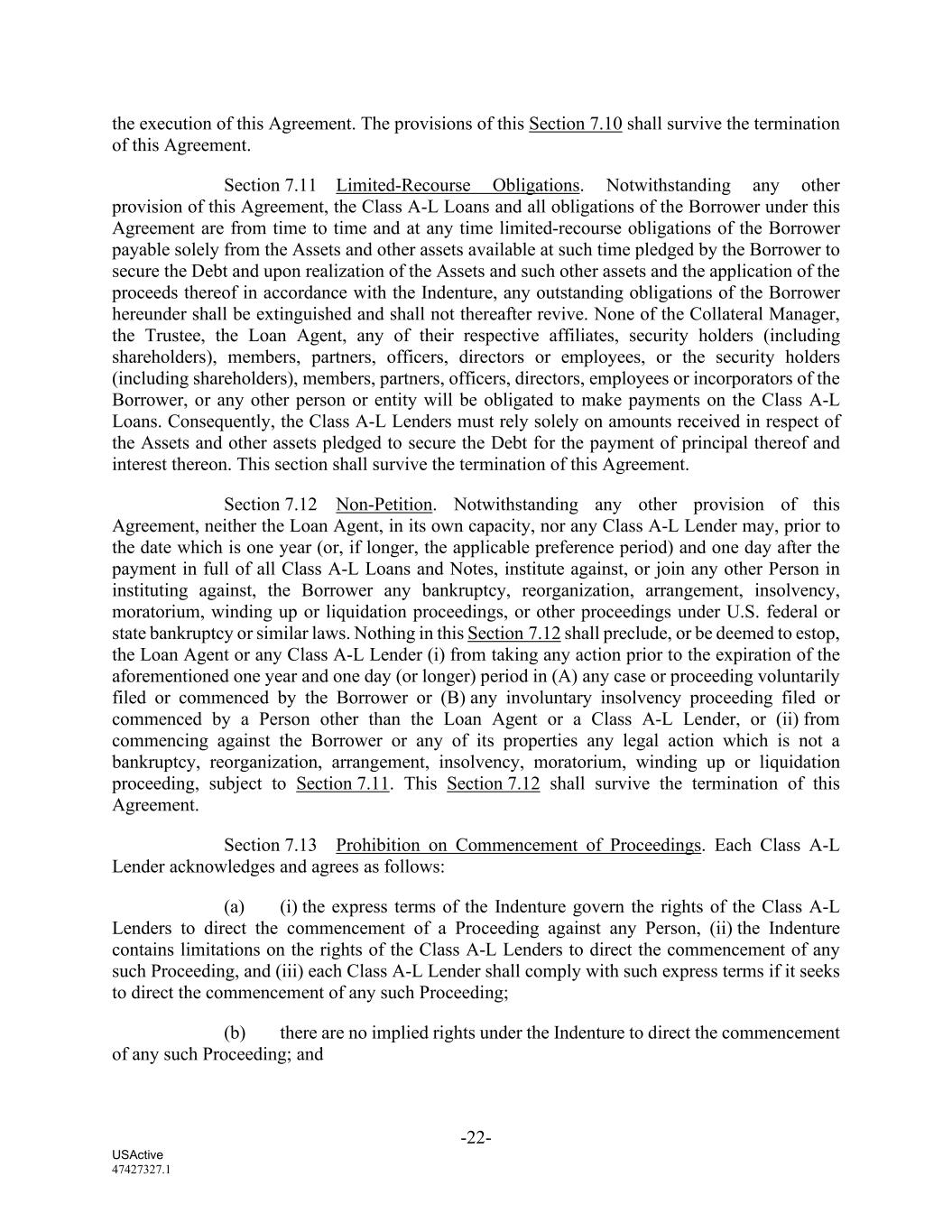 -22- USActive 47427327.1 the execution of this Agreement. The provisions of this Section 7.10 shall survive the termination of this Agreement. Section 7.11 Limited-Recourse Obligations. Notwithstanding any other provision of this Agreement, the Class A-L Loans and all obligations of the Borrower under this Agreement are from time to time and at any time limited-recourse obligations of the Borrower payable solely from the Assets and other assets available at such time pledged by the Borrower to secure the Debt and upon realization of the Assets and such other assets and the application of the proceeds thereof in accordance with the Indenture, any outstanding obligations of the Borrower hereunder shall be extinguished and shall not thereafter revive. None of the Collateral Manager, the Trustee, the Loan Agent, any of their respective affiliates, security holders (including shareholders), members, partners, officers, directors or employees, or the security holders (including shareholders), members, partners, officers, directors, employees or incorporators of the Borrower, or any other person or entity will be obligated to make payments on the Class A-L Loans. Consequently, the Class A-L Lenders must rely solely on amounts received in respect of the Assets and other assets pledged to secure the Debt for the payment of principal thereof and interest thereon. This section shall survive the termination of this Agreement. Section 7.12 Non-Petition. Notwithstanding any other provision of this Agreement, neither the Loan Agent, in its own capacity, nor any Class A-L Lender may, prior to the date which is one year (or, if longer, the applicable preference period) and one day after the payment in full of all Class A-L Loans and Notes, institute against, or join any other Person in instituting against, the Borrower any bankruptcy, reorganization, arrangement, insolvency, moratorium, winding up or liquidation proceedings, or other proceedings under U.S. federal or state bankruptcy or similar laws. Nothing in this Section 7.12 shall preclude, or be deemed to estop, the Loan Agent or any Class A-L Lender (i) from taking any action prior to the expiration of the aforementioned one year and one day (or longer) period in (A) any case or proceeding voluntarily filed or commenced by the Borrower or (B) any involuntary insolvency proceeding filed or commenced by a Person other than the Loan Agent or a Class A-L Lender, or (ii) from commencing against the Borrower or any of its properties any legal action which is not a bankruptcy, reorganization, arrangement, insolvency, moratorium, winding up or liquidation proceeding, subject to Section 7.11. This Section 7.12 shall survive the termination of this Agreement. Section 7.13 Prohibition on Commencement of Proceedings. Each Class A-L Lender acknowledges and agrees as follows: (a) (i) the express terms of the Indenture govern the rights of the Class A-L Lenders to direct the commencement of a Proceeding against any Person, (ii) the Indenture contains limitations on the rights of the Class A-L Lenders to direct the commencement of any such Proceeding, and (iii) each Class A-L Lender shall comply with such express terms if it seeks to direct the commencement of any such Proceeding; (b) there are no implied rights under the Indenture to direct the commencement of any such Proceeding; and
