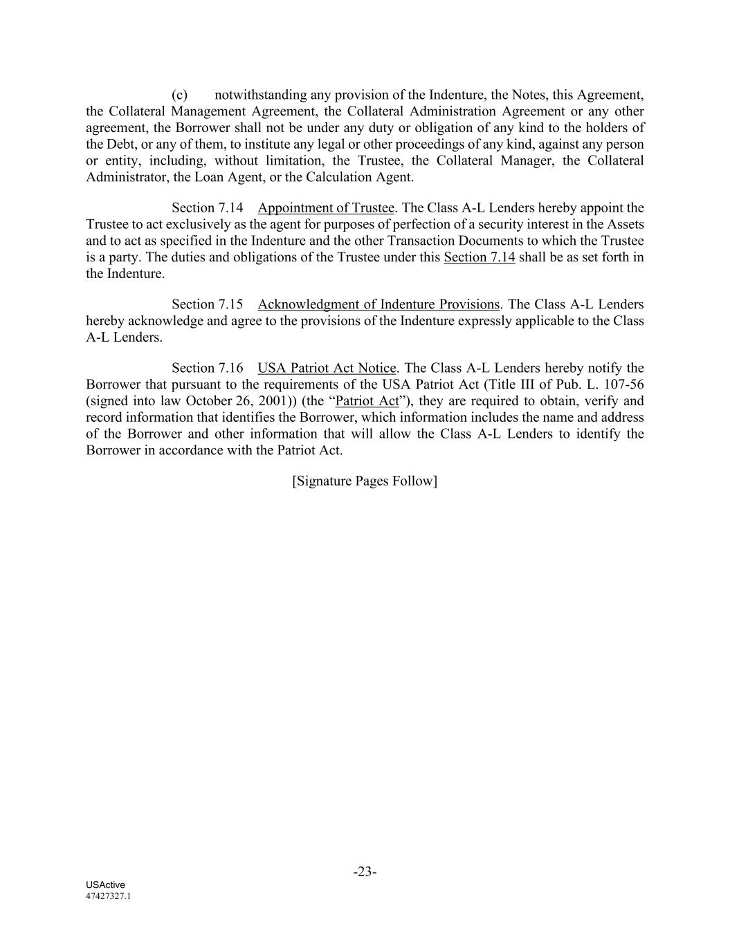 -23- USActive 47427327.1 (c) notwithstanding any provision of the Indenture, the Notes, this Agreement, the Collateral Management Agreement, the Collateral Administration Agreement or any other agreement, the Borrower shall not be under any duty or obligation of any kind to the holders of the Debt, or any of them, to institute any legal or other proceedings of any kind, against any person or entity, including, without limitation, the Trustee, the Collateral Manager, the Collateral Administrator, the Loan Agent, or the Calculation Agent. Section 7.14 Appointment of Trustee. The Class A-L Lenders hereby appoint the Trustee to act exclusively as the agent for purposes of perfection of a security interest in the Assets and to act as specified in the Indenture and the other Transaction Documents to which the Trustee is a party. The duties and obligations of the Trustee under this Section 7.14 shall be as set forth in the Indenture. Section 7.15 Acknowledgment of Indenture Provisions. The Class A-L Lenders hereby acknowledge and agree to the provisions of the Indenture expressly applicable to the Class A-L Lenders. Section 7.16 USA Patriot Act Notice. The Class A-L Lenders hereby notify the Borrower that pursuant to the requirements of the USA Patriot Act (Title III of Pub. L. 107-56 (signed into law October 26, 2001)) (the “Patriot Act”), they are required to obtain, verify and record information that identifies the Borrower, which information includes the name and address of the Borrower and other information that will allow the Class A-L Lenders to identify the Borrower in accordance with the Patriot Act. [Signature Pages Follow]