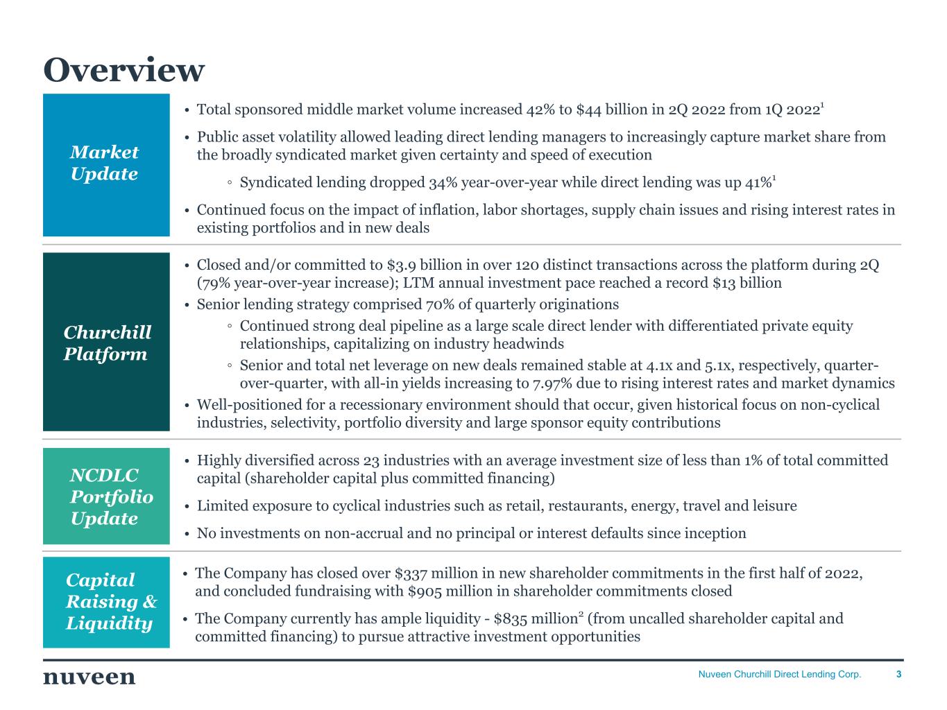 2Nuveen Churchill Direct Lending Corp. Disclaimer This presentation is for informational purposes only. It does not convey an offer of any type and is not intended to be, and should not be construed as, an offer to sell, or the solicitation of an offer to buy, any securities of Nuveen Churchill Direct Lending Corp. (the “Company,” “NCDLC,” “we,” “us” or “our”). Any such offering can be made only at the time a qualified offeree receives a confidential private placement memorandum and other operative documents which contain significant details with respect to risks and should be carefully read. In addition, the information in this presentation is qualified in its entirety by reference to all of the information in the Company’s confidential private placement memorandum and the Company’s public filings with the Securities and Exchange Commission (the “SEC”), including without limitation, the risk factors. Nothing in this presentation constitutes investment advice. The Company’s securities have not been registered under the Securities Act of 1933 or listed on any securities exchange. You or your clients may lose money by investing in the Company. The Company is not intended to be a complete investment program and, due to the uncertainty inherent in all investments, there can be no assurance that the Company will achieve its investment objectives. The information contained herein is not intended to provide, and should not be relied upon for, accounting, legal or tax advice or investment recommendations. Prospective investors should also seek advice from their own independent tax, accounting, financial, investment and legal advisors to properly assess the merits and risks associated with an investment in the Company in light of their own financial condition and other circumstances. These materials and the presentations of which they are a part, and the summaries contained herein, do not purport to be complete and no obligation to update or otherwise revise such information is being assumed. Nothing shall be relied upon as a promise or representation as to the future performance of the Company. Such information is qualified in its entirety by reference to the more detailed discussions contained elsewhere in the Company’s confidential private placement memorandum and public filings with the SEC. An investment in the Company is speculative and involves a high degree of risk. There can be no guarantee that the Company’s investment objective will be achieved. The Company may engage in other investment practices that may increase the risk of investment loss. An investor could lose all or substantially all of his, her or its investment. The Company may not provide periodic valuation information to investors, and there may be delays in distributing important tax information. The Company’s fees and expenses may be considered high and, as a result, such fees and expenses may offset the Company’s profits. For a summary of certain of these and other risks, please see the Company’s confidential private placement memorandum and public filings with the SEC. There is no guarantee that any of the estimates, targets or projections illustrated in these materials and any presentation of which they form a part will be achieved. Any references herein to any of the Company’s past or present investments or its past or present performance, have been provided for illustrative purposes only. It should not be assumed that these investments were or will be profitable or that any future investments by the Company will be profitable or will equal the performance of these investments. This presentation contains forward-looking statements that involve substantial risks and uncertainties. Such statements involve known and unknown risks, uncertainties and other factors and undue reliance should not be placed thereon. These forward-looking statements are not historical facts, but rather are based on current expectations, estimates and projections about the Company, our current and prospective portfolio investments, our industry, our beliefs and opinions, and our assumptions. Words such as “anticipates,” “expects,” “intends,” “plans,” “will,” “may,” “continue,” “believes,” “seeks,” “estimates,” “would,” “could,” “should,” “targets,” “projects,” “outlook,” “potential,” “predicts” and variations of these words and similar expressions are intended to identify forward- looking statements. These statements are not guarantees of future performance and are subject to risks, uncertainties and other factors that are outlined in the Company’s confidential private placement memorandum and public filings with the SEC, some of which are beyond our control and difficult to predict and could cause actual results to differ materially from those expressed or forecasted in the forward-looking statements. The Company is providing the information as of this date (unless otherwise specified) and assumes no obligations to update or revise any forward- looking statements, whether as a result of new information, future events or otherwise. Additionally, our actual results and financial condition may differ materially as a result of the continued impact of the novel coronavirus (“COVID-19”) pandemic, including without limitation: the length and duration of the COVID-19 outbreak in the United States as well as worldwide and the magnitude of the economic impact of that outbreak; the effect of the COVID-19 pandemic on our business prospects and the prospects of our portfolio companies, including our and their ability to achieve our respective objectives; and the effect of the disruptions caused by the COVID-19 pandemic on our ability to continue to effectively manage our business (including on our ability to source and close new investment opportunities) and on the availability of equity and debt capital and our use of borrowed money to fin
