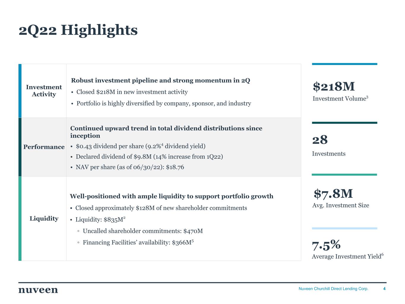 3Nuveen Churchill Direct Lending Corp. • Closed and/or committed to $3.9 billion in over 120 distinct transactions across the platform during 2Q (79% year-over-year increase); LTM annual investment pace reached a record $13 billion • Senior lending strategy comprised 70% of quarterly originations ◦ Continued strong deal pipeline as a large scale direct lender with differentiated private equity relationships, capitalizing on industry headwinds ◦ Senior and total net leverage on new deals remained stable at 4.1x and 5.1x, respectively, quarter- over-quarter, with all-in yields increasing to 7.97% due to rising interest rates and market dynamics • Well-positioned for a recessionary environment should that occur, given historical focus on non-cyclical industries, selectivity, portfolio diversity and large sponsor equity contributions • Strong momentum entering 2021 rebuilding pipeline • Limited exposure to cyclical industries such as retail, energy and leisure • No principal and/or interest defaults since inception and none of the Company’s investments are on non-accrual Overview • Closed and/or committed $1.7 billion during the first quarter across 76 distinct transactions, over $1.2 billion in direct investments • Highly selective with a historical low selectivity rate of 6% • Sourced second most senior loan opportunities by transaction volume • Highly diversified across 23 industries with an average investment size of less than 1% of total committed capital (shareholder capital plus committed financing) • Limited exposure to cyclical industries such as retail, restaurants, energy, travel and leisure • No investments on non-accrual and no principal or interest defaults since inception • Closed on over $5.5 billion in new committed capital across the platform, including over $2.2 billion from over a dozen new third party institutional investors • Committed equity capital to nearly $500 million, giving ample liquidity to invest in attractive investment opportunities • The Company has closed over $337 million in new shareholder commitments in the first half of 2022, and concluded fundraising with $905 million in shareholder commitments closed • The Company currently has ample liquidity - $835 million2 (from uncalled shareholder capital and committed financing) to pursue attractive investment opportunities Market Update Churchill Platform NCDLC Portfolio Update Capital Raising & Liquidity • Total sponsored middle market volume increased 42% to $44 billion in 2Q 2022 from 1Q 20221 • Public asset volatility allowed leading direct lending managers to increasingly capture market share from the broadly syndicated market given certainty and speed of execution ◦ Syndicated lending dropped 34% year-over-year while direct lending was up 41%1 • Continued focus on the impact of inflation, labor shortages, supply chain issues and rising interest rates in existing portfolios and in new deals