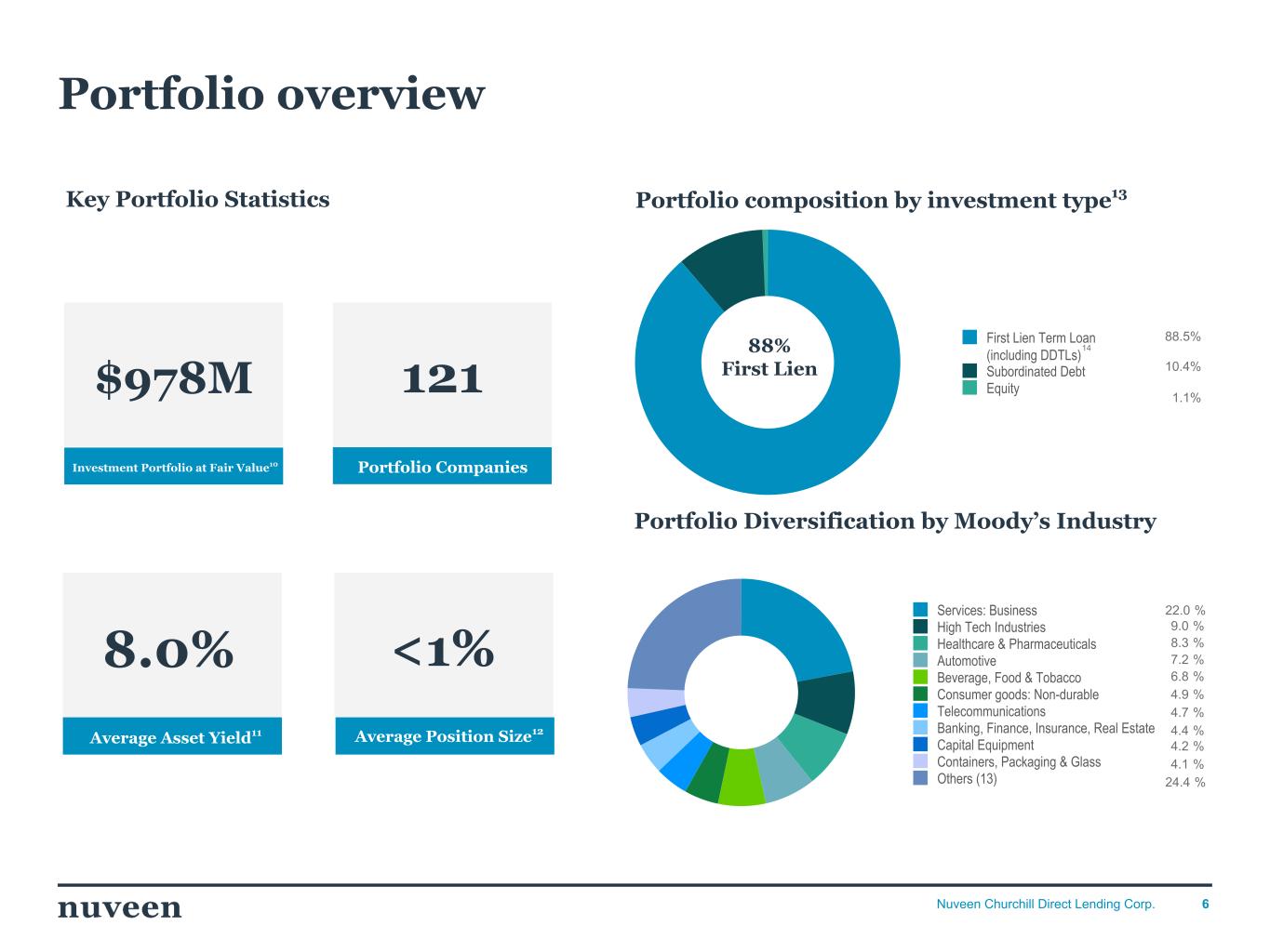 5Nuveen Churchill Direct Lending Corp. V ol u m e ($ M il li on s) Sp read / C ou p on (% ) Investment Activity (QoQ) $223M $214M $61M $218M 5.8% 5.3% 5.5% 5.3% 10.3% 11.0% 10.5% 10.4% 6.7% 6.2% 6.5% 7.4% Volume ($ Millions) Spread (%) Coupon (%) Interest rate on floating rate investments (%) 09/30/21 12/31/21 03/31/22 06/30/22 $0M $100M $200M $300M $400M $500M $600M $700M —% 2.0% 4.0% 6.0% 8.0% 10.0% • Closed 19 new portfolio investments and 9 add-ons totaling $218M3 • 5.3%7 average spread of new floating rate investments • 10.4%8 average coupon of new fixed rate investments 2Q22 Investment activity 14 Investments 28 Investments34 Investments 32 Investments 9