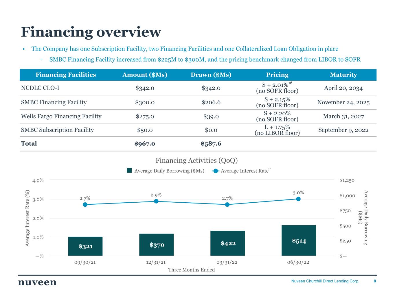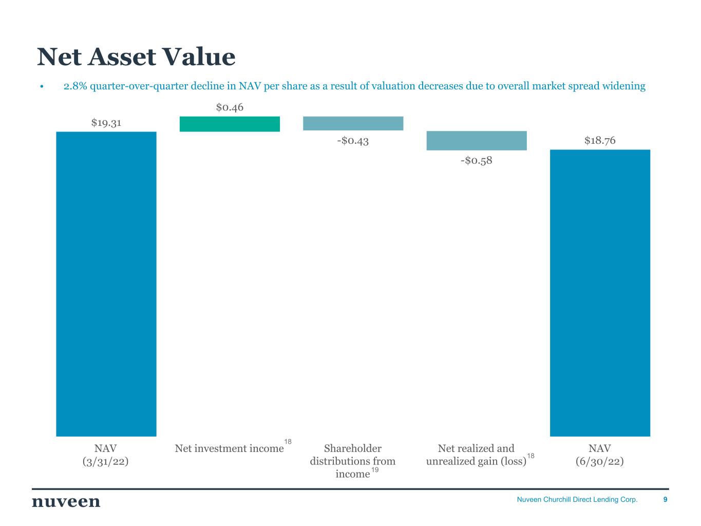 8Nuveen Churchill Direct Lending Corp. • The Company has one Subscription Facility, two Financing Facilities and one Collateralized Loan Obligation in place ◦ SMBC Financing Facility increased from $225M to $300M, and the pricing benchmark changed from LIBOR to SOFR Financing overview Financing Facilities Amount ($Ms) Drawn ($Ms) Pricing Maturity NCDLC CLO-I $342.0 $342.0 S + 2.01%16 (no SOFR floor) April 20, 2034 SMBC Financing Facility $300.0 $206.6 S + 2.15% (no SOFR floor) November 24, 2025 Wells Fargo Financing Facility $275.0 $39.0 S + 2.20% (no SOFR floor) March 31, 2027 SMBC Subscription Facility $50.0 $0.0 L + 1.75% (no LIBOR floor) September 9, 2022 Total $967.0 $587.6 Three Months Ended A ve ra ge I n te re st R at e (% ) A verage D aily B orrow in g ($ M s) Financing Activities (QoQ) $321 $370 $422 $514 2.7% 2.9% 2.7% 3.0% Average Daily Borrowing ($Ms) Average Interest Rate 09/30/21 12/31/21 03/31/22 06/30/22 —% 1.0% 2.0% 3.0% 4.0% $— $250 $500 $750 $1,000 $1,250 17