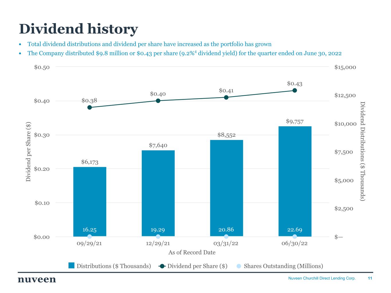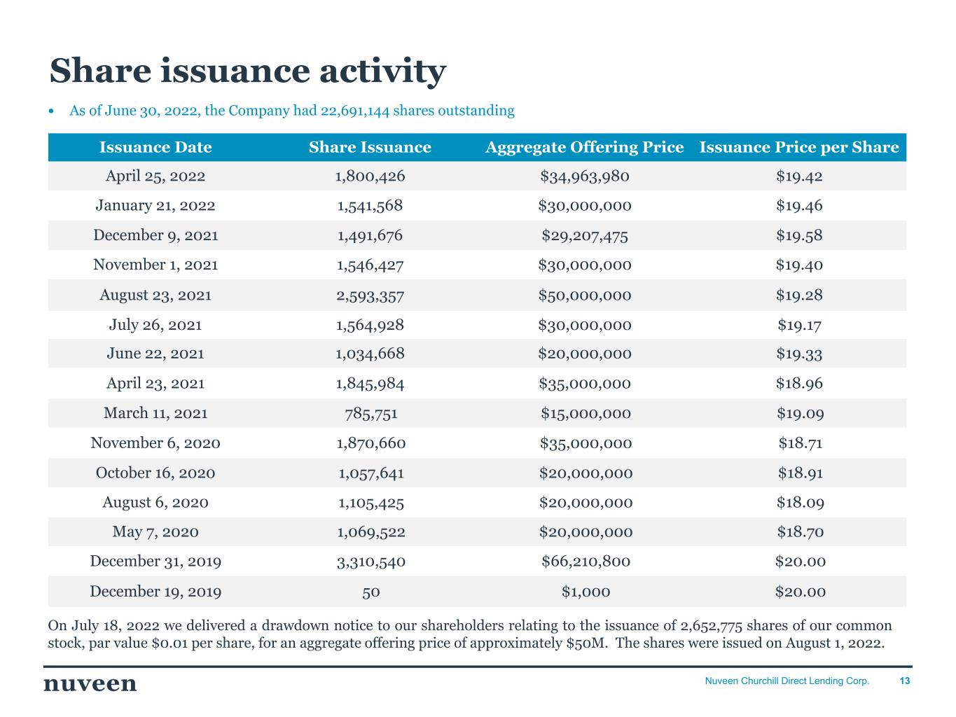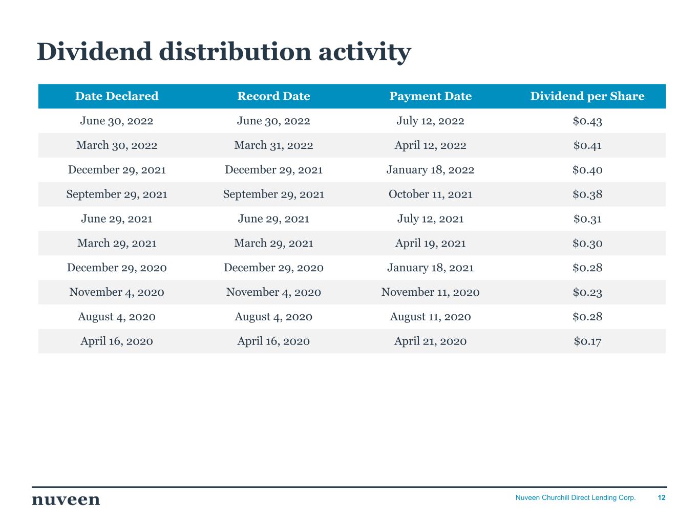 12Nuveen Churchill Direct Lending Corp. Dividend distribution activity Date Declared Record Date Payment Date Dividend per Share June 30, 2022 June 30, 2022 July 12, 2022 $0.43 March 30, 2022 March 31, 2022 April 12, 2022 $0.41 December 29, 2021 December 29, 2021 January 18, 2022 $0.40 September 29, 2021 September 29, 2021 October 11, 2021 $0.38 June 29, 2021 June 29, 2021 July 12, 2021 $0.31 March 29, 2021 March 29, 2021 April 19, 2021 $0.30 December 29, 2020 December 29, 2020 January 18, 2021 $0.28 November 4, 2020 November 4, 2020 November 11, 2020 $0.23 August 4, 2020 August 4, 2020 August 11, 2020 $0.28 April 16, 2020 April 16, 2020 April 21, 2020 $0.17