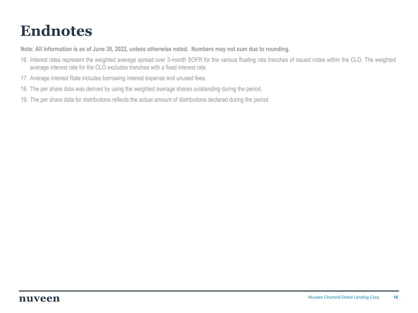 15Nuveen Churchill Direct Lending Corp. Note: All information is as of June 30, 2022, unless otherwise noted. Numbers may not sum due to rounding. 1. Source: Refinitiv 2Q22 Pricing Analysis. 2. Represents the sum of uncalled shareholder commitments of $470M and Financing Facilities availability of $366M. 3. Reflects the par amount of total new investment activity for the three months ended June 30, 2022. Investment Activity does not include draws on existing Delayed Draw Term Loans and partial paydowns. 4. Annualized dividend yield is the annualized total quarterly dividend per share divided by NAV per share as of June 30, 2022. 5. Available for borrowing based on the computation of collateral to support the borrowings and subject to compliance with applicable covenants and financial ratios. 6. Represents the weighted average spread plus the greater of 3-Month base rate, or base rate floor, if applicable, as of June 30, 2022. 7. Average Spread is calculated based off of par amount. 8. Average Coupon is calculated based off of par amount. Average coupon includes 88% cash coupon and 12% PIK. 9. Interest rate utilizes the floating rate investment spread plus the greater of 3-Month base rate, or base rate floor, if applicable for each respective transaction (LIBOR as of September 30, 2021 was 0.13%; LIBOR as of December 31, 2021 was 0.21%; LIBOR as of March 31, 2022 was 0.96%; SOFR as of March 31, 2022 was 0.68%; SOFR as of June 30, 2022 was 2.12%). 10. Represents total investment portfolio at Fair Value. Total par value of debt investment commitments is $1,128M which includes approximately $91M of unfunded delayed draw term loan commitments. 11. Weighted average yield on debt and income producing investments, at fair value. The weighted average yield of the Company’s debt and income producing securities is not the same as a return on investment for our shareholders but, rather, relates to our investment portfolio and is calculated before the payment of all of our and our subsidiaries’ fees and expenses. 12. Average Position Size (at fair value) is calculated as a percentage of Committed Capital. Committed Capital includes Equity Commitment of $905M as of June 30, 2022 and $967M from Financing Facilities. 13. Investment Type reflects classification at issuance. 14. 40% of first lien term loans are unitranche positions. 15. Represents current Financing Facilities amount. Endnotes