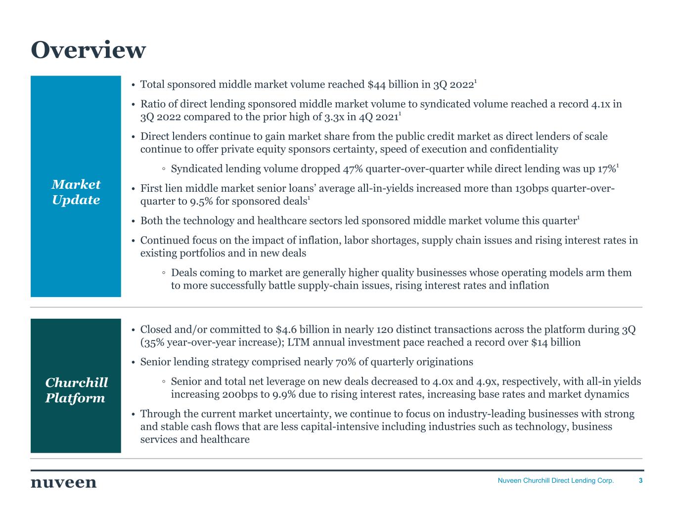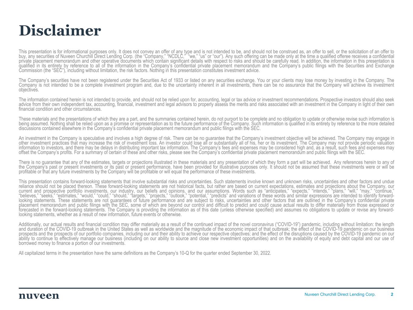 2Nuveen Churchill Direct Lending Corp. Disclaimer This presentation is for informational purposes only. It does not convey an offer of any type and is not intended to be, and should not be construed as, an offer to sell, or the solicitation of an offer to buy, any securities of Nuveen Churchill Direct Lending Corp. (the “Company,” “NCDLC,” “we,” “us” or “our”). Any such offering can be made only at the time a qualified offeree receives a confidential private placement memorandum and other operative documents which contain significant details with respect to risks and should be carefully read. In addition, the information in this presentation is qualified in its entirety by reference to all of the information in the Company’s confidential private placement memorandum and the Company’s public filings with the Securities and Exchange Commission (the “SEC”), including without limitation, the risk factors. Nothing in this presentation constitutes investment advice. The Company’s securities have not been registered under the Securities Act of 1933 or listed on any securities exchange. You or your clients may lose money by investing in the Company. The Company is not intended to be a complete investment program and, due to the uncertainty inherent in all investments, there can be no assurance that the Company will achieve its investment objectives. The information contained herein is not intended to provide, and should not be relied upon for, accounting, legal or tax advice or investment recommendations. Prospective investors should also seek advice from their own independent tax, accounting, financial, investment and legal advisors to properly assess the merits and risks associated with an investment in the Company in light of their own financial condition and other circumstances. These materials and the presentations of which they are a part, and the summaries contained herein, do not purport to be complete and no obligation to update or otherwise revise such information is being assumed. Nothing shall be relied upon as a promise or representation as to the future performance of the Company. Such information is qualified in its entirety by reference to the more detailed discussions contained elsewhere in the Company’s confidential private placement memorandum and public filings with the SEC. An investment in the Company is speculative and involves a high degree of risk. There can be no guarantee that the Company’s investment objective will be achieved. The Company may engage in other investment practices that may increase the risk of investment loss. An investor could lose all or substantially all of his, her or its investment. The Company may not provide periodic valuation information to investors, and there may be delays in distributing important tax information. The Company’s fees and expenses may be considered high and, as a result, such fees and expenses may offset the Company’s profits. For a summary of certain of these and other risks, please see the Company’s confidential private placement memorandum and public filings with the SEC. There is no guarantee that any of the estimates, targets or projections illustrated in these materials and any presentation of which they form a part will be achieved. Any references herein to any of the Company’s past or present investments or its past or present performance, have been provided for illustrative purposes only. It should not be assumed that these investments were or will be profitable or that any future investments by the Company will be profitable or will equal the performance of these investments. This presentation contains forward-looking statements that involve substantial risks and uncertainties. Such statements involve known and unknown risks, uncertainties and other factors and undue reliance should not be placed thereon. These forward-looking statements are not historical facts, but rather are based on current expectations, estimates and projections about the Company, our current and prospective portfolio investments, our industry, our beliefs and opinions, and our assumptions. Words such as “anticipates,” “expects,” “intends,” “plans,” “will,” “may,” “continue,” “believes,” “seeks,” “estimates,” “would,” “could,” “should,” “targets,” “projects,” “outlook,” “potential,” “predicts” and variations of these words and similar expressions are intended to identify forward- looking statements. These statements are not guarantees of future performance and are subject to risks, uncertainties and other factors that are outlined in the Company’s confidential private placement memorandum and public filings with the SEC, some of which are beyond our control and difficult to predict and could cause actual results to differ materially from those expressed or forecasted in the forward-looking statements. The Company is providing the information as of this date (unless otherwise specified) and assumes no obligations to update or revise any forward- looking statements, whether as a result of new information, future events or otherwise. Additionally, our actual results and financial condition may differ materially as a result of the continued impact of the novel coronavirus (“COVID-19”) pandemic, including without limitation: the length and duration of the COVID-19 outbreak in the United States as well as worldwide and the magnitude of the economic impact of that outbreak; the effect of the COVID-19 pandemic on our business prospects and the prospects of our portfolio companies, including our and their ability to achieve our respective objectives; and the effect of the disruptions caused by the COVID-19 pandemic on our ability to continue to effectively manage our business (including on our ability to source and close new investment opportunities) and on the availability of equity and debt capital and our use of borrowed money to fin