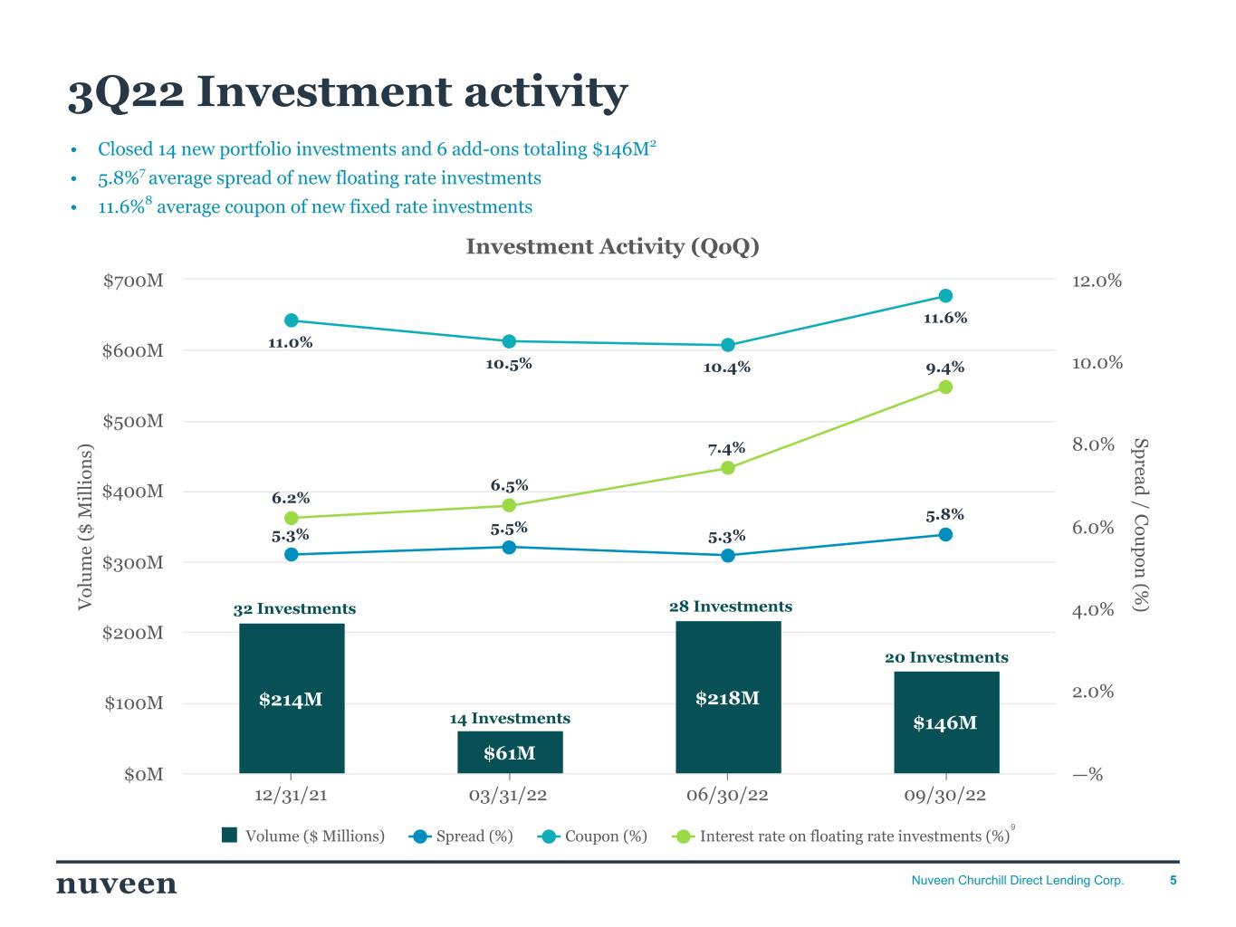4Nuveen Churchill Direct Lending Corp. Investment Activity Performance Liquidity 3Q22 Highlights $146M Investment Volume2 10.1% Average Investment Yield6 20 Investments $7.3M Avg. Investment Size Well-positioned with ample liquidity to support portfolio growth • Liquidity: $713M4 ◦ Uncalled shareholder commitments: $420M ◦ Financing Facilities’ availability: $293M5 Robust investment pipeline and strong momentum in 3Q • Closed $146M in new investment activity • Portfolio is highly diversified by company, sponsor, and industry Continued increase in dividend yield to shareholders • $0.47 dividend per share (10.1%3 dividend yield) • Declared dividend of $11.9M (22% increase from 2Q22) • NAV per share (as of 09/30/22): $18.54