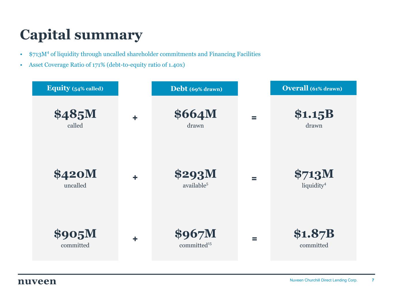 6Nuveen Churchill Direct Lending Corp. Services: Business High Tech Industries Healthcare & Pharmaceuticals Beverage, Food & Tobacco Automotive Banking, Finance, Insurance, Real Estate Consumer Goods: Non-durable Telecommunications Capital Equipment Containers, Packaging & Glass Others (13) First Lien Term Loan (including DDTLs) Subordinated Debt Equity Portfolio overview Average Asset Yield11 9.8% Average Position Size12 Key Portfolio Statistics <1% 21.9 % 9.9 % 9.1 % 6.8 % 6.6 % 4.5 % 4.4 % 4.4 % 4.2 % 4.1 % 24.1 % 87.9% 10.5% 1.5% 1488% First Lien Portfolio composition by investment type13 Portfolio diversification by Moody’s Industry Investment Portfolio at Fair Value10 $1.1B Portfolio Companies 135 PLEASE DO NOT TOUCH THE FORMATTING (MOVE AROUND BOXES, CHANGE CHARTS ETC.) THANK YOU!!!
