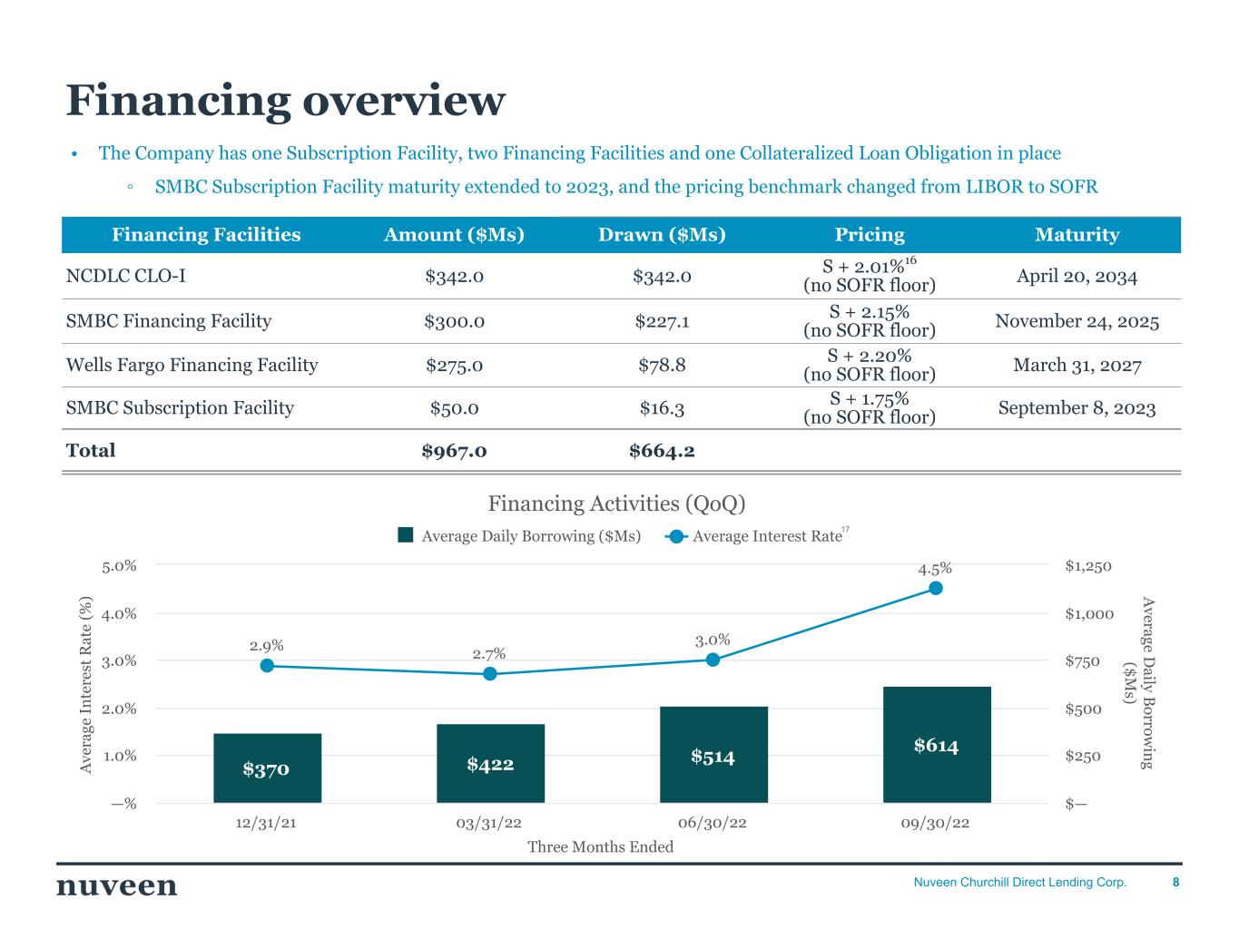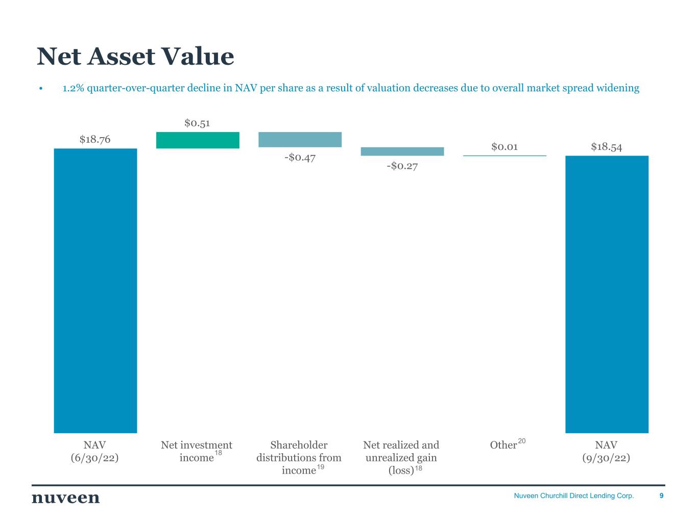 8Nuveen Churchill Direct Lending Corp. • The Company has one Subscription Facility, two Financing Facilities and one Collateralized Loan Obligation in place ◦ SMBC Subscription Facility maturity extended to 2023, and the pricing benchmark changed from LIBOR to SOFR Financing overview Financing Facilities Amount ($Ms) Drawn ($Ms) Pricing Maturity NCDLC CLO-I $342.0 $342.0 S + 2.01%16 (no SOFR floor) April 20, 2034 SMBC Financing Facility $300.0 $227.1 S + 2.15% (no SOFR floor) November 24, 2025 Wells Fargo Financing Facility $275.0 $78.8 S + 2.20% (no SOFR floor) March 31, 2027 SMBC Subscription Facility $50.0 $16.3 S + 1.75% (no SOFR floor) September 8, 2023 Total $967.0 $664.2 Three Months Ended A ve ra ge I n te re st R at e (% ) A verage D aily B orrow in g ($ M s) Financing Activities (QoQ) $370 $422 $514 $614 2.9% 2.7% 3.0% 4.5% Average Daily Borrowing ($Ms) Average Interest Rate 12/31/21 03/31/22 06/30/22 09/30/22 —% 1.0% 2.0% 3.0% 4.0% 5.0% $— $250 $500 $750 $1,000 $1,250 17 PLEASE DO NOT TOUCH THE FORMATTING (MOVE AROUND BOXES, CHANGE CHARTS ETC.) THANK YOU!!!