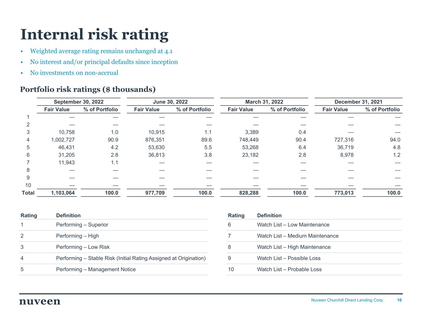 10Nuveen Churchill Direct Lending Corp. Internal risk rating Portfolio risk ratings ($ thousands) September 30, 2022 June 30, 2022 March 31, 2022 December 31, 2021 Fair Value % of Portfolio Fair Value % of Portfolio Fair Value % of Portfolio Fair Value % of Portfolio 1 — — — — — — — — 2 — — — — — — — — 3 10,758 1.0 10,915 1.1 3,389 0.4 — — 4 1,002,727 90.9 876,351 89.6 748,449 90.4 727,316 94.0 5 46,431 4.2 53,630 5.5 53,268 6.4 36,719 4.8 6 31,205 2.8 36,813 3.8 23,182 2.8 8,978 1.2 7 11,943 1.1 — — — — — — 8 — — — — — — — — 9 — — — — — — — — 10 — — — — — — — — Total 1,103,064 100.0 977,709 100.0 828,288 100.0 773,013 100.0 Rating Definition Rating Definition 1 Performing – Superior 6 Watch List – Low Maintenance 2 Performing – High 7 Watch List – Medium Maintenance 3 Performing – Low Risk 8 Watch List – High Maintenance 4 Performing – Stable Risk (Initial Rating Assigned at Origination) 9 Watch List – Possible Loss 5 Performing – Management Notice 10 Watch List – Probable Loss • Weighted average rating remains unchanged at 4.1 • No interest and/or principal defaults since inception • No investments on non-accrual
