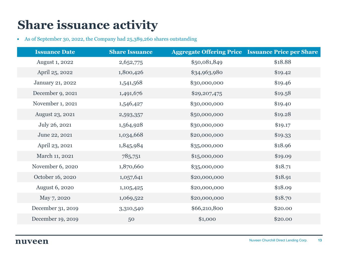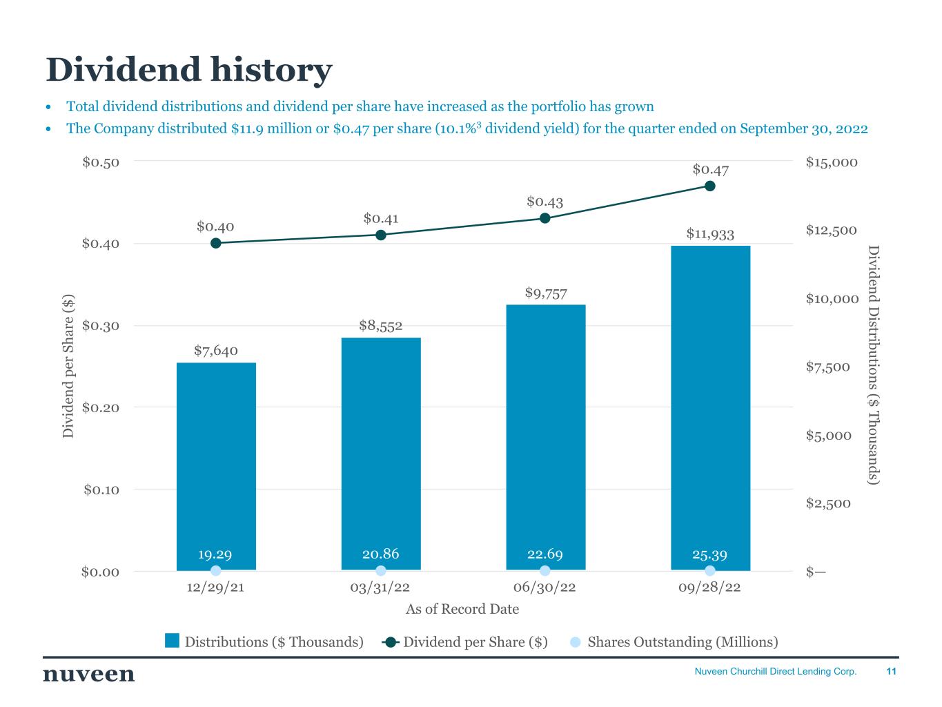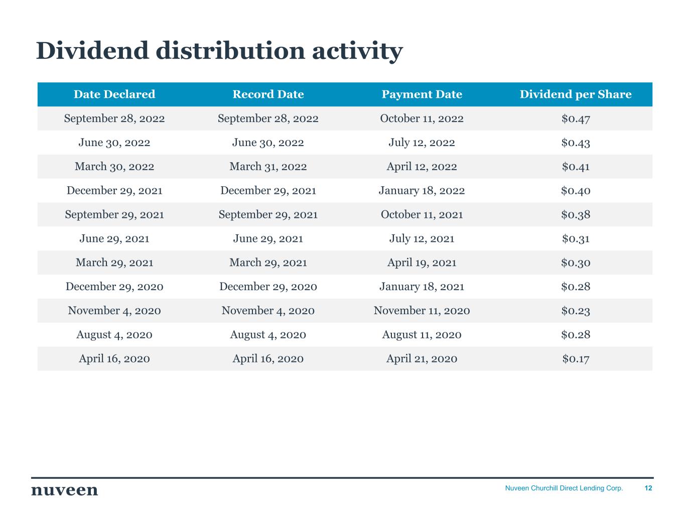 12Nuveen Churchill Direct Lending Corp. Dividend distribution activity Date Declared Record Date Payment Date Dividend per Share September 28, 2022 September 28, 2022 October 11, 2022 $0.47 June 30, 2022 June 30, 2022 July 12, 2022 $0.43 March 30, 2022 March 31, 2022 April 12, 2022 $0.41 December 29, 2021 December 29, 2021 January 18, 2022 $0.40 September 29, 2021 September 29, 2021 October 11, 2021 $0.38 June 29, 2021 June 29, 2021 July 12, 2021 $0.31 March 29, 2021 March 29, 2021 April 19, 2021 $0.30 December 29, 2020 December 29, 2020 January 18, 2021 $0.28 November 4, 2020 November 4, 2020 November 11, 2020 $0.23 August 4, 2020 August 4, 2020 August 11, 2020 $0.28 April 16, 2020 April 16, 2020 April 21, 2020 $0.17