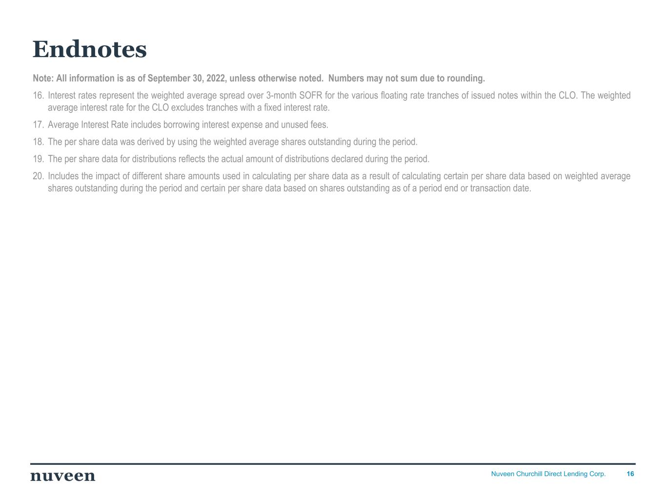 15Nuveen Churchill Direct Lending Corp. Note: All information is as of September 30, 2022, unless otherwise noted. Numbers may not sum due to rounding. 1. Source: Refinitiv 3Q22 Private Deals Analysis. 2. Reflects the par amount of total new investment activity for the three months ended September 30, 2022. Investment Activity does not include draws on existing Delayed Draw Term Loans and partial paydowns. 3. Annualized dividend yield is the annualized total quarterly dividend per share divided by NAV per share as of September 30, 2022. 4. Represents the sum of uncalled shareholder commitments of $420M and Financing Facilities availability of $293M. 5. Available for borrowing based on the computation of collateral to support the borrowings and subject to compliance with applicable covenants and financial ratios. 6. Represents the weighted average spread plus the greater of 3-Month base rate, or base rate floor, if applicable, plus amortization of OID over 3-year assumed loan life. 3-Month SOFR as of September 30, 2022 was 3.59%. 7. Average Spread is calculated based off of par amount. 8. Average Coupon is calculated based off of par amount. Average coupon includes 90% cash coupon and 10% PIK. 9. Interest rate utilizes the floating rate investment spread plus the greater of 3-Month base rate, or base rate floor, if applicable for each respective transaction (LIBOR as of December 31, 2021 was 0.21%; LIBOR as of March 31, 2022 was 0.96%; SOFR as of March 31, 2022 was 0.68%; SOFR as of June 30, 2022 was 2.12%; SOFR as of September 30, 2022 was 3.59%). 10. Represents total investment portfolio at Fair Value. Total par value of debt investment commitments is $1,262M which includes approximately $90M of unfunded delayed draw term loan commitments. 11. Weighted average yield on debt and income producing investments, at fair value. The weighted average yield of the Company’s debt and income producing securities is not the same as a return on investment for our shareholders but, rather, relates to our investment portfolio and is calculated before the payment of all of our and our subsidiaries’ fees and expenses. The weighted average yield was computed using the effective interest rates as of each respective date, including accretion of original issue discount, but excluding investments on non-accrual status, if any. 12. Average Position Size (at fair value) is calculated as a percentage of Committed Capital. Committed Capital includes Equity Commitment of $905M as of September 30, 2022 and $967M from Financing Facilities. 13. Investment Type reflects classification at issuance. 14. 41% of first lien term loans are unitranche positions. 15. Represents current Financing Facilities amount. Endnotes