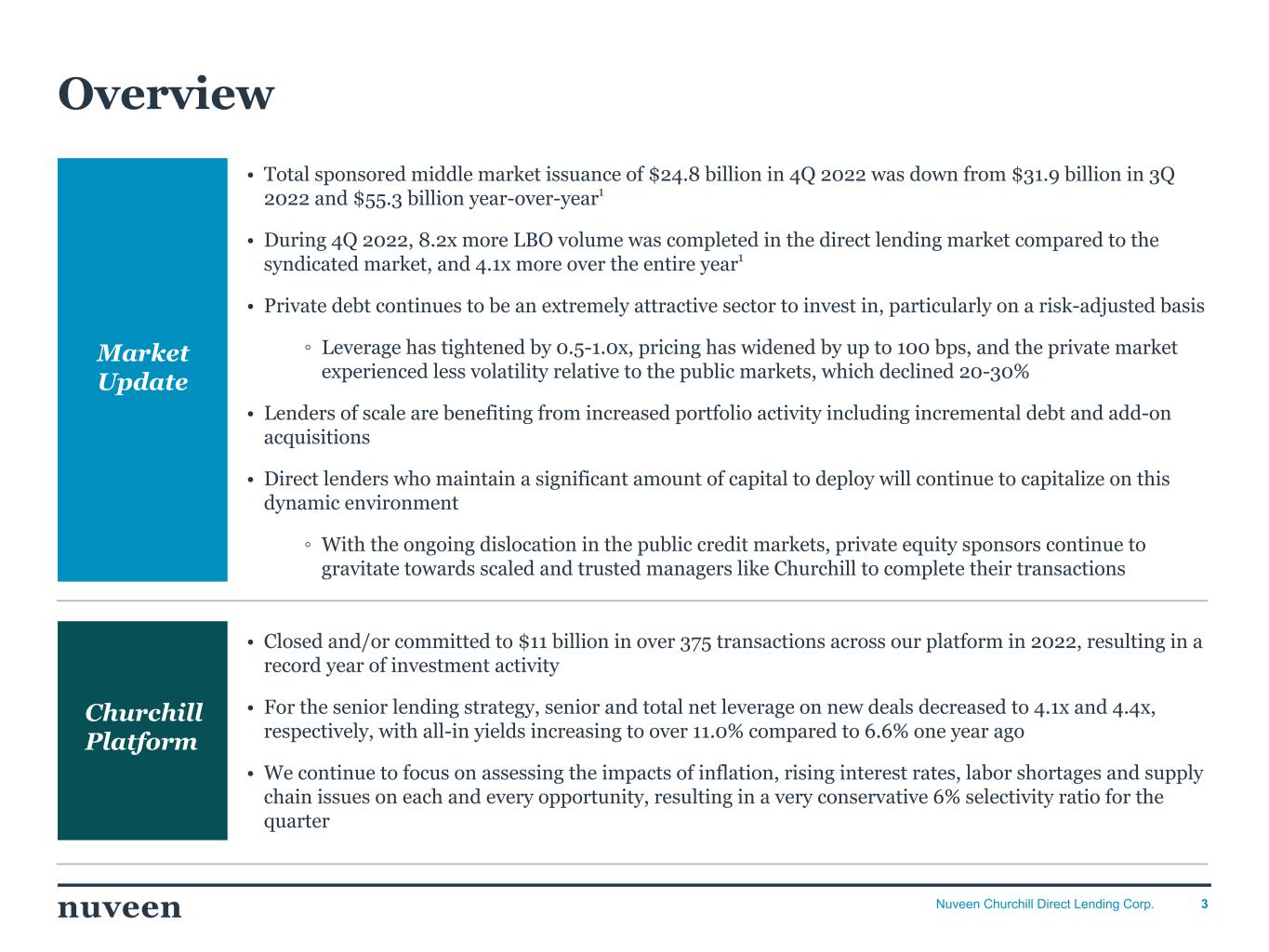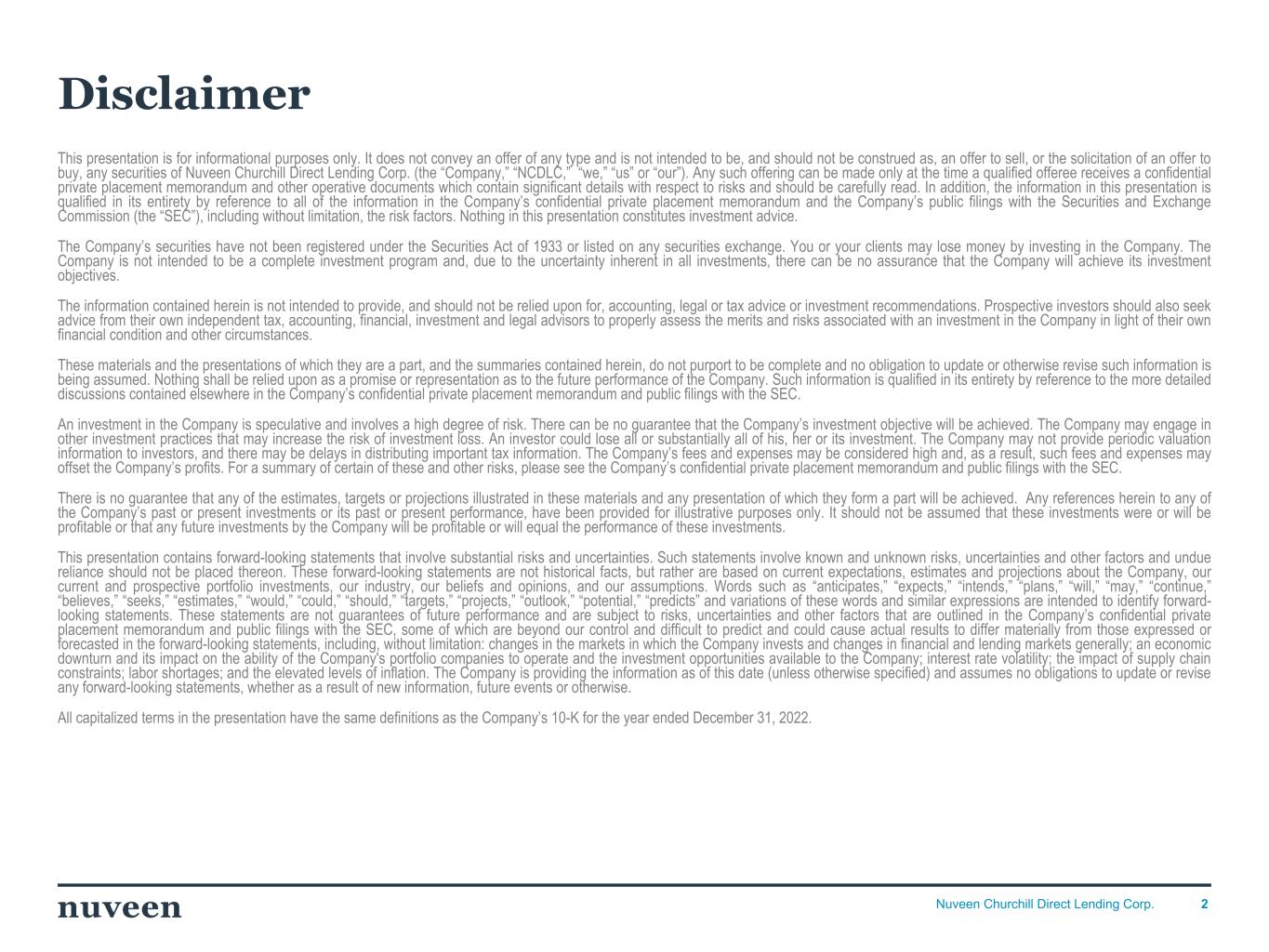 2Nuveen Churchill Direct Lending Corp. Disclaimer This presentation is for informational purposes only. It does not convey an offer of any type and is not intended to be, and should not be construed as, an offer to sell, or the solicitation of an offer to buy, any securities of Nuveen Churchill Direct Lending Corp. (the “Company,” “NCDLC,” “we,” “us” or “our”). Any such offering can be made only at the time a qualified offeree receives a confidential private placement memorandum and other operative documents which contain significant details with respect to risks and should be carefully read. In addition, the information in this presentation is qualified in its entirety by reference to all of the information in the Company’s confidential private placement memorandum and the Company’s public filings with the Securities and Exchange Commission (the “SEC”), including without limitation, the risk factors. Nothing in this presentation constitutes investment advice. The Company’s securities have not been registered under the Securities Act of 1933 or listed on any securities exchange. You or your clients may lose money by investing in the Company. The Company is not intended to be a complete investment program and, due to the uncertainty inherent in all investments, there can be no assurance that the Company will achieve its investment objectives. The information contained herein is not intended to provide, and should not be relied upon for, accounting, legal or tax advice or investment recommendations. Prospective investors should also seek advice from their own independent tax, accounting, financial, investment and legal advisors to properly assess the merits and risks associated with an investment in the Company in light of their own financial condition and other circumstances. These materials and the presentations of which they are a part, and the summaries contained herein, do not purport to be complete and no obligation to update or otherwise revise such information is being assumed. Nothing shall be relied upon as a promise or representation as to the future performance of the Company. Such information is qualified in its entirety by reference to the more detailed discussions contained elsewhere in the Company’s confidential private placement memorandum and public filings with the SEC. An investment in the Company is speculative and involves a high degree of risk. There can be no guarantee that the Company’s investment objective will be achieved. The Company may engage in other investment practices that may increase the risk of investment loss. An investor could lose all or substantially all of his, her or its investment. The Company may not provide periodic valuation information to investors, and there may be delays in distributing important tax information. The Company’s fees and expenses may be considered high and, as a result, such fees and expenses may offset the Company’s profits. For a summary of certain of these and other risks, please see the Company’s confidential private placement memorandum and public filings with the SEC. There is no guarantee that any of the estimates, targets or projections illustrated in these materials and any presentation of which they form a part will be achieved. Any references herein to any of the Company’s past or present investments or its past or present performance, have been provided for illustrative purposes only. It should not be assumed that these investments were or will be profitable or that any future investments by the Company will be profitable or will equal the performance of these investments. This presentation contains forward-looking statements that involve substantial risks and uncertainties. Such statements involve known and unknown risks, uncertainties and other factors and undue reliance should not be placed thereon. These forward-looking statements are not historical facts, but rather are based on current expectations, estimates and projections about the Company, our current and prospective portfolio investments, our industry, our beliefs and opinions, and our assumptions. Words such as “anticipates,” “expects,” “intends,” “plans,” “will,” “may,” “continue,” “believes,” “seeks,” “estimates,” “would,” “could,” “should,” “targets,” “projects,” “outlook,” “potential,” “predicts” and variations of these words and similar expressions are intended to identify forward- looking statements. These statements are not guarantees of future performance and are subject to risks, uncertainties and other factors that are outlined in the Company’s confidential private placement memorandum and public filings with the SEC, some of which are beyond our control and difficult to predict and could cause actual results to differ materially from those expressed or forecasted in the forward-looking statements, including, without limitation: changes in the markets in which the Company invests and changes in financial and lending markets generally; an economic downturn and its impact on the ability of the Company's portfolio companies to operate and the investment opportunities available to the Company; interest rate volatility; the impact of supply chain constraints; labor shortages; and the elevated levels of inflation. The Company is providing the information as of this date (unless otherwise specified) and assumes no obligations to update or revise any forward-looking statements, whether as a result of new information, future events or otherwise. All capitalized terms in the presentation have the same definitions as the Company’s 10-K for the year ended December 31, 2022.