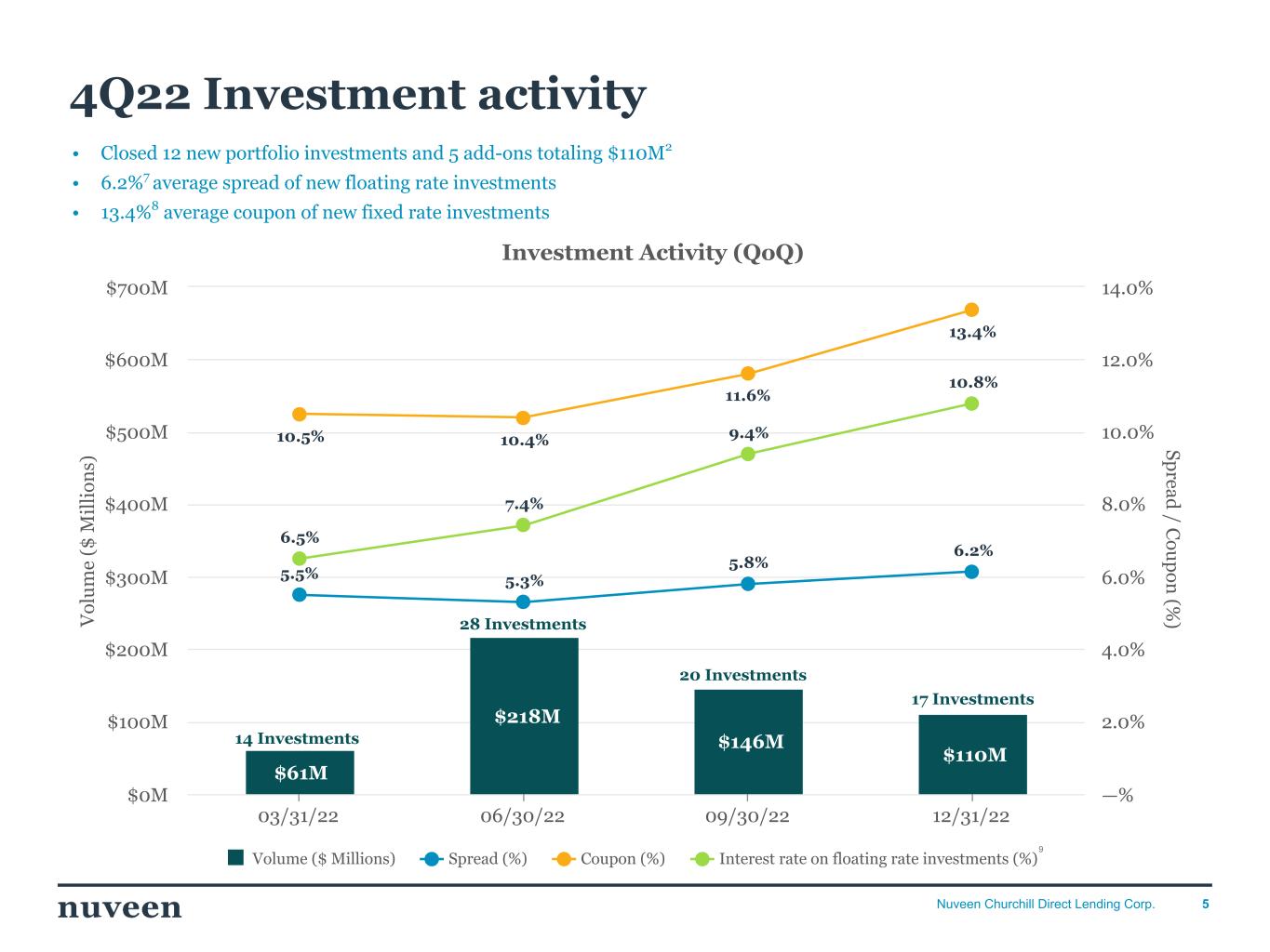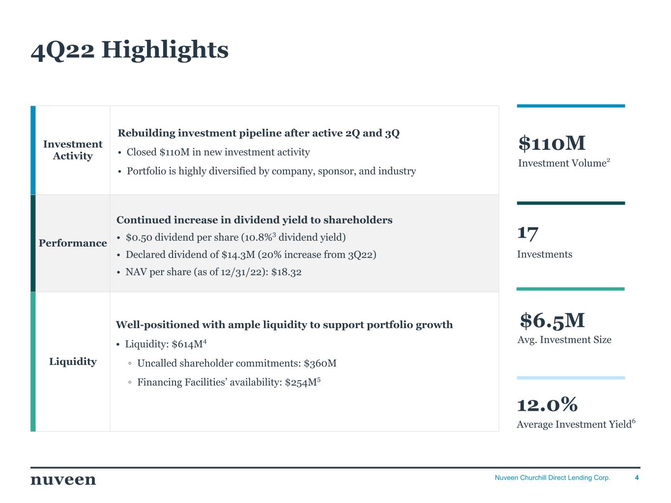 3Nuveen Churchill Direct Lending Corp. • Closed and/or committed to $11 billion in over 375 transactions across our platform in 2022, resulting in a record year of investment activity • For the senior lending strategy, senior and total net leverage on new deals decreased to 4.1x and 4.4x, respectively, with all-in yields increasing to over 11.0% compared to 6.6% one year ago • We continue to focus on assessing the impacts of inflation, rising interest rates, labor shortages and supply chain issues on each and every opportunity, resulting in a very conservative 6% selectivity ratio for the quarter Overview Market Update Churchill Platform • Total sponsored middle market issuance of $24.8 billion in 4Q 2022 was down from $31.9 billion in 3Q 2022 and $55.3 billion year-over-year1 • During 4Q 2022, 8.2x more LBO volume was completed in the direct lending market compared to the syndicated market, and 4.1x more over the entire year1 • Private debt continues to be an extremely attractive sector to invest in, particularly on a risk-adjusted basis ◦ Leverage has tightened by 0.5-1.0x, pricing has widened by up to 100 bps, and the private market experienced less volatility relative to the public markets, which declined 20-30% • Lenders of scale are benefiting from increased portfolio activity including incremental debt and add-on acquisitions • Direct lenders who maintain a significant amount of capital to deploy will continue to capitalize on this dynamic environment ◦ With the ongoing dislocation in the public credit markets, private equity sponsors continue to gravitate towards scaled and trusted managers like Churchill to complete their transactions