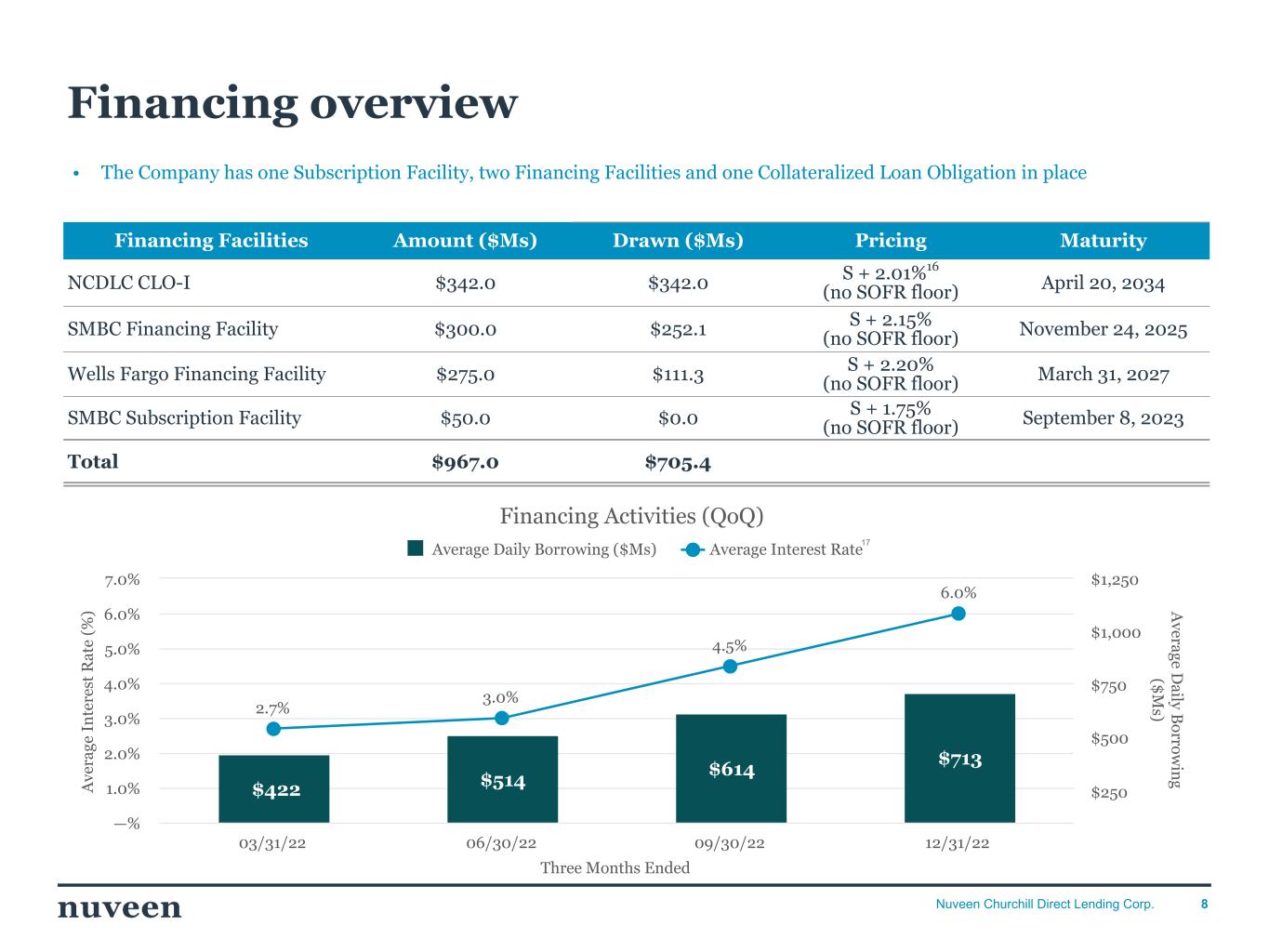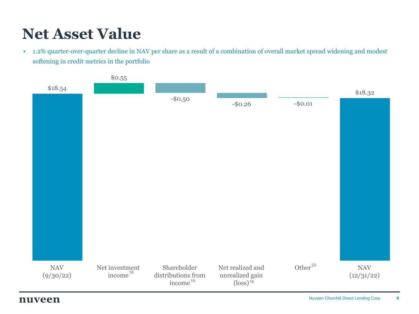 8Nuveen Churchill Direct Lending Corp. • The Company has one Subscription Facility, two Financing Facilities and one Collateralized Loan Obligation in place Financing overview Financing Facilities Amount ($Ms) Drawn ($Ms) Pricing Maturity NCDLC CLO-I $342.0 $342.0 S + 2.01%16 (no SOFR floor) April 20, 2034 SMBC Financing Facility $300.0 $252.1 S + 2.15% (no SOFR floor) November 24, 2025 Wells Fargo Financing Facility $275.0 $111.3 S + 2.20% (no SOFR floor) March 31, 2027 SMBC Subscription Facility $50.0 $0.0 S + 1.75% (no SOFR floor) September 8, 2023 Total $967.0 $705.4 Three Months Ended A ve ra ge I n te re st R at e (% ) A verage D aily B orrow in g ($ M s) Financing Activities (QoQ) $422 $514 $614 $713 2.7% 3.0% 4.5% 6.0% Average Daily Borrowing ($Ms) Average Interest Rate 03/31/22 06/30/22 09/30/22 12/31/22 —% 1.0% 2.0% 3.0% 4.0% 5.0% 6.0% 7.0% $250 $500 $750 $1,000 $1,250 17 PLEASE DO NOT TOUCH THE FORMATTING (MOVE AROUND BOXES, CHANGE CHARTS ETC.) THANK YOU!!!