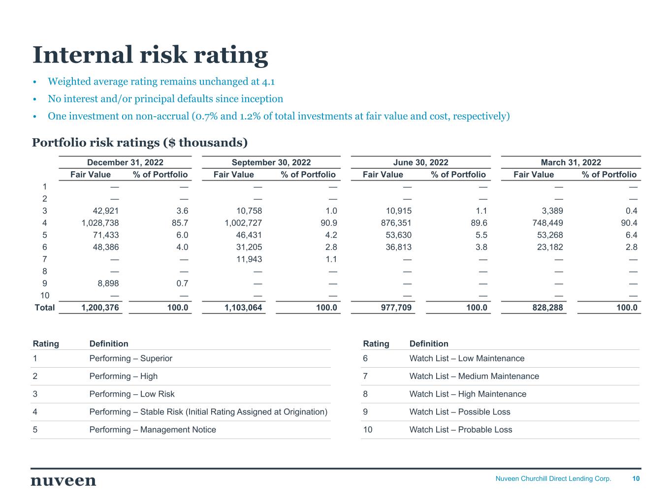 5Nuveen Churchill Direct Lending Corp. V ol u m e ($ M il li on s) Sp read / C ou p on (% ) Investment Activity (QoQ) $61M $218M $146M $110M 5.5% 5.3% 5.8% 6.2% 10.5% 10.4% 11.6% 13.4% 6.5% 7.4% 9.4% 10.8% Volume ($ Millions) Spread (%) Coupon (%) Interest rate on floating rate investments (%) 03/31/22 06/30/22 09/30/22 12/31/22 $0M $100M $200M $300M $400M $500M $600M $700M —% 2.0% 4.0% 6.0% 8.0% 10.0% 12.0% 14.0% • Closed 12 new portfolio investments and 5 add-ons totaling $110M2 • 6.2%7 average spread of new floating rate investments • 13.4%8 average coupon of new fixed rate investments 4Q22 Investment activity 20 Investments 17 Investments 14 Investments 28 Investments 9 PLEASE DO NOT TOUCH THE FORMATTING (MOVE AROUND BOXES, CHANGE CHARTS ETC.) THANK YOU!!!