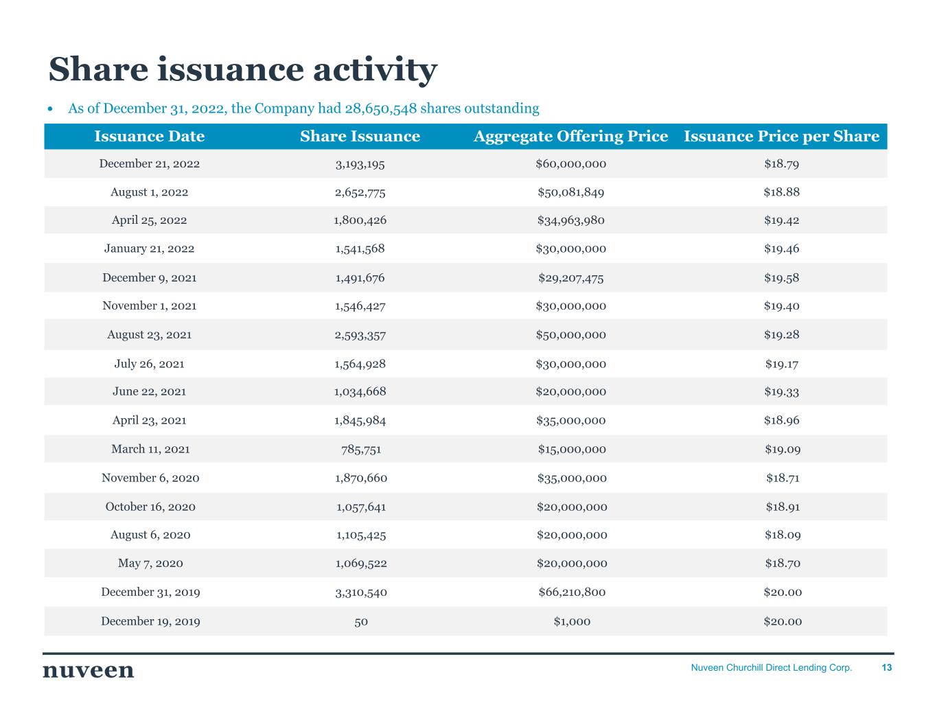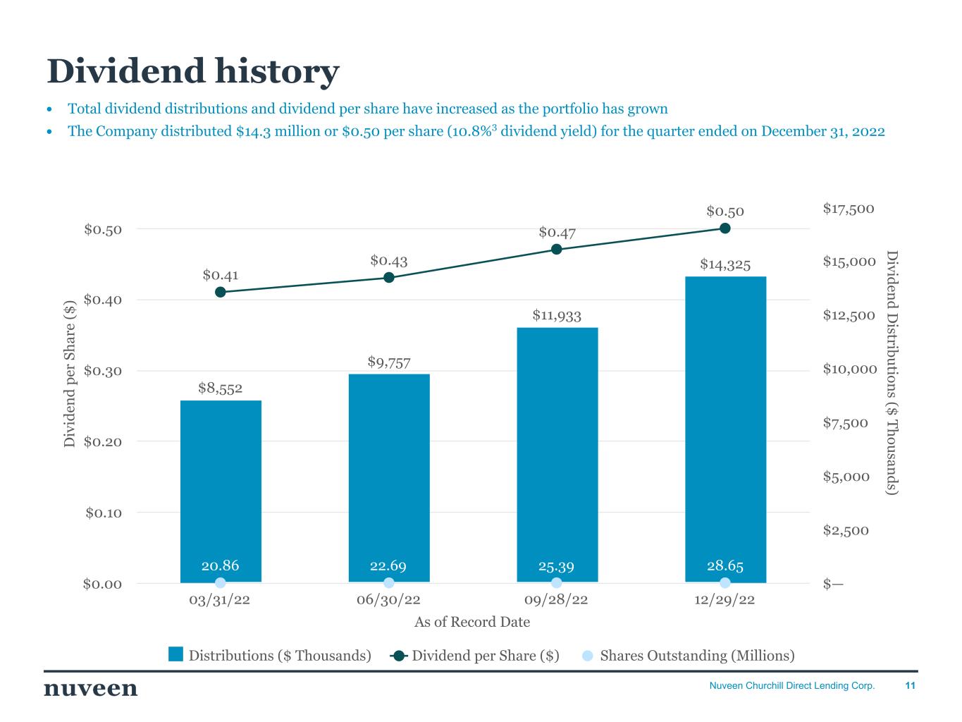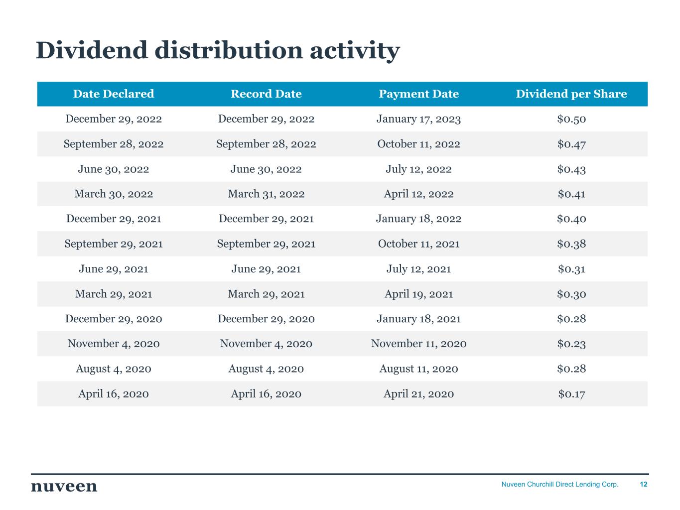 12Nuveen Churchill Direct Lending Corp. Dividend distribution activity Date Declared Record Date Payment Date Dividend per Share December 29, 2022 December 29, 2022 January 17, 2023 $0.50 September 28, 2022 September 28, 2022 October 11, 2022 $0.47 June 30, 2022 June 30, 2022 July 12, 2022 $0.43 March 30, 2022 March 31, 2022 April 12, 2022 $0.41 December 29, 2021 December 29, 2021 January 18, 2022 $0.40 September 29, 2021 September 29, 2021 October 11, 2021 $0.38 June 29, 2021 June 29, 2021 July 12, 2021 $0.31 March 29, 2021 March 29, 2021 April 19, 2021 $0.30 December 29, 2020 December 29, 2020 January 18, 2021 $0.28 November 4, 2020 November 4, 2020 November 11, 2020 $0.23 August 4, 2020 August 4, 2020 August 11, 2020 $0.28 April 16, 2020 April 16, 2020 April 21, 2020 $0.17