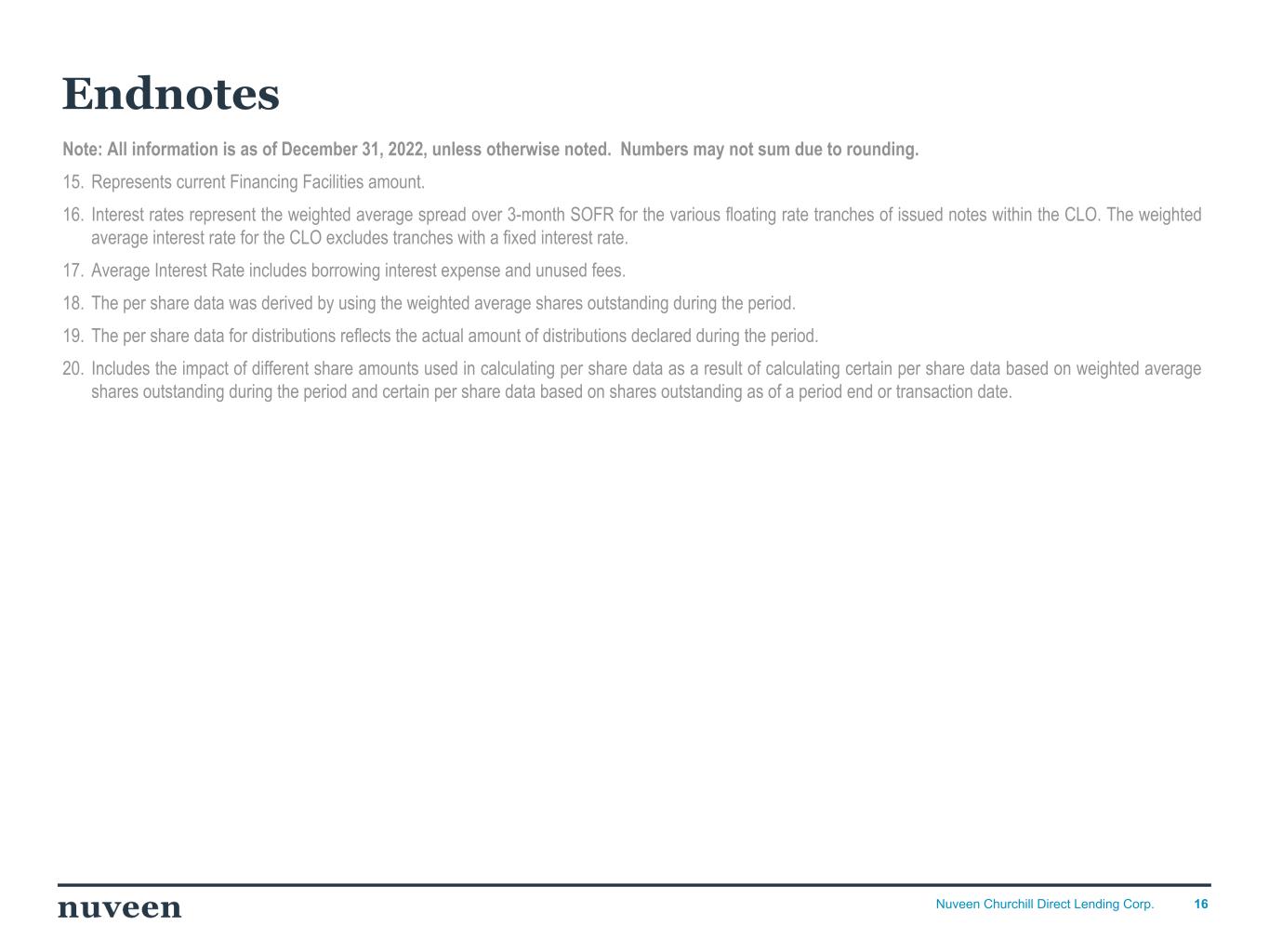 15Nuveen Churchill Direct Lending Corp. Note: All information is as of December 31, 2022, unless otherwise noted. Numbers may not sum due to rounding. 1. Source: Refinitiv LPC’s 4Q22 Sponsored Middle Market Private Deals Analysis (January 2023). 2. Reflects the par amount of total new investment activity for the three months ended December 31, 2022. Investment Activity does not include draws on existing Delayed Draw Term Loans and partial paydowns. 3. Annualized dividend yield is the annualized total quarterly dividend per share divided by NAV per share as of December 31, 2022. 4. Represents the sum of uncalled shareholder commitments of $360M and Financing Facilities availability of $254M. 5. Available for borrowing based on the computation of collateral to support the borrowings and subject to compliance with applicable covenants and financial ratios. 6. Represents the unlevered weighted average spread plus the greater of 3-Month base rate, or base rate floor, adjusted for credit spread, if applicable, plus amortization of OID over 3-year assumed loan life. 3-Month SOFR as of December 31, 2022 was 4.59% 3-Month LIBOR as of December 31, 2022 was 4.77%. 7. Average Spread is calculated based off of par amount. 8. Average Coupon is calculated based off of par amount. Average coupon includes 63% cash coupon and 37% PIK. 9. Interest rate utilizes the floating rate investment spread plus the greater of 3-Month base rate, or base rate floor, if applicable for each respective transaction (LIBOR as of March 31, 2022 was 0.96%; SOFR as of March 31, 2022 was 0.68%; LIBOR as of June 30, 2022 was 2.29%; SOFR as of June 30, 2022 was 2.12%; LIBOR as of September 30, 2022 was 3.75%; SOFR as of September 30, 2022 was 3.59%; LIBOR as of December 31, 2022 was 4.77%; SOFR as of December 31, 2022 was 4.59%). 10. Represents total investment portfolio at Fair Value. Total par value of debt investment commitments is $1,347M which includes approximately $127M of unfunded delayed draw term loan commitments. 11. Weighted average yield on debt and income producing investments, at fair value. The weighted average yield of the Company’s debt and income producing securities is not the same as a return on investment for our shareholders but, rather, relates to our investment portfolio and is calculated before the payment of all of our and our subsidiaries’ fees and expenses. The weighted average yield was computed using the effective interest rates as of each respective date, including accretion of original issue discount, but excluding investments on non-accrual status, if any. 12. Average Position Size (at fair value) is calculated as a percentage of Committed Capital. Committed Capital includes Equity Commitment of $905M as of December 31, 2022 and $967M from Financing Facilities. 13. Investment Type reflects classification at issuance. 14. 40% of first lien term loans are unitranche positions. Endnotes