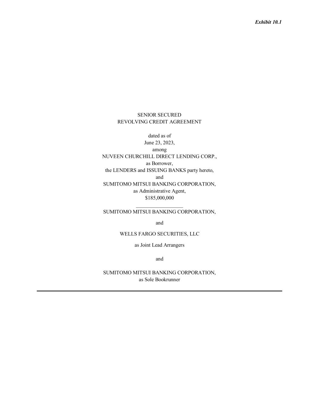 Exhibit 10.1 SENIOR SECURED REVOLVING CREDIT AGREEMENT dated as of June 23, 2023, among NUVEEN CHURCHILL DIRECT LENDING CORP., as Borrower, the LENDERS and ISSUING BANKS party hereto, and SUMITOMO MITSUI BANKING CORPORATION, as Administrative Agent, $185,000,000 __________________ SUMITOMO MITSUI BANKING CORPORATION, and WELLS FARGO SECURITIES, LLC as Joint Lead Arrangers and SUMITOMO MITSUI BANKING CORPORATION, as Sole Bookrunner