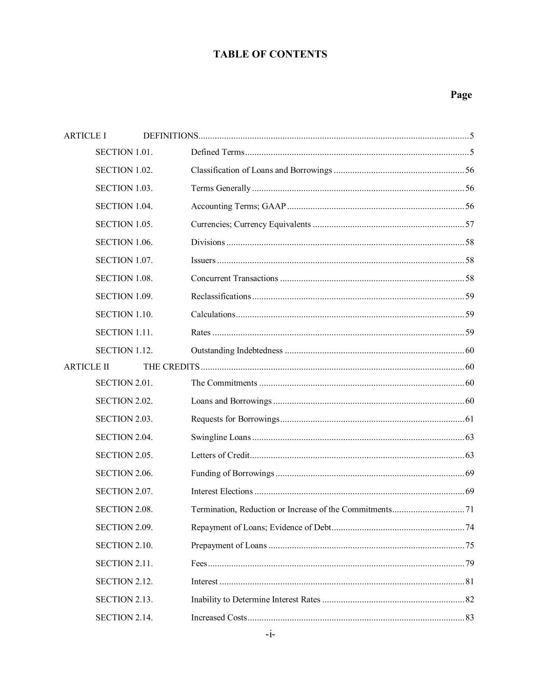 TABLE OF CONTENTS Page -i- ARTICLE I DEFINITIONS .................................................................................................................... 5 SECTION 1.01. Defined Terms ................................................................................................ 5 SECTION 1.02. Classification of Loans and Borrowings ........................................................ 56 SECTION 1.03. Terms Generally ........................................................................................... 56 SECTION 1.04. Accounting Terms; GAAP ............................................................................ 56 SECTION 1.05. Currencies; Currency Equivalents ................................................................. 57 SECTION 1.06. Divisions ...................................................................................................... 58 SECTION 1.07. Issuers .......................................................................................................... 58 SECTION 1.08. Concurrent Transactions ............................................................................... 58 SECTION 1.09. Reclassifications ........................................................................................... 59 SECTION 1.10. Calculations .................................................................................................. 59 SECTION 1.11. Rates ............................................................................................................ 59 SECTION 1.12. Outstanding Indebtedness ............................................................................. 60 ARTICLE II THE CREDITS ................................................................................................................. 60 SECTION 2.01. The Commitments ........................................................................................ 60 SECTION 2.02. Loans and Borrowings .................................................................................. 60 SECTION 2.03. Requests for Borrowings ............................................................................... 61 SECTION 2.04. Swingline Loans ........................................................................................... 63 SECTION 2.05. Letters of Credit ............................................................................................ 63 SECTION 2.06. Funding of Borrowings ................................................................................. 69 SECTION 2.07. Interest Elections .......................................................................................... 69 SECTION 2.08. Termination, Reduction or Increase of the Commitments ............................... 71 SECTION 2.09. Repayment of Loans; Evidence of Debt ......................................................... 74 SECTION 2.10. Prepayment of Loans .................................................................................... 75 SECTION 2.11. Fees .............................................................................................................. 79 SECTION 2.12. Interest ......................................................................................................... 81 SECTION 2.13. Inability to Determine Interest Rates ............................................................. 82 SECTION 2.14. Increased Costs ............................................................................................. 83