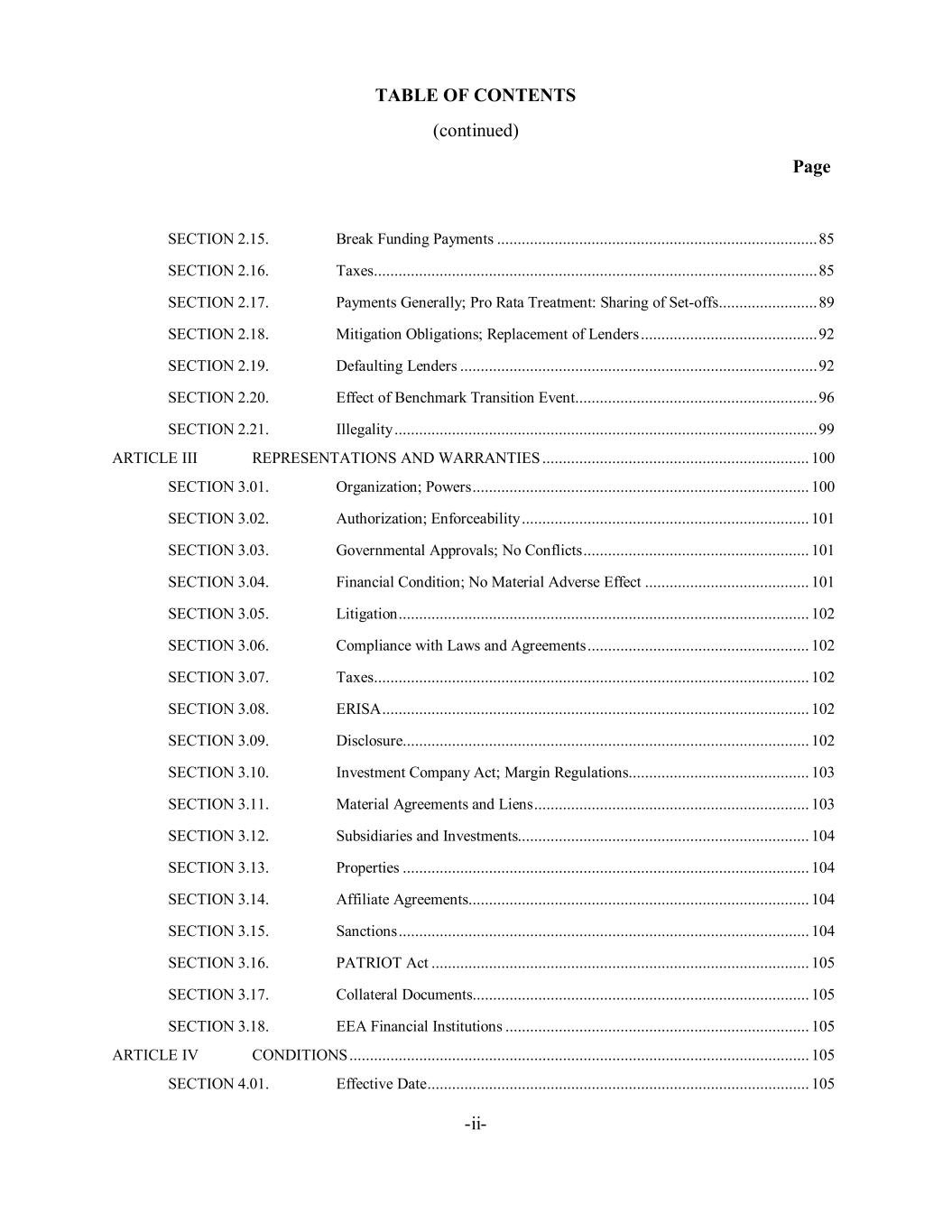 TABLE OF CONTENTS (continued) Page -ii- SECTION 2.15. Break Funding Payments .............................................................................. 85 SECTION 2.16. Taxes ............................................................................................................ 85 SECTION 2.17. Payments Generally; Pro Rata Treatment: Sharing of Set-offs ........................ 89 SECTION 2.18. Mitigation Obligations; Replacement of Lenders ........................................... 92 SECTION 2.19. Defaulting Lenders ....................................................................................... 92 SECTION 2.20. Effect of Benchmark Transition Event ........................................................... 96 SECTION 2.21. Illegality ....................................................................................................... 99 ARTICLE III REPRESENTATIONS AND WARRANTIES ................................................................. 100 SECTION 3.01. Organization; Powers .................................................................................. 100 SECTION 3.02. Authorization; Enforceability ...................................................................... 101 SECTION 3.03. Governmental Approvals; No Conflicts ....................................................... 101 SECTION 3.04. Financial Condition; No Material Adverse Effect ........................................ 101 SECTION 3.05. Litigation .................................................................................................... 102 SECTION 3.06. Compliance with Laws and Agreements ...................................................... 102 SECTION 3.07. Taxes .......................................................................................................... 102 SECTION 3.08. ERISA ........................................................................................................ 102 SECTION 3.09. Disclosure................................................................................................... 102 SECTION 3.10. Investment Company Act; Margin Regulations ............................................ 103 SECTION 3.11. Material Agreements and Liens ................................................................... 103 SECTION 3.12. Subsidiaries and Investments....................................................................... 104 SECTION 3.13. Properties ................................................................................................... 104 SECTION 3.14. Affiliate Agreements ................................................................................... 104 SECTION 3.15. Sanctions .................................................................................................... 104 SECTION 3.16. PATRIOT Act ............................................................................................ 105 SECTION 3.17. Collateral Documents .................................................................................. 105 SECTION 3.18. EEA Financial Institutions .......................................................................... 105 ARTICLE IV CONDITIONS ................................................................................................................ 105 SECTION 4.01. Effective Date ............................................................................................. 105