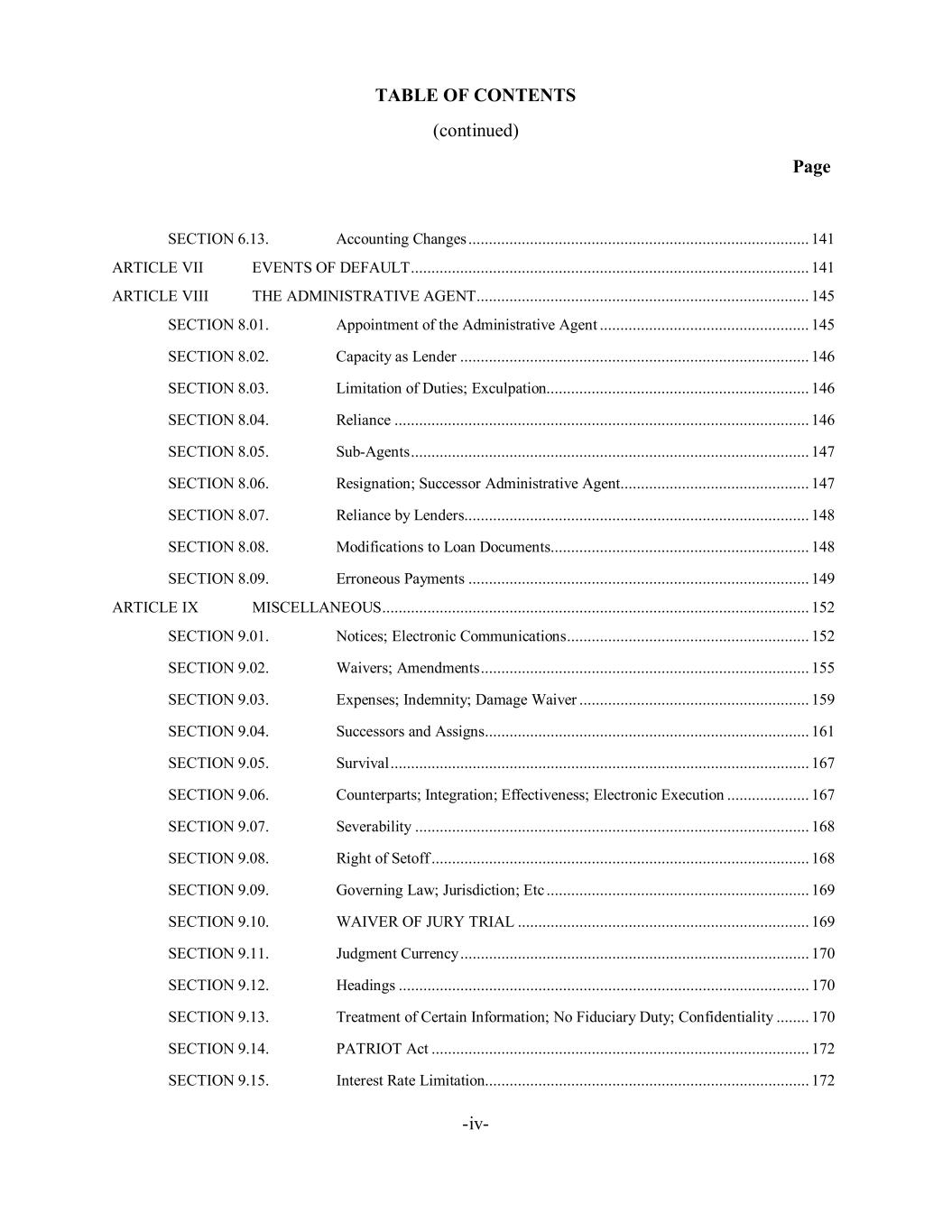 TABLE OF CONTENTS (continued) Page -iv- SECTION 6.13. Accounting Changes ................................................................................... 141 ARTICLE VII EVENTS OF DEFAULT ................................................................................................. 141 ARTICLE VIII THE ADMINISTRATIVE AGENT ................................................................................. 145 SECTION 8.01. Appointment of the Administrative Agent ................................................... 145 SECTION 8.02. Capacity as Lender ..................................................................................... 146 SECTION 8.03. Limitation of Duties; Exculpation................................................................ 146 SECTION 8.04. Reliance ..................................................................................................... 146 SECTION 8.05. Sub-Agents ................................................................................................. 147 SECTION 8.06. Resignation; Successor Administrative Agent .............................................. 147 SECTION 8.07. Reliance by Lenders .................................................................................... 148 SECTION 8.08. Modifications to Loan Documents ............................................................... 148 SECTION 8.09. Erroneous Payments ................................................................................... 149 ARTICLE IX MISCELLANEOUS ........................................................................................................ 152 SECTION 9.01. Notices; Electronic Communications ........................................................... 152 SECTION 9.02. Waivers; Amendments ................................................................................ 155 SECTION 9.03. Expenses; Indemnity; Damage Waiver ........................................................ 159 SECTION 9.04. Successors and Assigns ............................................................................... 161 SECTION 9.05. Survival ...................................................................................................... 167 SECTION 9.06. Counterparts; Integration; Effectiveness; Electronic Execution .................... 167 SECTION 9.07. Severability ................................................................................................ 168 SECTION 9.08. Right of Setoff ............................................................................................ 168 SECTION 9.09. Governing Law; Jurisdiction; Etc ................................................................ 169 SECTION 9.10. WAIVER OF JURY TRIAL ....................................................................... 169 SECTION 9.11. Judgment Currency ..................................................................................... 170 SECTION 9.12. Headings .................................................................................................... 170 SECTION 9.13. Treatment of Certain Information; No Fiduciary Duty; Confidentiality ........ 170 SECTION 9.14. PATRIOT Act ............................................................................................ 172 SECTION 9.15. Interest Rate Limitation............................................................................... 172