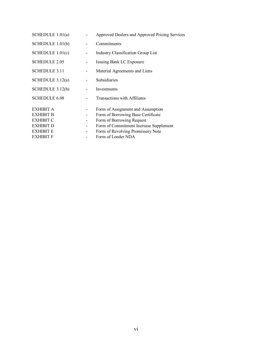 vi SCHEDULE 1.01(a) - Approved Dealers and Approved Pricing Services SCHEDULE 1.01(b) - Commitments SCHEDULE 1.01(c) - Industry Classification Group List SCHEDULE 2.05 - Issuing Bank LC Exposure SCHEDULE 3.11 - Material Agreements and Liens SCHEDULE 3.12(a) - Subsidiaries SCHEDULE 3.12(b) - Investments SCHEDULE 6.08 - Transactions with Affiliates EXHIBIT A - Form of Assignment and Assumption EXHIBIT B - Form of Borrowing Base Certificate EXHIBIT C - Form of Borrowing Request EXHIBIT D - Form of Commitment Increase Supplement EXHIBIT E - Form of Revolving Promissory Note EXHIBIT F - Form of Lender NDA