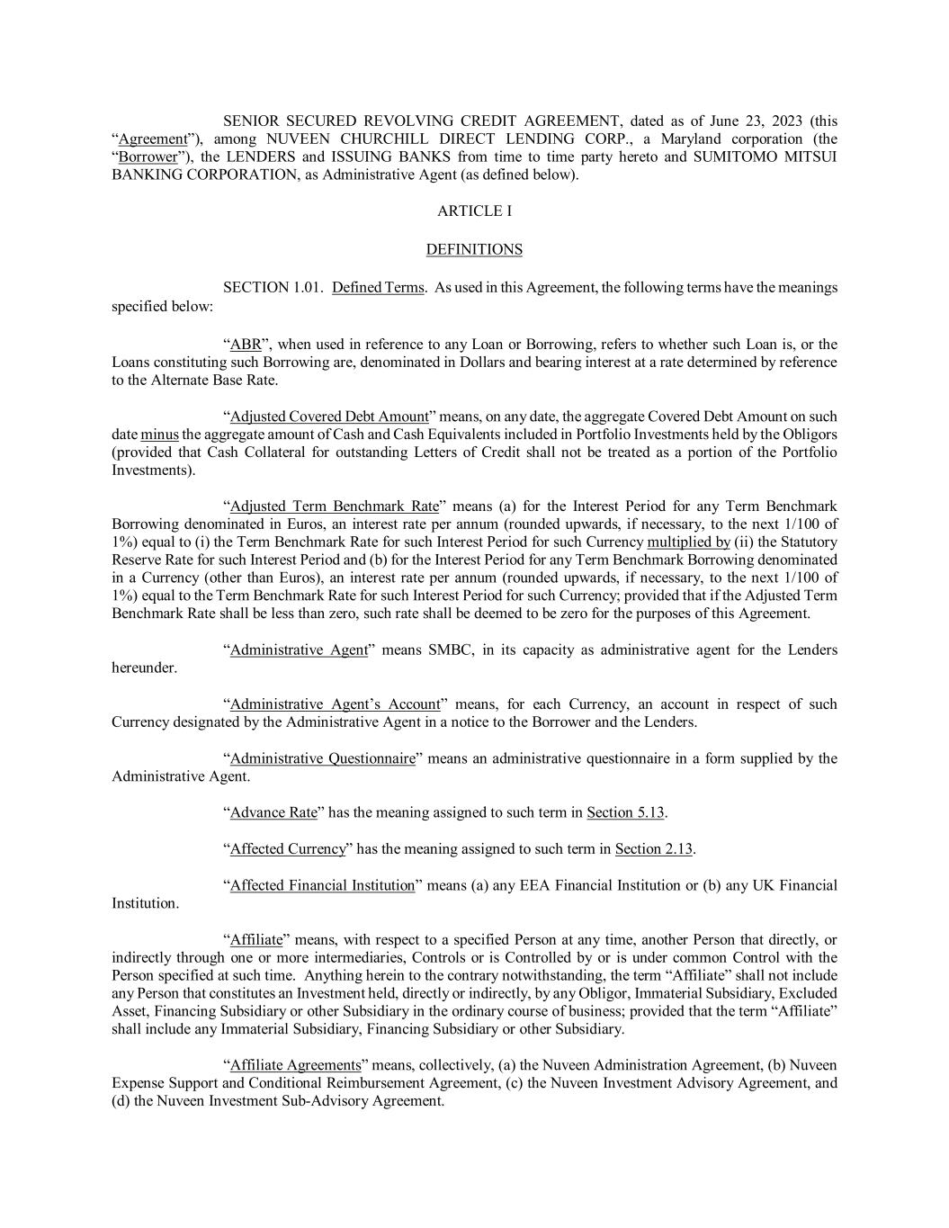 SENIOR SECURED REVOLVING CREDIT AGREEMENT, dated as of June 23, 2023 (this “Agreement”), among NUVEEN CHURCHILL DIRECT LENDING CORP., a Maryland corporation (the “Borrower”), the LENDERS and ISSUING BANKS from time to time party hereto and SUMITOMO MITSUI BANKING CORPORATION, as Administrative Agent (as defined below). ARTICLE I DEFINITIONS SECTION 1.01. Defined Terms. As used in this Agreement, the following terms have the meanings specified below: “ABR”, when used in reference to any Loan or Borrowing, refers to whether such Loan is, or the Loans constituting such Borrowing are, denominated in Dollars and bearing interest at a rate determined by reference to the Alternate Base Rate. “Adjusted Covered Debt Amount” means, on any date, the aggregate Covered Debt Amount on such date minus the aggregate amount of Cash and Cash Equivalents included in Portfolio Investments held by the Obligors (provided that Cash Collateral for outstanding Letters of Credit shall not be treated as a portion of the Portfolio Investments). “Adjusted Term Benchmark Rate” means (a) for the Interest Period for any Term Benchmark Borrowing denominated in Euros, an interest rate per annum (rounded upwards, if necessary, to the next 1/100 of 1%) equal to (i) the Term Benchmark Rate for such Interest Period for such Currency multiplied by (ii) the Statutory Reserve Rate for such Interest Period and (b) for the Interest Period for any Term Benchmark Borrowing denominated in a Currency (other than Euros), an interest rate per annum (rounded upwards, if necessary, to the next 1/100 of 1%) equal to the Term Benchmark Rate for such Interest Period for such Currency; provided that if the Adjusted Term Benchmark Rate shall be less than zero, such rate shall be deemed to be zero for the purposes of this Agreement. “Administrative Agent” means SMBC, in its capacity as administrative agent for the Lenders hereunder. “Administrative Agent’s Account” means, for each Currency, an account in respect of such Currency designated by the Administrative Agent in a notice to the Borrower and the Lenders. “Administrative Questionnaire” means an administrative questionnaire in a form supplied by the Administrative Agent. “Advance Rate” has the meaning assigned to such term in Section 5.13. “Affected Currency” has the meaning assigned to such term in Section 2.13. “Affected Financial Institution” means (a) any EEA Financial Institution or (b) any UK Financial Institution. “Affiliate” means, with respect to a specified Person at any time, another Person that directly, or indirectly through one or more intermediaries, Controls or is Controlled by or is under common Control with the Person specified at such time. Anything herein to the contrary notwithstanding, the term “Affiliate” shall not include any Person that constitutes an Investment held, directly or indirectly, by any Obligor, Immaterial Subsidiary, Excluded Asset, Financing Subsidiary or other Subsidiary in the ordinary course of business; provided that the term “Affiliate” shall include any Immaterial Subsidiary, Financing Subsidiary or other Subsidiary. “Affiliate Agreements” means, collectively, (a) the Nuveen Administration Agreement, (b) Nuveen Expense Support and Conditional Reimbursement Agreement, (c) the Nuveen Investment Advisory Agreement, and (d) the Nuveen Investment Sub-Advisory Agreement.