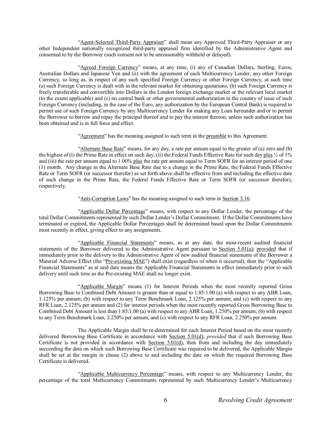 6 Revolving Credit Agreement “Agent-Selected Third-Party Appraiser” shall mean any Approved Third-Party Appraiser or any other Independent nationally recognized third-party appraisal firm identified by the Administrative Agent and consented to by the Borrower (such consent not to be unreasonably withheld or delayed). “Agreed Foreign Currency” means, at any time, (i) any of Canadian Dollars, Sterling, Euros, Australian Dollars and Japanese Yen and (ii) with the agreement of each Multicurrency Lender, any other Foreign Currency, so long as, in respect of any such specified Foreign Currency or other Foreign Currency, at such time (a) such Foreign Currency is dealt with in the relevant market for obtaining quotations, (b) such Foreign Currency is freely transferable and convertible into Dollars in the London foreign exchange market or the relevant local market (to the extent applicable) and (c) no central bank or other governmental authorization in the country of issue of such Foreign Currency (including, in the case of the Euro, any authorization by the European Central Bank) is required to permit use of such Foreign Currency by any Multicurrency Lender for making any Loan hereunder and/or to permit the Borrower to borrow and repay the principal thereof and to pay the interest thereon, unless such authorization has been obtained and is in full force and effect. “Agreement” has the meaning assigned to such term in the preamble to this Agreement. “Alternate Base Rate” means, for any day, a rate per annum equal to the greater of (a) zero and (b) the highest of (i) the Prime Rate in effect on such day, (ii) the Federal Funds Effective Rate for such day plus ½ of 1% and (iii) the rate per annum equal to 1.00% plus the rate per annum equal to Term SOFR for an interest period of one (1) month. Any change in the Alternate Base Rate due to a change in the Prime Rate, the Federal Funds Effective Rate or Term SOFR (or successor therefor) as set forth above shall be effective from and including the effective date of such change in the Prime Rate, the Federal Funds Effective Rate or Term SOFR (or successor therefor), respectively. “Anti-Corruption Laws” has the meaning assigned to such term in Section 3.16. “Applicable Dollar Percentage” means, with respect to any Dollar Lender, the percentage of the total Dollar Commitments represented by such Dollar Lender’s Dollar Commitment. If the Dollar Commitments have terminated or expired, the Applicable Dollar Percentages shall be determined based upon the Dollar Commitments most recently in effect, giving effect to any assignments. “Applicable Financial Statements” means, as at any date, the most-recent audited financial statements of the Borrower delivered to the Administrative Agent pursuant to Section 5.01(a); provided that if immediately prior to the delivery to the Administrative Agent of new audited financial statements of the Borrower a Material Adverse Effect (the “Pre-existing MAE”) shall exist (regardless of when it occurred), then the “Applicable Financial Statements” as at said date means the Applicable Financial Statements in effect immediately prior to such delivery until such time as the Pre-existing MAE shall no longer exist. “Applicable Margin” means (1) for Interest Periods when the most recently reported Gross Borrowing Base to Combined Debt Amount is greater than or equal to 1.85:1.00 (a) with respect to any ABR Loan, 1.125% per annum; (b) with respect to any Term Benchmark Loan, 2.125% per annum; and (c) with respect to any RFR Loan, 2.125% per annum and (2) for interest periods when the most recently reported Gross Borrowing Base to Combined Debt Amount is less than 1.85:1.00 (a) with respect to any ABR Loan, 1.250% per annum; (b) with respect to any Term Benchmark Loan, 2.250% per annum; and (c) with respect to any RFR Loan, 2.250% per annum. The Applicable Margin shall be re-determined for each Interest Period based on the most recently delivered Borrowing Base Certificate in accordance with Section 5.01(d); provided that if such Borrowing Base Certificate is not provided in accordance with Section 5.01(d), then from and including the day immediately succeeding the date on which such Borrowing Base Certificate was required to be delivered, the Applicable Margin shall be set at the margin in clause (2) above to and including the date on which the required Borrowing Base Certificate is delivered. “Applicable Multicurrency Percentage” means, with respect to any Multicurrency Lender, the percentage of the total Multicurrency Commitments represented by such Multicurrency Lender’s Multicurrency