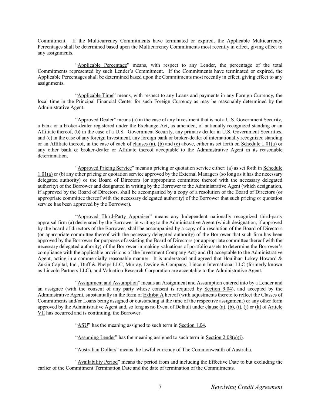 7 Revolving Credit Agreement Commitment. If the Multicurrency Commitments have terminated or expired, the Applicable Multicurrency Percentages shall be determined based upon the Multicurrency Commitments most recently in effect, giving effect to any assignments. “Applicable Percentage” means, with respect to any Lender, the percentage of the total Commitments represented by such Lender’s Commitment. If the Commitments have terminated or expired, the Applicable Percentages shall be determined based upon the Commitments most recently in effect, giving effect to any assignments. “Applicable Time” means, with respect to any Loans and payments in any Foreign Currency, the local time in the Principal Financial Center for such Foreign Currency as may be reasonably determined by the Administrative Agent. “Approved Dealer” means (a) in the case of any Investment that is not a U.S. Government Security, a bank or a broker-dealer registered under the Exchange Act, as amended, of nationally recognized standing or an Affiliate thereof, (b) in the case of a U.S. Government Security, any primary dealer in U.S. Government Securities, and (c) in the case of any foreign Investment, any foreign bank or broker-dealer of internationally recognized standing or an Affiliate thereof, in the case of each of clauses (a), (b) and (c) above, either as set forth on Schedule 1.01(a) or any other bank or broker-dealer or Affiliate thereof acceptable to the Administrative Agent in its reasonable determination. “Approved Pricing Service” means a pricing or quotation service either: (a) as set forth in Schedule 1.01(a) or (b) any other pricing or quotation service approved by the External Managers (so long as it has the necessary delegated authority) or the Board of Directors (or appropriate committee thereof with the necessary delegated authority) of the Borrower and designated in writing by the Borrower to the Administrative Agent (which designation, if approved by the Board of Directors, shall be accompanied by a copy of a resolution of the Board of Directors (or appropriate committee thereof with the necessary delegated authority) of the Borrower that such pricing or quotation service has been approved by the Borrower). “Approved Third-Party Appraiser” means any Independent nationally recognized third-party appraisal firm (a) designated by the Borrower in writing to the Administrative Agent (which designation, if approved by the board of directors of the Borrower, shall be accompanied by a copy of a resolution of the Board of Directors (or appropriate committee thereof with the necessary delegated authority) of the Borrower that such firm has been approved by the Borrower for purposes of assisting the Board of Directors (or appropriate committee thereof with the necessary delegated authority) of the Borrower in making valuations of portfolio assets to determine the Borrower’s compliance with the applicable provisions of the Investment Company Act) and (b) acceptable to the Administrative Agent, acting in a commercially reasonable manner. It is understood and agreed that Houlihan Lokey Howard & Zukin Capital, Inc., Duff & Phelps LLC, Murray, Devine & Company, Lincoln International LLC (formerly known as Lincoln Partners LLC), and Valuation Research Corporation are acceptable to the Administrative Agent. “Assignment and Assumption” means an Assignment and Assumption entered into by a Lender and an assignee (with the consent of any party whose consent is required by Section 9.04), and accepted by the Administrative Agent, substantially in the form of Exhibit A hereof (with adjustments thereto to reflect the Classes of Commitments and/or Loans being assigned or outstanding at the time of the respective assignment) or any other form approved by the Administrative Agent and, so long as no Event of Default under clause (a), (b), (i), (j) or (k) of Article VII has occurred and is continuing, the Borrower. “ASU” has the meaning assigned to such term in Section 1.04. “Assuming Lender” has the meaning assigned to such term in Section 2.08(e)(i). “Australian Dollars” means the lawful currency of The Commonwealth of Australia. “Availability Period” means the period from and including the Effective Date to but excluding the earlier of the Commitment Termination Date and the date of termination of the Commitments.
