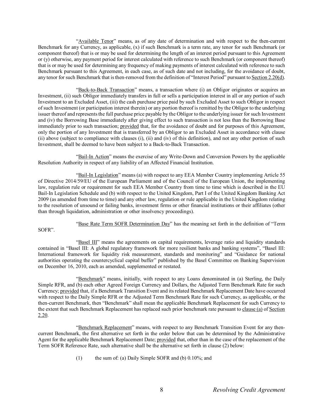 8 Revolving Credit Agreement “Available Tenor” means, as of any date of determination and with respect to the then-current Benchmark for any Currency, as applicable, (x) if such Benchmark is a term rate, any tenor for such Benchmark (or component thereof) that is or may be used for determining the length of an interest period pursuant to this Agreement or (y) otherwise, any payment period for interest calculated with reference to such Benchmark (or component thereof) that is or may be used for determining any frequency of making payments of interest calculated with reference to such Benchmark pursuant to this Agreement, in each case, as of such date and not including, for the avoidance of doubt, any tenor for such Benchmark that is then-removed from the definition of “Interest Period” pursuant to Section 2.20(d). “Back-to-Back Transaction” means, a transaction where (i) an Obligor originates or acquires an Investment, (ii) such Obligor immediately transfers in full or sells a participation interest in all or any portion of such Investment to an Excluded Asset, (iii) the cash purchase price paid by such Excluded Asset to such Obligor in respect of such Investment (or participation interest therein) or any portion thereof is remitted by the Obligor to the underlying issuer thereof and represents the full purchase price payable by the Obligor to the underlying issuer for such Investment and (iv) the Borrowing Base immediately after giving effect to such transaction is not less than the Borrowing Base immediately prior to such transaction; provided that, for the avoidance of doubt and for purposes of this Agreement, only the portion of any Investment that is transferred by an Obligor to an Excluded Asset in accordance with clause (ii) above (subject to compliance with clauses (i), (ii) and (iv) of this definition), and not any other portion of such Investment, shall be deemed to have been subject to a Back-to-Back Transaction. “Bail-In Action” means the exercise of any Write-Down and Conversion Powers by the applicable Resolution Authority in respect of any liability of an Affected Financial Institution. “Bail-In Legislation” means (a) with respect to any EEA Member Country implementing Article 55 of Directive 2014/59/EU of the European Parliament and of the Council of the European Union, the implementing law, regulation rule or requirement for such EEA Member Country from time to time which is described in the EU Bail-In Legislation Schedule and (b) with respect to the United Kingdom, Part I of the United Kingdom Banking Act 2009 (as amended from time to time) and any other law, regulation or rule applicable in the United Kingdom relating to the resolution of unsound or failing banks, investment firms or other financial institutions or their affiliates (other than through liquidation, administration or other insolvency proceedings). “Base Rate Term SOFR Determination Day” has the meaning set forth in the definition of “Term SOFR”. “Basel III” means the agreements on capital requirements, leverage ratio and liquidity standards contained in “Basel III: A global regulatory framework for more resilient banks and banking systems”, “Basel III: International framework for liquidity risk measurement, standards and monitoring” and “Guidance for national authorities operating the countercyclical capital buffer” published by the Basel Committee on Banking Supervision on December 16, 2010, each as amended, supplemented or restated. “Benchmark” means, initially, with respect to any Loans denominated in (a) Sterling, the Daily Simple RFR, and (b) each other Agreed Foreign Currency and Dollars, the Adjusted Term Benchmark Rate for such Currency; provided that, if a Benchmark Transition Event and its related Benchmark Replacement Date have occurred with respect to the Daily Simple RFR or the Adjusted Term Benchmark Rate for such Currency, as applicable, or the then-current Benchmark, then “Benchmark” shall mean the applicable Benchmark Replacement for such Currency to the extent that such Benchmark Replacement has replaced such prior benchmark rate pursuant to clause (a) of Section 2.20. “Benchmark Replacement” means, with respect to any Benchmark Transition Event for any then- current Benchmark, the first alternative set forth in the order below that can be determined by the Administrative Agent for the applicable Benchmark Replacement Date; provided that, other than in the case of the replacement of the Term SOFR Reference Rate, such alternative shall be the alternative set forth in clause (2) below: (1) the sum of: (a) Daily Simple SOFR and (b) 0.10%; and