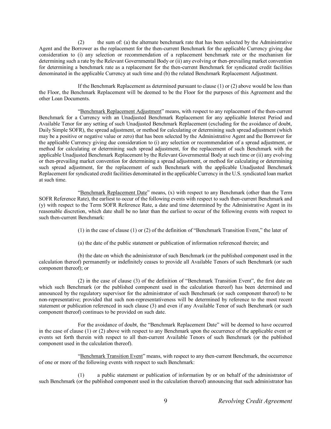 9 Revolving Credit Agreement (2) the sum of: (a) the alternate benchmark rate that has been selected by the Administrative Agent and the Borrower as the replacement for the then-current Benchmark for the applicable Currency giving due consideration to (i) any selection or recommendation of a replacement benchmark rate or the mechanism for determining such a rate by the Relevant Governmental Body or (ii) any evolving or then-prevailing market convention for determining a benchmark rate as a replacement for the then-current Benchmark for syndicated credit facilities denominated in the applicable Currency at such time and (b) the related Benchmark Replacement Adjustment. If the Benchmark Replacement as determined pursuant to clause (1) or (2) above would be less than the Floor, the Benchmark Replacement will be deemed to be the Floor for the purposes of this Agreement and the other Loan Documents. “Benchmark Replacement Adjustment” means, with respect to any replacement of the then-current Benchmark for a Currency with an Unadjusted Benchmark Replacement for any applicable Interest Period and Available Tenor for any setting of such Unadjusted Benchmark Replacement (excluding for the avoidance of doubt, Daily Simple SOFR), the spread adjustment, or method for calculating or determining such spread adjustment (which may be a positive or negative value or zero) that has been selected by the Administrative Agent and the Borrower for the applicable Currency giving due consideration to (i) any selection or recommendation of a spread adjustment, or method for calculating or determining such spread adjustment, for the replacement of such Benchmark with the applicable Unadjusted Benchmark Replacement by the Relevant Governmental Body at such time or (ii) any evolving or then-prevailing market convention for determining a spread adjustment, or method for calculating or determining such spread adjustment, for the replacement of such Benchmark with the applicable Unadjusted Benchmark Replacement for syndicated credit facilities denominated in the applicable Currency in the U.S. syndicated loan market at such time. “Benchmark Replacement Date” means, (x) with respect to any Benchmark (other than the Term SOFR Reference Rate), the earliest to occur of the following events with respect to such then-current Benchmark and (y) with respect to the Term SOFR Reference Rate, a date and time determined by the Administrative Agent in its reasonable discretion, which date shall be no later than the earliest to occur of the following events with respect to such then-current Benchmark: (1) in the case of clause (1) or (2) of the definition of “Benchmark Transition Event,” the later of (a) the date of the public statement or publication of information referenced therein; and (b) the date on which the administrator of such Benchmark (or the published component used in the calculation thereof) permanently or indefinitely ceases to provide all Available Tenors of such Benchmark (or such component thereof); or (2) in the case of clause (3) of the definition of “Benchmark Transition Event”, the first date on which such Benchmark (or the published component used in the calculation thereof) has been determined and announced by the regulatory supervisor for the administrator of such Benchmark (or such component thereof) to be non-representative; provided that such non-representativeness will be determined by reference to the most recent statement or publication referenced in such clause (3) and even if any Available Tenor of such Benchmark (or such component thereof) continues to be provided on such date. For the avoidance of doubt, the “Benchmark Replacement Date” will be deemed to have occurred in the case of clause (1) or (2) above with respect to any Benchmark upon the occurrence of the applicable event or events set forth therein with respect to all then-current Available Tenors of such Benchmark (or the published component used in the calculation thereof). “Benchmark Transition Event” means, with respect to any then-current Benchmark, the occurrence of one or more of the following events with respect to such Benchmark: (1) a public statement or publication of information by or on behalf of the administrator of such Benchmark (or the published component used in the calculation thereof) announcing that such administrator has