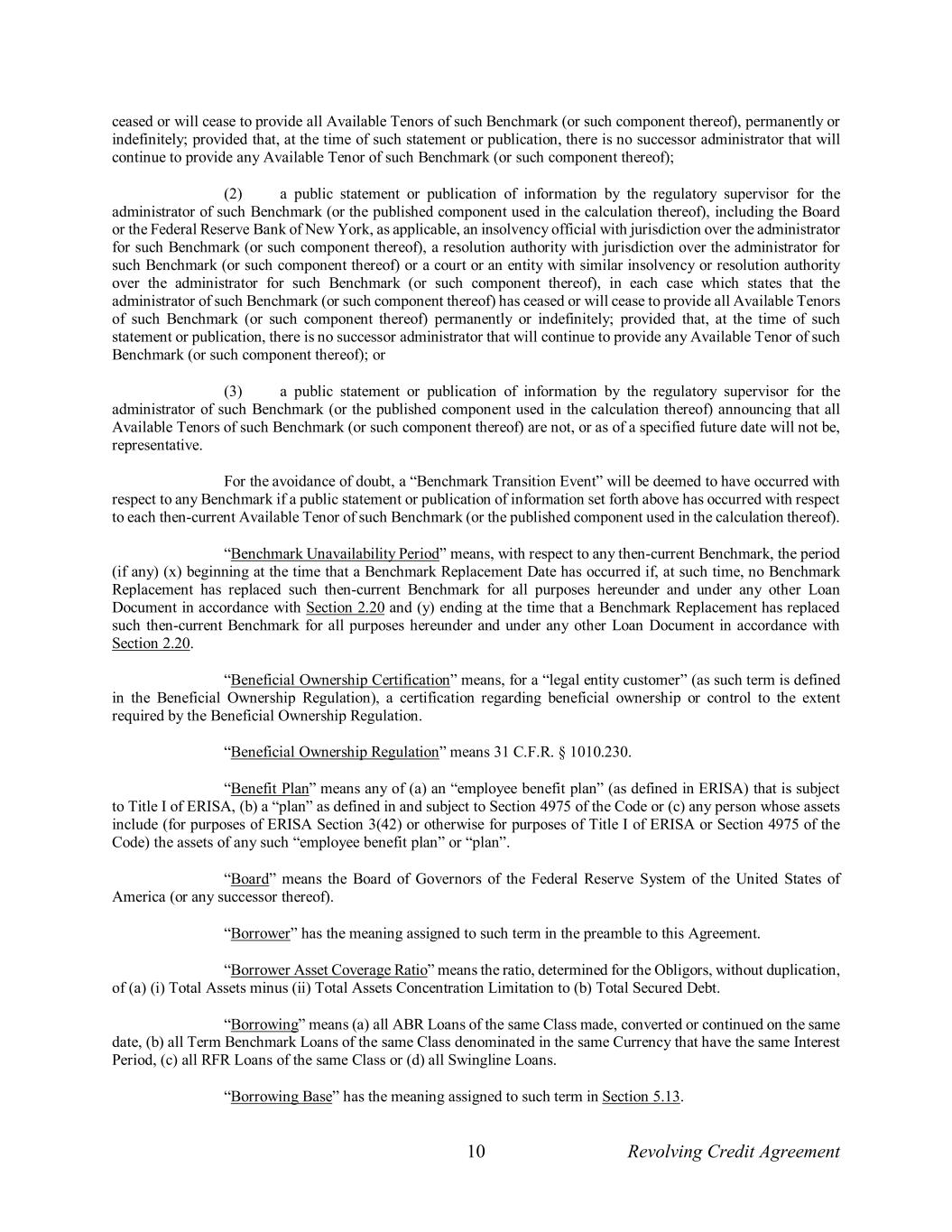 10 Revolving Credit Agreement ceased or will cease to provide all Available Tenors of such Benchmark (or such component thereof), permanently or indefinitely; provided that, at the time of such statement or publication, there is no successor administrator that will continue to provide any Available Tenor of such Benchmark (or such component thereof); (2) a public statement or publication of information by the regulatory supervisor for the administrator of such Benchmark (or the published component used in the calculation thereof), including the Board or the Federal Reserve Bank of New York, as applicable, an insolvency official with jurisdiction over the administrator for such Benchmark (or such component thereof), a resolution authority with jurisdiction over the administrator for such Benchmark (or such component thereof) or a court or an entity with similar insolvency or resolution authority over the administrator for such Benchmark (or such component thereof), in each case which states that the administrator of such Benchmark (or such component thereof) has ceased or will cease to provide all Available Tenors of such Benchmark (or such component thereof) permanently or indefinitely; provided that, at the time of such statement or publication, there is no successor administrator that will continue to provide any Available Tenor of such Benchmark (or such component thereof); or (3) a public statement or publication of information by the regulatory supervisor for the administrator of such Benchmark (or the published component used in the calculation thereof) announcing that all Available Tenors of such Benchmark (or such component thereof) are not, or as of a specified future date will not be, representative. For the avoidance of doubt, a “Benchmark Transition Event” will be deemed to have occurred with respect to any Benchmark if a public statement or publication of information set forth above has occurred with respect to each then-current Available Tenor of such Benchmark (or the published component used in the calculation thereof). “Benchmark Unavailability Period” means, with respect to any then-current Benchmark, the period (if any) (x) beginning at the time that a Benchmark Replacement Date has occurred if, at such time, no Benchmark Replacement has replaced such then-current Benchmark for all purposes hereunder and under any other Loan Document in accordance with Section 2.20 and (y) ending at the time that a Benchmark Replacement has replaced such then-current Benchmark for all purposes hereunder and under any other Loan Document in accordance with Section 2.20. “Beneficial Ownership Certification” means, for a “legal entity customer” (as such term is defined in the Beneficial Ownership Regulation), a certification regarding beneficial ownership or control to the extent required by the Beneficial Ownership Regulation. “Beneficial Ownership Regulation” means 31 C.F.R. § 1010.230. “Benefit Plan” means any of (a) an “employee benefit plan” (as defined in ERISA) that is subject to Title I of ERISA, (b) a “plan” as defined in and subject to Section 4975 of the Code or (c) any person whose assets include (for purposes of ERISA Section 3(42) or otherwise for purposes of Title I of ERISA or Section 4975 of the Code) the assets of any such “employee benefit plan” or “plan”. “Board” means the Board of Governors of the Federal Reserve System of the United States of America (or any successor thereof). “Borrower” has the meaning assigned to such term in the preamble to this Agreement. “Borrower Asset Coverage Ratio” means the ratio, determined for the Obligors, without duplication, of (a) (i) Total Assets minus (ii) Total Assets Concentration Limitation to (b) Total Secured Debt. “Borrowing” means (a) all ABR Loans of the same Class made, converted or continued on the same date, (b) all Term Benchmark Loans of the same Class denominated in the same Currency that have the same Interest Period, (c) all RFR Loans of the same Class or (d) all Swingline Loans. “Borrowing Base” has the meaning assigned to such term in Section 5.13.