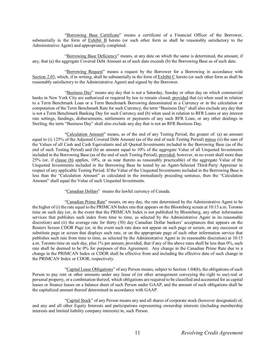 11 Revolving Credit Agreement “Borrowing Base Certificate” means a certificate of a Financial Officer of the Borrower, substantially in the form of Exhibit B hereto (or such other form as shall be reasonably satisfactory to the Administrative Agent) and appropriately completed. “Borrowing Base Deficiency” means, at any date on which the same is determined, the amount, if any, that (a) the aggregate Covered Debt Amount as of such date exceeds (b) the Borrowing Base as of such date. “Borrowing Request” means a request by the Borrower for a Borrowing in accordance with Section 2.03, which, if in writing, shall be substantially in the form of Exhibit C hereto (or such other form as shall be reasonably satisfactory to the Administrative Agent) and signed by the Borrower. “Business Day” means any day that is not a Saturday, Sunday or other day on which commercial banks in New York City are authorized or required by law to remain closed; provided that (a) when used in relation to a Term Benchmark Loan or a Term Benchmark Borrowing denominated in a Currency or in the calculation or computation of the Term Benchmark Rate for such Currency, the term “Business Day” shall also exclude any day that is not a Term Benchmark Banking Day for such Currency and (b) when used in relation to RFR Loans or any interest rate settings, fundings, disbursements, settlements or payments of any such RFR Loan, or any other dealings in Sterling, the term “Business Day” shall also exclude any day that is not an RFR Business Day. “Calculation Amount” means, as of the end of any Testing Period, the greater of: (a) an amount equal to (i) 125% of the Adjusted Covered Debt Amount (as of the end of such Testing Period) minus (ii) the sum of the Values of all Cash and Cash Equivalents and all Quoted Investments included in the Borrowing Base (as of the end of such Testing Period) and (b) an amount equal to 10% of the aggregate Value of all Unquoted Investments included in the Borrowing Base (as of the end of such Testing Period); provided, however, in no event shall more than 25% (or, if clause (b) applies, 10%, or as near thereto as reasonably practicable) of the aggregate Value of the Unquoted Investments included in the Borrowing Base be tested by an Agent-Selected Third-Party Appraiser in respect of any applicable Testing Period. If the Value of the Unquoted Investments included in the Borrowing Base is less than the “Calculation Amount” as calculated in the immediately preceding sentence, then the “Calculation Amount” shall equal the Value of such Unquoted Investments. “Canadian Dollars” means the lawful currency of Canada. “Canadian Prime Rate” means, on any day, the rate determined by the Administrative Agent to be the higher of (i) the rate equal to the PRIMCAN Index rate that appears on the Bloomberg screen at 10:15 a.m. Toronto time on such day (or, in the event that the PRIMCAN Index is not published by Bloomberg, any other information services that publishes such index from time to time, as selected by the Administrative Agent in its reasonable discretion) and (ii) the average rate for thirty (30) day Canadian Dollar bankers’ acceptances that appears on the Reuters Screen CDOR Page (or, in the event such rate does not appear on such page or screen, on any successor or substitute page or screen that displays such rate, or on the appropriate page of such other information service that publishes such rate from time to time, as selected by the Administrative Agent in its reasonable discretion) at 10:15 a.m. Toronto time on such day, plus 1% per annum; provided, that if any of the above rates shall be less than 0%, such rate shall be deemed to be 0% for purposes of this Agreement. Any change in the Canadian Prime Rate due to a change in the PRIMCAN Index or CDOR shall be effective from and including the effective date of such change in the PRIMCAN Index or CDOR, respectively. “Capital Lease Obligations” of any Person means, subject to Section 1.04(b), the obligations of such Person to pay rent or other amounts under any lease of (or other arrangement conveying the right to use) real or personal property, or a combination thereof, which obligations are required to be classified and accounted for as capital leases or finance leases on a balance sheet of such Person under GAAP, and the amount of such obligations shall be the capitalized amount thereof determined in accordance with GAAP. “Capital Stock” of any Person means any and all shares of corporate stock (however designated) of, and any and all other Equity Interests and participations representing ownership interests (including membership interests and limited liability company interests) in, such Person.
