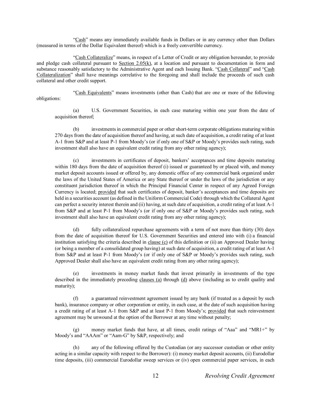 12 Revolving Credit Agreement “Cash” means any immediately available funds in Dollars or in any currency other than Dollars (measured in terms of the Dollar Equivalent thereof) which is a freely convertible currency. “Cash Collateralize” means, in respect of a Letter of Credit or any obligation hereunder, to provide and pledge cash collateral pursuant to Section 2.05(k), at a location and pursuant to documentation in form and substance reasonably satisfactory to the Administrative Agent and each Issuing Bank. “Cash Collateral” and “Cash Collateralization” shall have meanings correlative to the foregoing and shall include the proceeds of such cash collateral and other credit support. “Cash Equivalents” means investments (other than Cash) that are one or more of the following obligations: (a) U.S. Government Securities, in each case maturing within one year from the date of acquisition thereof; (b) investments in commercial paper or other short-term corporate obligations maturing within 270 days from the date of acquisition thereof and having, at such date of acquisition, a credit rating of at least A-1 from S&P and at least P-1 from Moody’s (or if only one of S&P or Moody’s provides such rating, such investment shall also have an equivalent credit rating from any other rating agency); (c) investments in certificates of deposit, bankers’ acceptances and time deposits maturing within 180 days from the date of acquisition thereof (i) issued or guaranteed by or placed with, and money market deposit accounts issued or offered by, any domestic office of any commercial bank organized under the laws of the United States of America or any State thereof or under the laws of the jurisdiction or any constituent jurisdiction thereof in which the Principal Financial Center in respect of any Agreed Foreign Currency is located; provided that such certificates of deposit, banker’s acceptances and time deposits are held in a securities account (as defined in the Uniform Commercial Code) through which the Collateral Agent can perfect a security interest therein and (ii) having, at such date of acquisition, a credit rating of at least A-1 from S&P and at least P-1 from Moody’s (or if only one of S&P or Moody’s provides such rating, such investment shall also have an equivalent credit rating from any other rating agency); (d) fully collateralized repurchase agreements with a term of not more than thirty (30) days from the date of acquisition thereof for U.S. Government Securities and entered into with (i) a financial institution satisfying the criteria described in clause (c) of this definition or (ii) an Approved Dealer having (or being a member of a consolidated group having) at such date of acquisition, a credit rating of at least A-1 from S&P and at least P-1 from Moody’s (or if only one of S&P or Moody’s provides such rating, such Approved Dealer shall also have an equivalent credit rating from any other rating agency); (e) investments in money market funds that invest primarily in investments of the type described in the immediately preceding clauses (a) through (d) above (including as to credit quality and maturity); (f) a guaranteed reinvestment agreement issued by any bank (if treated as a deposit by such bank), insurance company or other corporation or entity, in each case, at the date of such acquisition having a credit rating of at least A-1 from S&P and at least P-1 from Moody’s; provided that such reinvestment agreement may be unwound at the option of the Borrower at any time without penalty; (g) money market funds that have, at all times, credit ratings of “Aaa” and “MR1+” by Moody’s and “AAAm” or “Aam-G” by S&P, respectively; and (h) any of the following offered by the Custodian (or any successor custodian or other entity acting in a similar capacity with respect to the Borrower): (i) money market deposit accounts, (ii) Eurodollar time deposits, (iii) commercial Eurodollar sweep services or (iv) open commercial paper services, in each