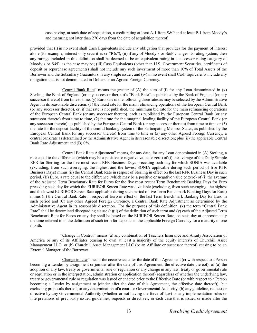 13 Revolving Credit Agreement case having, at such date of acquisition, a credit rating at least A-1 from S&P and at least P-1 from Moody’s and maturing not later than 270 days from the date of acquisition thereof; provided that (i) in no event shall Cash Equivalents include any obligation that provides for the payment of interest alone (for example, interest-only securities or “IOs”); (ii) if any of Moody’s or S&P changes its rating system, then any ratings included in this definition shall be deemed to be an equivalent rating in a successor rating category of Moody’s or S&P, as the case may be; (iii) Cash Equivalents (other than U.S. Government Securities, certificates of deposit or repurchase agreements) shall not include any such investment of more than 10% of Total Assets of the Borrower and the Subsidiary Guarantors in any single issuer; and (iv) in no event shall Cash Equivalents include any obligation that is not denominated in Dollars or an Agreed Foreign Currency. “Central Bank Rate” means the greater of (A) the sum of (i) for any Loan denominated in (x) Sterling, the Bank of England (or any successor thereto)’s “Bank Rate” as published by the Bank of England (or any successor thereto) from time to time, (y) Euro, one of the following three rates as may be selected by the Administrative Agent in its reasonable discretion: (1) the fixed rate for the main refinancing operations of the European Central Bank (or any successor thereto), or, if that rate is not published, the minimum bid rate for the main refinancing operations of the European Central Bank (or any successor thereto), each as published by the European Central Bank (or any successor thereto) from time to time, (2) the rate for the marginal lending facility of the European Central Bank (or any successor thereto), as published by the European Central Bank (or any successor thereto) from time to time or (3) the rate for the deposit facility of the central banking system of the Participating Member States, as published by the European Central Bank (or any successor thereto) from time to time or (z) any other Agreed Foreign Currency, a central bank rate as determined by the Administrative Agent in its reasonable discretion; plus (ii) the applicable Central Bank Rate Adjustment and (B) 0%. “Central Bank Rate Adjustment” means, for any date, for any Loan denominated in (A) Sterling, a rate equal to the difference (which may be a positive or negative value or zero) of (i) the average of the Daily Simple RFR for Sterling for the five most recent RFR Business Days preceding such day for which SONIA was available (excluding, from such averaging, the highest and the lowest SONIA applicable during such period of five RFR Business Days) minus (ii) the Central Bank Rate in respect of Sterling in effect on the last RFR Business Day in such period, (B) Euro, a rate equal to the difference (which may be a positive or negative value or zero) of (i) the average of the Adjusted Term Benchmark Rate for Euros for the five most recent Term Benchmark Banking Days for Euro preceding such day for which the EURIBOR Screen Rate was available (excluding, from such averaging, the highest and the lowest EURIBOR Screen Rate applicable during such period of five Term Benchmark Banking Days for Euro) minus (ii) the Central Bank Rate in respect of Euro in effect on the last Term Benchmark Banking Day for Euro in such period and (C) any other Agreed Foreign Currency, a Central Bank Rate Adjustment as determined by the Administrative Agent in its reasonable discretion. For the purposes of this definition, (x) the term “Central Bank Rate” shall be determined disregarding clause (a)(ii) of the definition of such term and (y) each of the Adjusted Term Benchmark Rate for Euros on any day shall be based on the EURIBOR Screen Rate, on such day at approximately the time referred to in the definition of such term for deposits in the applicable Foreign Currency for a maturity of one month. “Change in Control” means (a) any combination of Teachers Insurance and Anuity Association of America or any of its Affiliates ceasing to own at least a majority of the equity interests of Churchill Asset Management LLC; or (b) Churchill Asset Management LLC (or an Affiliate or successor thereof) ceasing to be an External Manager of the Borrower. “Change in Law” means the occurrence, after the date of this Agreement (or with respect to a Person becoming a Lender by assignment or joinder after the date of this Agreement, the effective date thereof), of (a) the adoption of any law, treaty or governmental rule or regulation or any change in any law, treaty or governmental rule or regulation or in the interpretation, administration or application thereof (regardless of whether the underlying law, treaty or governmental rule or regulation was issued or enacted prior to the Effective Date (or with respect to a Person becoming a Lender by assignment or joinder after the date of this Agreement, the effective date thereof)), but excluding proposals thereof, or any determination of a court or Governmental Authority, (b) any guideline, request or directive by any Governmental Authority (whether or not having the force of law) or any implementation rules or interpretations of previously issued guidelines, requests or directives, in each case that is issued or made after the