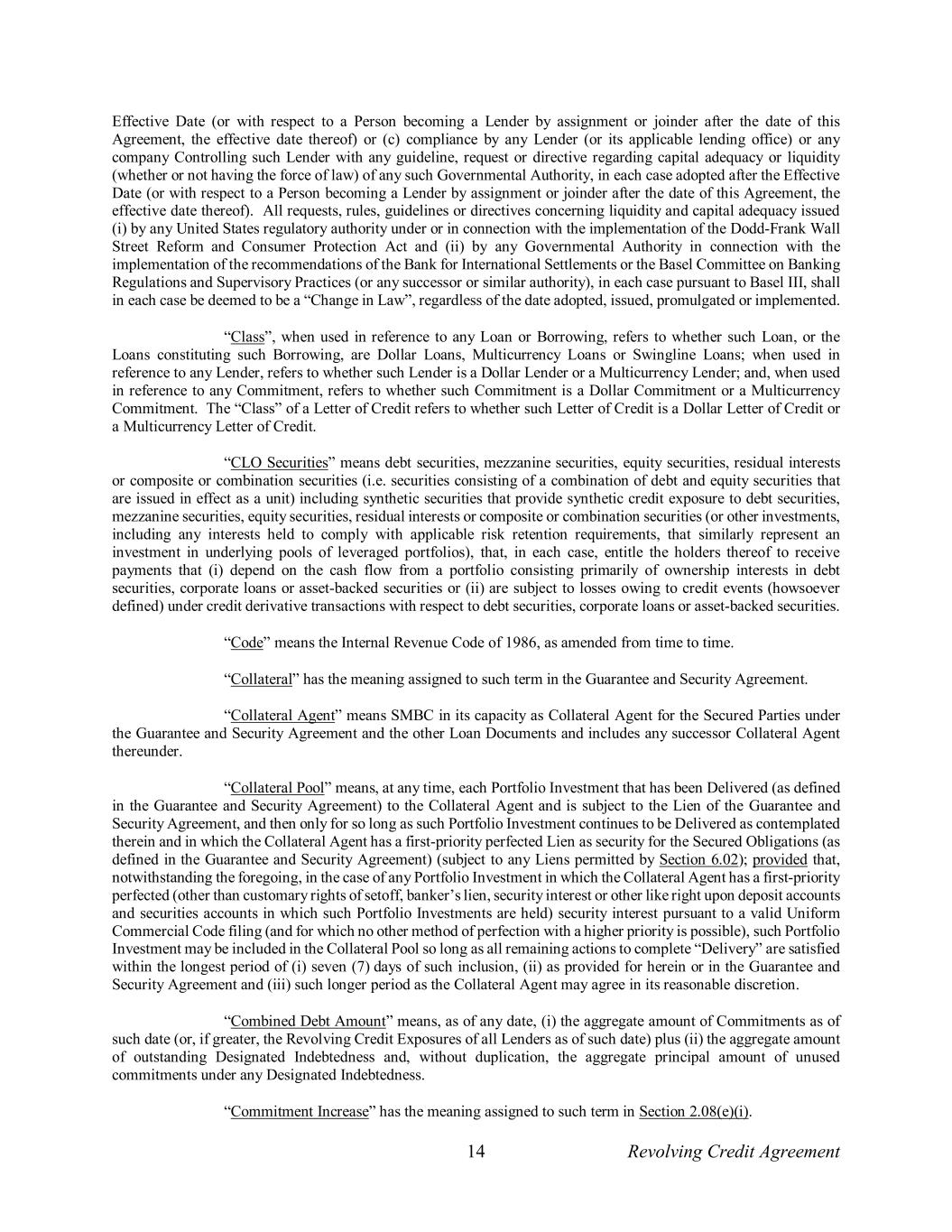 14 Revolving Credit Agreement Effective Date (or with respect to a Person becoming a Lender by assignment or joinder after the date of this Agreement, the effective date thereof) or (c) compliance by any Lender (or its applicable lending office) or any company Controlling such Lender with any guideline, request or directive regarding capital adequacy or liquidity (whether or not having the force of law) of any such Governmental Authority, in each case adopted after the Effective Date (or with respect to a Person becoming a Lender by assignment or joinder after the date of this Agreement, the effective date thereof). All requests, rules, guidelines or directives concerning liquidity and capital adequacy issued (i) by any United States regulatory authority under or in connection with the implementation of the Dodd-Frank Wall Street Reform and Consumer Protection Act and (ii) by any Governmental Authority in connection with the implementation of the recommendations of the Bank for International Settlements or the Basel Committee on Banking Regulations and Supervisory Practices (or any successor or similar authority), in each case pursuant to Basel III, shall in each case be deemed to be a “Change in Law”, regardless of the date adopted, issued, promulgated or implemented. “Class”, when used in reference to any Loan or Borrowing, refers to whether such Loan, or the Loans constituting such Borrowing, are Dollar Loans, Multicurrency Loans or Swingline Loans; when used in reference to any Lender, refers to whether such Lender is a Dollar Lender or a Multicurrency Lender; and, when used in reference to any Commitment, refers to whether such Commitment is a Dollar Commitment or a Multicurrency Commitment. The “Class” of a Letter of Credit refers to whether such Letter of Credit is a Dollar Letter of Credit or a Multicurrency Letter of Credit. “CLO Securities” means debt securities, mezzanine securities, equity securities, residual interests or composite or combination securities (i.e. securities consisting of a combination of debt and equity securities that are issued in effect as a unit) including synthetic securities that provide synthetic credit exposure to debt securities, mezzanine securities, equity securities, residual interests or composite or combination securities (or other investments, including any interests held to comply with applicable risk retention requirements, that similarly represent an investment in underlying pools of leveraged portfolios), that, in each case, entitle the holders thereof to receive payments that (i) depend on the cash flow from a portfolio consisting primarily of ownership interests in debt securities, corporate loans or asset-backed securities or (ii) are subject to losses owing to credit events (howsoever defined) under credit derivative transactions with respect to debt securities, corporate loans or asset-backed securities. “Code” means the Internal Revenue Code of 1986, as amended from time to time. “Collateral” has the meaning assigned to such term in the Guarantee and Security Agreement. “Collateral Agent” means SMBC in its capacity as Collateral Agent for the Secured Parties under the Guarantee and Security Agreement and the other Loan Documents and includes any successor Collateral Agent thereunder. “Collateral Pool” means, at any time, each Portfolio Investment that has been Delivered (as defined in the Guarantee and Security Agreement) to the Collateral Agent and is subject to the Lien of the Guarantee and Security Agreement, and then only for so long as such Portfolio Investment continues to be Delivered as contemplated therein and in which the Collateral Agent has a first-priority perfected Lien as security for the Secured Obligations (as defined in the Guarantee and Security Agreement) (subject to any Liens permitted by Section 6.02); provided that, notwithstanding the foregoing, in the case of any Portfolio Investment in which the Collateral Agent has a first-priority perfected (other than customary rights of setoff, banker’s lien, security interest or other like right upon deposit accounts and securities accounts in which such Portfolio Investments are held) security interest pursuant to a valid Uniform Commercial Code filing (and for which no other method of perfection with a higher priority is possible), such Portfolio Investment may be included in the Collateral Pool so long as all remaining actions to complete “Delivery” are satisfied within the longest period of (i) seven (7) days of such inclusion, (ii) as provided for herein or in the Guarantee and Security Agreement and (iii) such longer period as the Collateral Agent may agree in its reasonable discretion. “Combined Debt Amount” means, as of any date, (i) the aggregate amount of Commitments as of such date (or, if greater, the Revolving Credit Exposures of all Lenders as of such date) plus (ii) the aggregate amount of outstanding Designated Indebtedness and, without duplication, the aggregate principal amount of unused commitments under any Designated Indebtedness. “Commitment Increase” has the meaning assigned to such term in Section 2.08(e)(i).