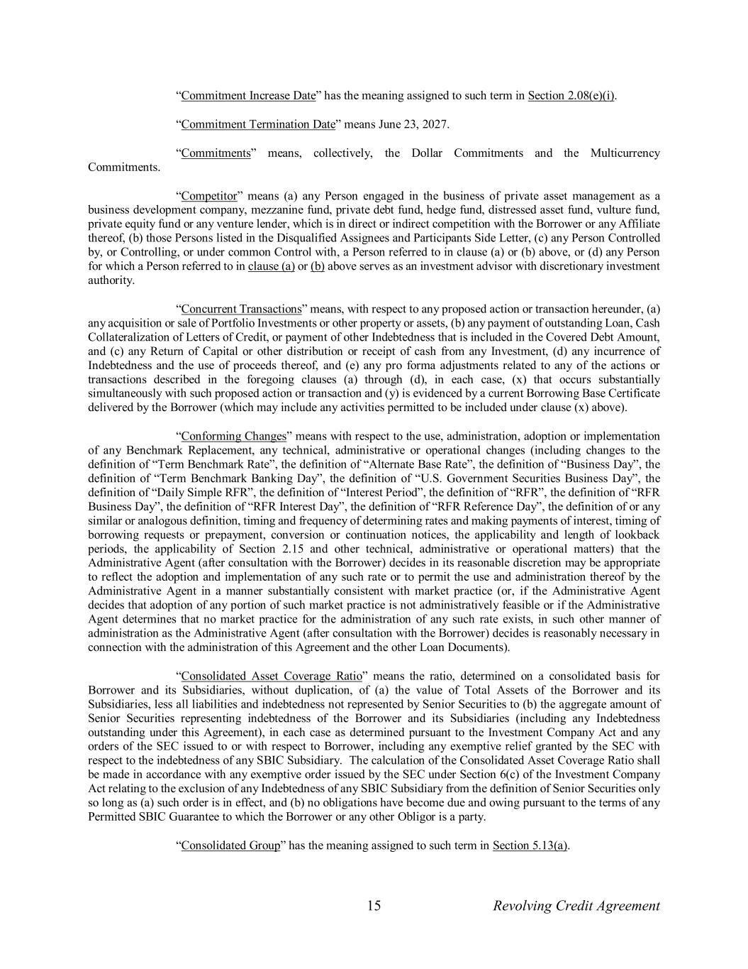 15 Revolving Credit Agreement “Commitment Increase Date” has the meaning assigned to such term in Section 2.08(e)(i). “Commitment Termination Date” means June 23, 2027. “Commitments” means, collectively, the Dollar Commitments and the Multicurrency Commitments. “Competitor” means (a) any Person engaged in the business of private asset management as a business development company, mezzanine fund, private debt fund, hedge fund, distressed asset fund, vulture fund, private equity fund or any venture lender, which is in direct or indirect competition with the Borrower or any Affiliate thereof, (b) those Persons listed in the Disqualified Assignees and Participants Side Letter, (c) any Person Controlled by, or Controlling, or under common Control with, a Person referred to in clause (a) or (b) above, or (d) any Person for which a Person referred to in clause (a) or (b) above serves as an investment advisor with discretionary investment authority. “Concurrent Transactions” means, with respect to any proposed action or transaction hereunder, (a) any acquisition or sale of Portfolio Investments or other property or assets, (b) any payment of outstanding Loan, Cash Collateralization of Letters of Credit, or payment of other Indebtedness that is included in the Covered Debt Amount, and (c) any Return of Capital or other distribution or receipt of cash from any Investment, (d) any incurrence of Indebtedness and the use of proceeds thereof, and (e) any pro forma adjustments related to any of the actions or transactions described in the foregoing clauses (a) through (d), in each case, (x) that occurs substantially simultaneously with such proposed action or transaction and (y) is evidenced by a current Borrowing Base Certificate delivered by the Borrower (which may include any activities permitted to be included under clause (x) above). “Conforming Changes” means with respect to the use, administration, adoption or implementation of any Benchmark Replacement, any technical, administrative or operational changes (including changes to the definition of “Term Benchmark Rate”, the definition of “Alternate Base Rate”, the definition of “Business Day”, the definition of “Term Benchmark Banking Day”, the definition of “U.S. Government Securities Business Day”, the definition of “Daily Simple RFR”, the definition of “Interest Period”, the definition of “RFR”, the definition of “RFR Business Day”, the definition of “RFR Interest Day”, the definition of “RFR Reference Day”, the definition of or any similar or analogous definition, timing and frequency of determining rates and making payments of interest, timing of borrowing requests or prepayment, conversion or continuation notices, the applicability and length of lookback periods, the applicability of Section 2.15 and other technical, administrative or operational matters) that the Administrative Agent (after consultation with the Borrower) decides in its reasonable discretion may be appropriate to reflect the adoption and implementation of any such rate or to permit the use and administration thereof by the Administrative Agent in a manner substantially consistent with market practice (or, if the Administrative Agent decides that adoption of any portion of such market practice is not administratively feasible or if the Administrative Agent determines that no market practice for the administration of any such rate exists, in such other manner of administration as the Administrative Agent (after consultation with the Borrower) decides is reasonably necessary in connection with the administration of this Agreement and the other Loan Documents). “Consolidated Asset Coverage Ratio” means the ratio, determined on a consolidated basis for Borrower and its Subsidiaries, without duplication, of (a) the value of Total Assets of the Borrower and its Subsidiaries, less all liabilities and indebtedness not represented by Senior Securities to (b) the aggregate amount of Senior Securities representing indebtedness of the Borrower and its Subsidiaries (including any Indebtedness outstanding under this Agreement), in each case as determined pursuant to the Investment Company Act and any orders of the SEC issued to or with respect to Borrower, including any exemptive relief granted by the SEC with respect to the indebtedness of any SBIC Subsidiary. The calculation of the Consolidated Asset Coverage Ratio shall be made in accordance with any exemptive order issued by the SEC under Section 6(c) of the Investment Company Act relating to the exclusion of any Indebtedness of any SBIC Subsidiary from the definition of Senior Securities only so long as (a) such order is in effect, and (b) no obligations have become due and owing pursuant to the terms of any Permitted SBIC Guarantee to which the Borrower or any other Obligor is a party. “Consolidated Group” has the meaning assigned to such term in Section 5.13(a).
