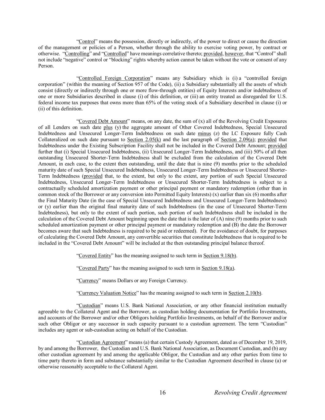 16 Revolving Credit Agreement “Control” means the possession, directly or indirectly, of the power to direct or cause the direction of the management or policies of a Person, whether through the ability to exercise voting power, by contract or otherwise. “Controlling” and “Controlled” have meanings correlative thereto; provided, however, that “Control” shall not include “negative” control or “blocking” rights whereby action cannot be taken without the vote or consent of any Person. “Controlled Foreign Corporation” means any Subsidiary which is (i) a “controlled foreign corporation” (within the meaning of Section 957 of the Code), (ii) a Subsidiary substantially all the assets of which consist (directly or indirectly through one or more flow-through entities) of Equity Interests and/or indebtedness of one or more Subsidiaries described in clause (i) of this definition, or (iii) an entity treated as disregarded for U.S. federal income tax purposes that owns more than 65% of the voting stock of a Subsidiary described in clause (i) or (ii) of this definition. “Covered Debt Amount” means, on any date, the sum of (x) all of the Revolving Credit Exposures of all Lenders on such date plus (y) the aggregate amount of Other Covered Indebtedness, Special Unsecured Indebtedness and Unsecured Longer-Term Indebtedness on such date minus (z) the LC Exposure fully Cash Collateralized on such date pursuant to Section 2.05(k) and the last paragraph of Section 2.09(a); provided that Indebtedness under the Existing Subscription Facility shall not be included in the Covered Debt Amount; provided further that (i) Special Unsecured Indebtedness, (ii) Unsecured Longer-Term Indebtedness, and (iii) 50% of all then outstanding Unsecured Shorter-Term Indebtedness shall be excluded from the calculation of the Covered Debt Amount, in each case, to the extent then outstanding, until the date that is nine (9) months prior to the scheduled maturity date of such Special Unsecured Indebtedness, Unsecured Longer-Term Indebtedness or Unsecured Shorter- Term Indebtedness (provided that, to the extent, but only to the extent, any portion of such Special Unsecured Indebtedness, Unsecured Longer-Term Indebtedness or Unsecured Shorter-Term Indebtedness is subject to a contractually scheduled amortization payment or other principal payment or mandatory redemption (other than in common stock of the Borrower or any conversion into Permitted Equity Interests) (x) earlier than six (6) months after the Final Maturity Date (in the case of Special Unsecured Indebtedness and Unsecured Longer-Term Indebtedness) or (y) earlier than the original final maturity date of such Indebtedness (in the case of Unsecured Shorter-Term Indebtedness), but only to the extent of such portion, such portion of such Indebtedness shall be included in the calculation of the Covered Debt Amount beginning upon the date that is the later of (A) nine (9) months prior to such scheduled amortization payment or other principal payment or mandatory redemption and (B) the date the Borrower becomes aware that such Indebtedness is required to be paid or redeemed). For the avoidance of doubt, for purposes of calculating the Covered Debt Amount, any convertible securities that constitute Indebtedness that is required to be included in the “Covered Debt Amount” will be included at the then outstanding principal balance thereof. “Covered Entity” has the meaning assigned to such term in Section 9.18(b). “Covered Party” has the meaning assigned to such term in Section 9.18(a). “Currency” means Dollars or any Foreign Currency. “Currency Valuation Notice” has the meaning assigned to such term in Section 2.10(b). “Custodian” means U.S. Bank National Association, or any other financial institution mutually agreeable to the Collateral Agent and the Borrower, as custodian holding documentation for Portfolio Investments, and accounts of the Borrower and/or other Obligors holding Portfolio Investments, on behalf of the Borrower and/or such other Obligor or any successor in such capacity pursuant to a custodian agreement. The term “Custodian” includes any agent or sub-custodian acting on behalf of the Custodian. “Custodian Agreement” means (a) that certain Custody Agreement, dated as of December 19, 2019, by and among the Borrower, the Custodian and U.S. Bank National Association, as Document Custodian, and (b) any other custodian agreement by and among the applicable Obligor, the Custodian and any other parties from time to time party thereto in form and substance substantially similar to the Custodian Agreement described in clause (a) or otherwise reasonably acceptable to the Collateral Agent.
