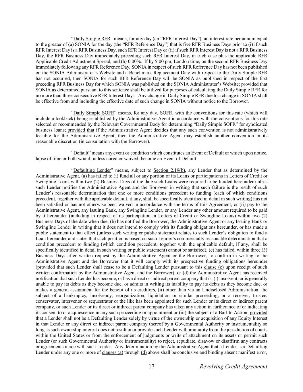 17 Revolving Credit Agreement “Daily Simple RFR” means, for any day (an “RFR Interest Day”), an interest rate per annum equal to the greater of (a) SONIA for the day (the “RFR Reference Day”) that is five RFR Business Days prior to (i) if such RFR Interest Day is a RFR Business Day, such RFR Interest Day or (ii) if such RFR Interest Day is not a RFR Business Day, the RFR Business Day immediately preceding such RFR Interest Day, in each case plus the applicable RFR Applicable Credit Adjustment Spread, and (b) 0.00%. If by 5:00 pm, London time, on the second RFR Business Day immediately following any RFR Reference Day, SONIA in respect of such RFR Reference Day has not been published on the SONIA Administrator’s Website and a Benchmark Replacement Date with respect to the Daily Simple RFR has not occurred, then SONIA for such RFR Reference Day will be SONIA as published in respect of the first preceding RFR Business Day for which SONIA was published on the SONIA Administrator’s Website; provided that SONIA as determined pursuant to this sentence shall be utilized for purposes of calculating the Daily Simple RFR for no more than three consecutive RFR Interest Days. Any change in Daily Simple RFR due to a change in SONIA shall be effective from and including the effective date of such change in SONIA without notice to the Borrower. “Daily Simple SOFR” means, for any day, SOFR, with the conventions for this rate (which will include a lookback) being established by the Administrative Agent in accordance with the conventions for this rate selected or recommended by the Relevant Governmental Body for determining “Daily Simple SOFR” for syndicated business loans; provided that if the Administrative Agent decides that any such convention is not administratively feasible for the Administrative Agent, then the Administrative Agent may establish another convention in its reasonable discretion (in consultation with the Borrower). “Default” means any event or condition which constitutes an Event of Default or which upon notice, lapse of time or both would, unless cured or waived, become an Event of Default. “Defaulting Lender” means, subject to Section 2.19(b), any Lender that as determined by the Administrative Agent, (a) has failed to (i) fund all or any portion of its Loans or participations in Letters of Credit or Swingline Loans within two (2) Business Days of the date such Loans were required to be funded hereunder unless such Lender notifies the Administrative Agent and the Borrower in writing that such failure is the result of such Lender’s reasonable determination that one or more conditions precedent to funding (each of which conditions precedent, together with the applicable default, if any, shall be specifically identified in detail in such writing) has not been satisfied or has not otherwise been waived in accordance with the terms of this Agreement, or (ii) pay to the Administrative Agent, any Issuing Bank, any Swingline Lender, or any Lender any other amount required to be paid by it hereunder (including in respect of its participation in Letters of Credit or Swingline Loans) within two (2) Business Days of the date when due, (b) has notified the Borrower, the Administrative Agent or any Issuing Bank or Swingline Lender in writing that it does not intend to comply with its funding obligations hereunder, or has made a public statement to that effect (unless such writing or public statement relates to such Lender’s obligation to fund a Loan hereunder and states that such position is based on such Lender’s commercially reasonable determination that a condition precedent to funding (which condition precedent, together with the applicable default, if any, shall be specifically identified in detail in such writing or public statement) cannot be satisfied), (c) has failed, within three (3) Business Days after written request by the Administrative Agent or the Borrower, to confirm in writing to the Administrative Agent and the Borrower that it will comply with its prospective funding obligations hereunder (provided that such Lender shall cease to be a Defaulting Lender pursuant to this clause (c) upon receipt of such written confirmation by the Administrative Agent and the Borrower), or (d) the Administrative Agent has received notification that such Lender has become, or has a direct or indirect parent company that is, (i) insolvent, or is generally unable to pay its debts as they become due, or admits in writing its inability to pay its debts as they become due, or makes a general assignment for the benefit of its creditors, (ii) other than via an Undisclosed Administration, the subject of a bankruptcy, insolvency, reorganization, liquidation or similar proceeding, or a receiver, trustee, conservator, intervenor or sequestrator or the like has been appointed for such Lender or its direct or indirect parent company, or such Lender or its direct or indirect parent company has taken any action in furtherance of or indicating its consent to or acquiescence in any such proceeding or appointment or (iii) the subject of a Bail-In Action; provided that a Lender shall not be a Defaulting Lender solely by virtue of the ownership or acquisition of any Equity Interest in that Lender or any direct or indirect parent company thereof by a Governmental Authority or instrumentality so long as such ownership interest does not result in or provide such Lender with immunity from the jurisdiction of courts within the United States or from the enforcement of judgments or writs of attachment on its assets or permit such Lender (or such Governmental Authority or instrumentality) to reject, repudiate, disavow or disaffirm any contracts or agreements made with such Lender. Any determination by the Administrative Agent that a Lender is a Defaulting Lender under any one or more of clauses (a) through (d) above shall be conclusive and binding absent manifest error,