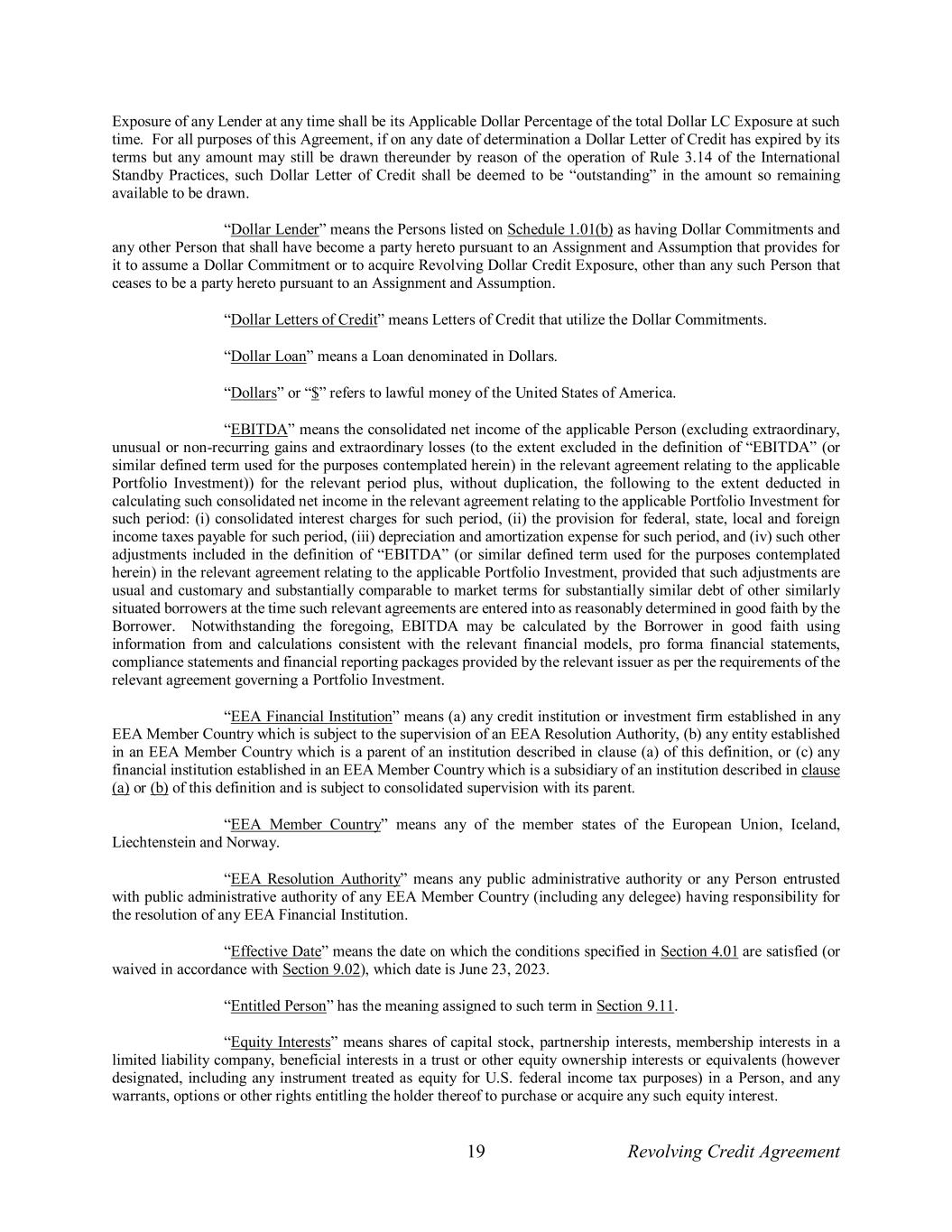 19 Revolving Credit Agreement Exposure of any Lender at any time shall be its Applicable Dollar Percentage of the total Dollar LC Exposure at such time. For all purposes of this Agreement, if on any date of determination a Dollar Letter of Credit has expired by its terms but any amount may still be drawn thereunder by reason of the operation of Rule 3.14 of the International Standby Practices, such Dollar Letter of Credit shall be deemed to be “outstanding” in the amount so remaining available to be drawn. “Dollar Lender” means the Persons listed on Schedule 1.01(b) as having Dollar Commitments and any other Person that shall have become a party hereto pursuant to an Assignment and Assumption that provides for it to assume a Dollar Commitment or to acquire Revolving Dollar Credit Exposure, other than any such Person that ceases to be a party hereto pursuant to an Assignment and Assumption. “Dollar Letters of Credit” means Letters of Credit that utilize the Dollar Commitments. “Dollar Loan” means a Loan denominated in Dollars. “Dollars” or “$” refers to lawful money of the United States of America. “EBITDA” means the consolidated net income of the applicable Person (excluding extraordinary, unusual or non-recurring gains and extraordinary losses (to the extent excluded in the definition of “EBITDA” (or similar defined term used for the purposes contemplated herein) in the relevant agreement relating to the applicable Portfolio Investment)) for the relevant period plus, without duplication, the following to the extent deducted in calculating such consolidated net income in the relevant agreement relating to the applicable Portfolio Investment for such period: (i) consolidated interest charges for such period, (ii) the provision for federal, state, local and foreign income taxes payable for such period, (iii) depreciation and amortization expense for such period, and (iv) such other adjustments included in the definition of “EBITDA” (or similar defined term used for the purposes contemplated herein) in the relevant agreement relating to the applicable Portfolio Investment, provided that such adjustments are usual and customary and substantially comparable to market terms for substantially similar debt of other similarly situated borrowers at the time such relevant agreements are entered into as reasonably determined in good faith by the Borrower. Notwithstanding the foregoing, EBITDA may be calculated by the Borrower in good faith using information from and calculations consistent with the relevant financial models, pro forma financial statements, compliance statements and financial reporting packages provided by the relevant issuer as per the requirements of the relevant agreement governing a Portfolio Investment. “EEA Financial Institution” means (a) any credit institution or investment firm established in any EEA Member Country which is subject to the supervision of an EEA Resolution Authority, (b) any entity established in an EEA Member Country which is a parent of an institution described in clause (a) of this definition, or (c) any financial institution established in an EEA Member Country which is a subsidiary of an institution described in clause (a) or (b) of this definition and is subject to consolidated supervision with its parent. “EEA Member Country” means any of the member states of the European Union, Iceland, Liechtenstein and Norway. “EEA Resolution Authority” means any public administrative authority or any Person entrusted with public administrative authority of any EEA Member Country (including any delegee) having responsibility for the resolution of any EEA Financial Institution. “Effective Date” means the date on which the conditions specified in Section 4.01 are satisfied (or waived in accordance with Section 9.02), which date is June 23, 2023. “Entitled Person” has the meaning assigned to such term in Section 9.11. “Equity Interests” means shares of capital stock, partnership interests, membership interests in a limited liability company, beneficial interests in a trust or other equity ownership interests or equivalents (however designated, including any instrument treated as equity for U.S. federal income tax purposes) in a Person, and any warrants, options or other rights entitling the holder thereof to purchase or acquire any such equity interest.