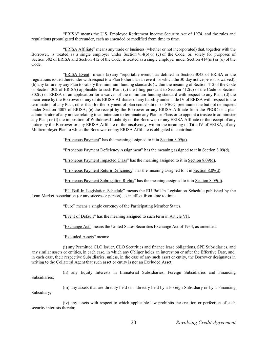20 Revolving Credit Agreement “ERISA” means the U.S. Employee Retirement Income Security Act of 1974, and the rules and regulations promulgated thereunder, each as amended or modified from time to time. “ERISA Affiliate” means any trade or business (whether or not incorporated) that, together with the Borrower, is treated as a single employer under Section 414(b) or (c) of the Code, or, solely for purposes of Section 302 of ERISA and Section 412 of the Code, is treated as a single employer under Section 414(m) or (o) of the Code. “ERISA Event” means (a) any “reportable event”, as defined in Section 4043 of ERISA or the regulations issued thereunder with respect to a Plan (other than an event for which the 30-day notice period is waived); (b) any failure by any Plan to satisfy the minimum funding standards (within the meaning of Section 412 of the Code or Section 302 of ERISA) applicable to such Plan; (c) the filing pursuant to Section 412(c) of the Code or Section 302(c) of ERISA of an application for a waiver of the minimum funding standard with respect to any Plan; (d) the incurrence by the Borrower or any of its ERISA Affiliates of any liability under Title IV of ERISA with respect to the termination of any Plan, other than for the payment of plan contributions or PBGC premiums due but not delinquent under Section 4007 of ERISA; (e) the receipt by the Borrower or any ERISA Affiliate from the PBGC or a plan administrator of any notice relating to an intention to terminate any Plan or Plans or to appoint a trustee to administer any Plan; or (f) the imposition of Withdrawal Liability on the Borrower or any ERISA Affiliate or the receipt of any notice by the Borrower or any ERISA Affiliate of the insolvency, within the meaning of Title IV of ERISA, of any Multiemployer Plan to which the Borrower or any ERISA Affiliate is obligated to contribute. “Erroneous Payment” has the meaning assigned to it in Section 8.09(a). “Erroneous Payment Deficiency Assignment” has the meaning assigned to it in Section 8.09(d). “Erroneous Payment Impacted Class” has the meaning assigned to it in Section 8.09(d). “Erroneous Payment Return Deficiency” has the meaning assigned to it in Section 8.09(d). “Erroneous Payment Subrogation Rights” has the meaning assigned to it in Section 8.09(d). “EU Bail-In Legislation Schedule” means the EU Bail-In Legislation Schedule published by the Loan Market Association (or any successor person), as in effect from time to time. “Euro” means a single currency of the Participating Member States. “Event of Default” has the meaning assigned to such term in Article VII. “Exchange Act” means the United States Securities Exchange Act of 1934, as amended. “Excluded Assets” means: (i) any Permitted CLO Issuer, CLO Securities and finance lease obligations, SPE Subsidiaries, and any similar assets or entities, in each case, in which any Obligor holds an interest on or after the Effective Date, and, in each case, their respective Subsidiaries, unless, in the case of any such asset or entity, the Borrower designates in writing to the Collateral Agent that such asset or entity is not an Excluded Asset; (ii) any Equity Interests in Immaterial Subsidiaries, Foreign Subsidiaries and Financing Subsidiaries; (iii) any assets that are directly held or indirectly held by a Foreign Subsidiary or by a Financing Subsidiary; (iv) any assets with respect to which applicable law prohibits the creation or perfection of such security interests therein;